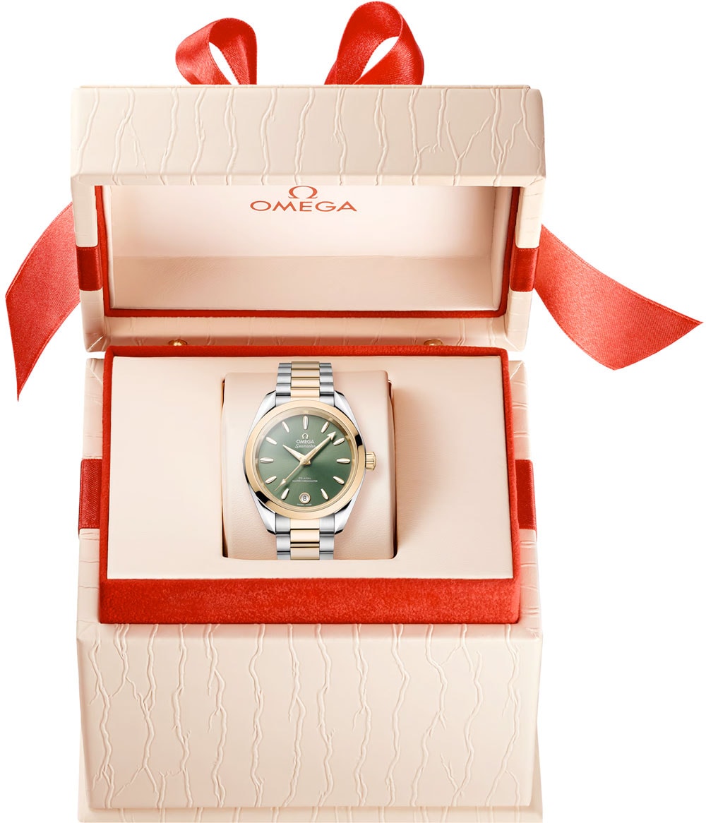It has a sun-brushed PVD colour-treated green dial with 18K Moonshine™ Gold OMEGA logo, and date window at 6 o'clock. The hands and boat hull-shaped hour markers, also in 18K Moonshine™ Gold, are filled white Super-LumiNova which emits a blue glow.