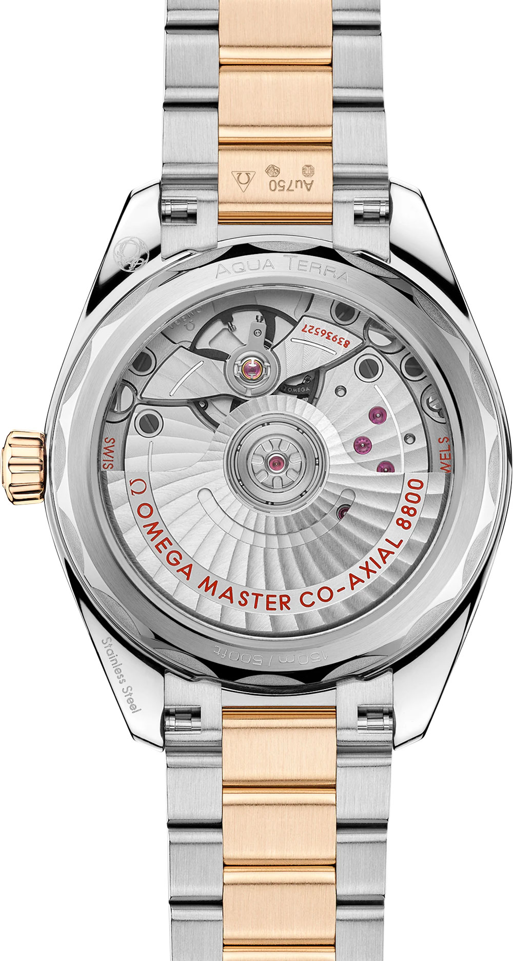The Seamaster Aqua Terra is a superb tribute to OMEGA’s rich maritime heritage. This 34 mm model has a symmetrical stainless-steel and 18K Moonshine™ Gold case with a screw-in caseback featuring a wave-edged design.