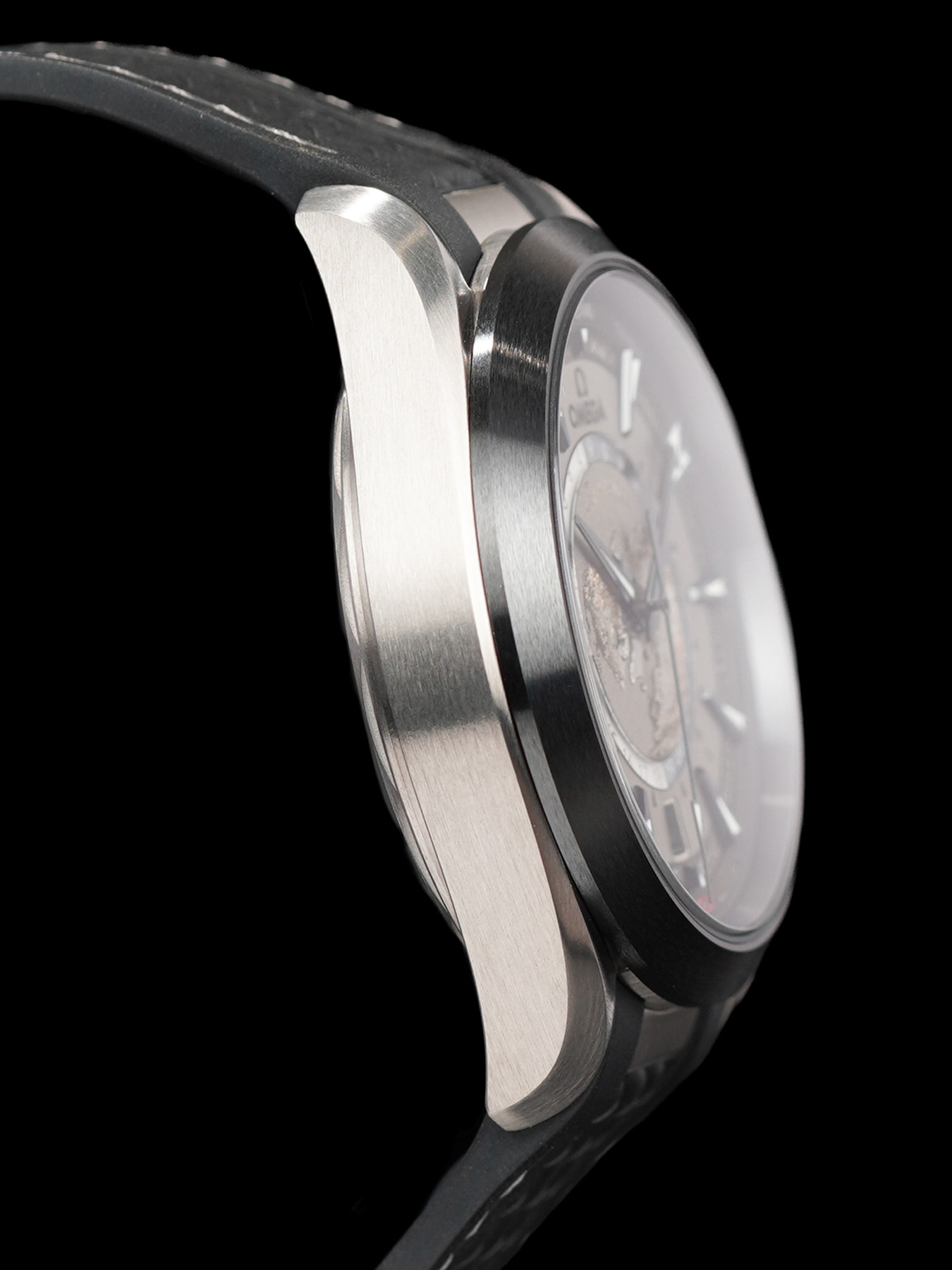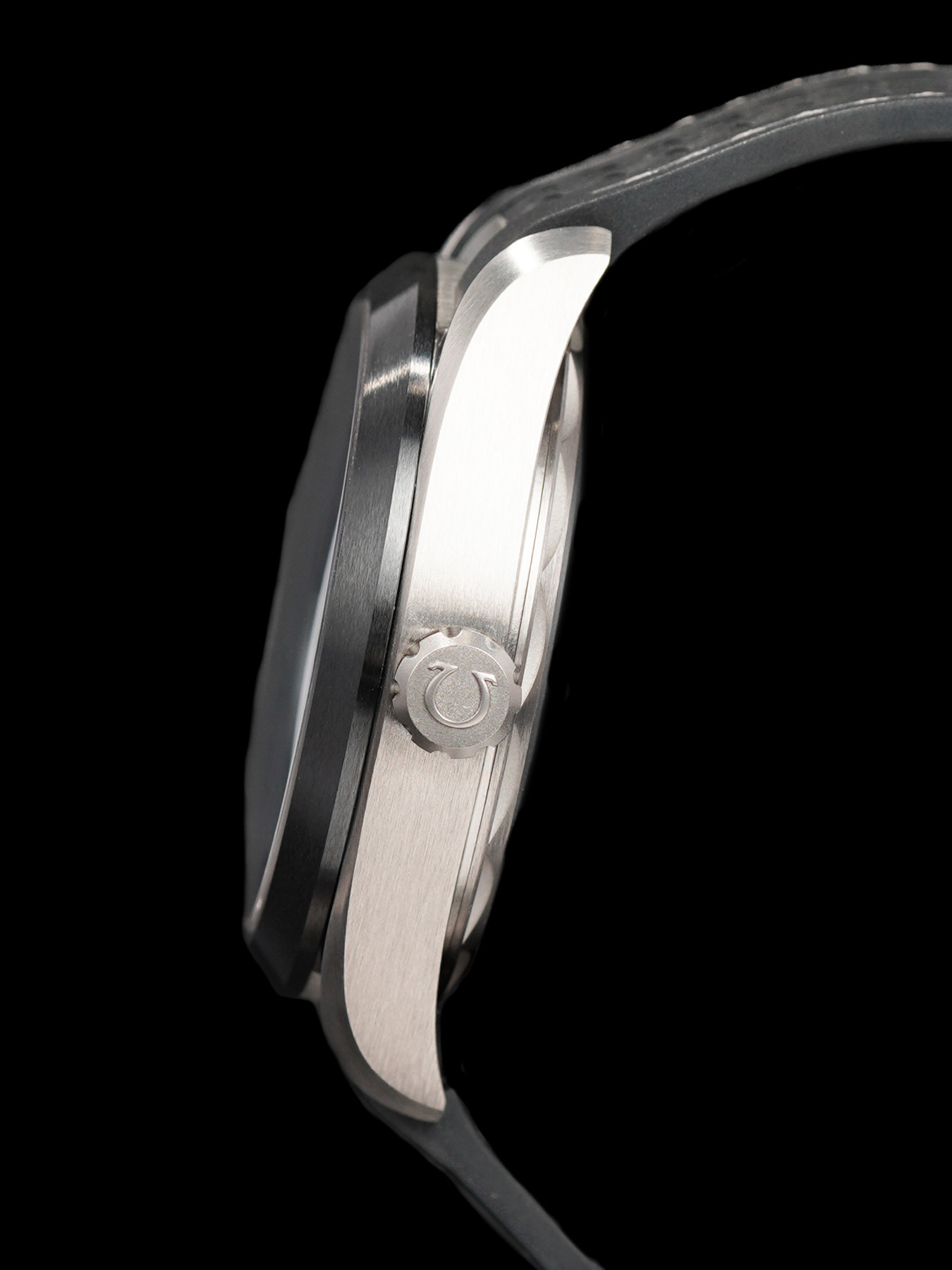 This watch features a 43mm titanium case on rubber strap. This watch also sports a black dial. Powered by a mechanical automatic movement. Water resistance up to 150 meters.
