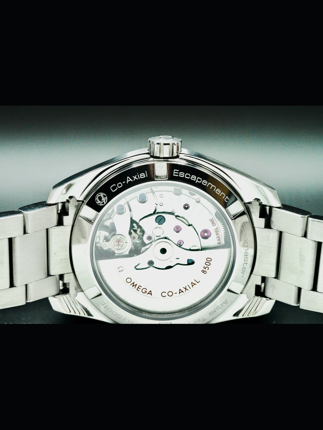 This certified chronometer is powered by the OMEGA Co-Axial calibre 8500 which can be seen through the transparent caseback.