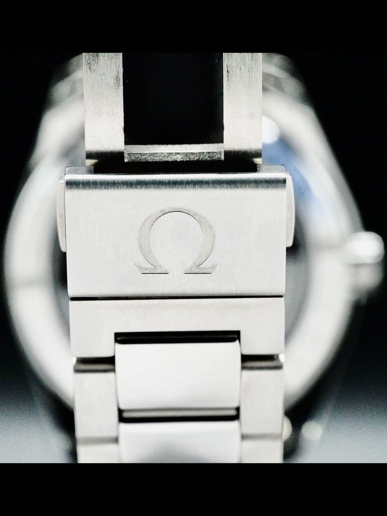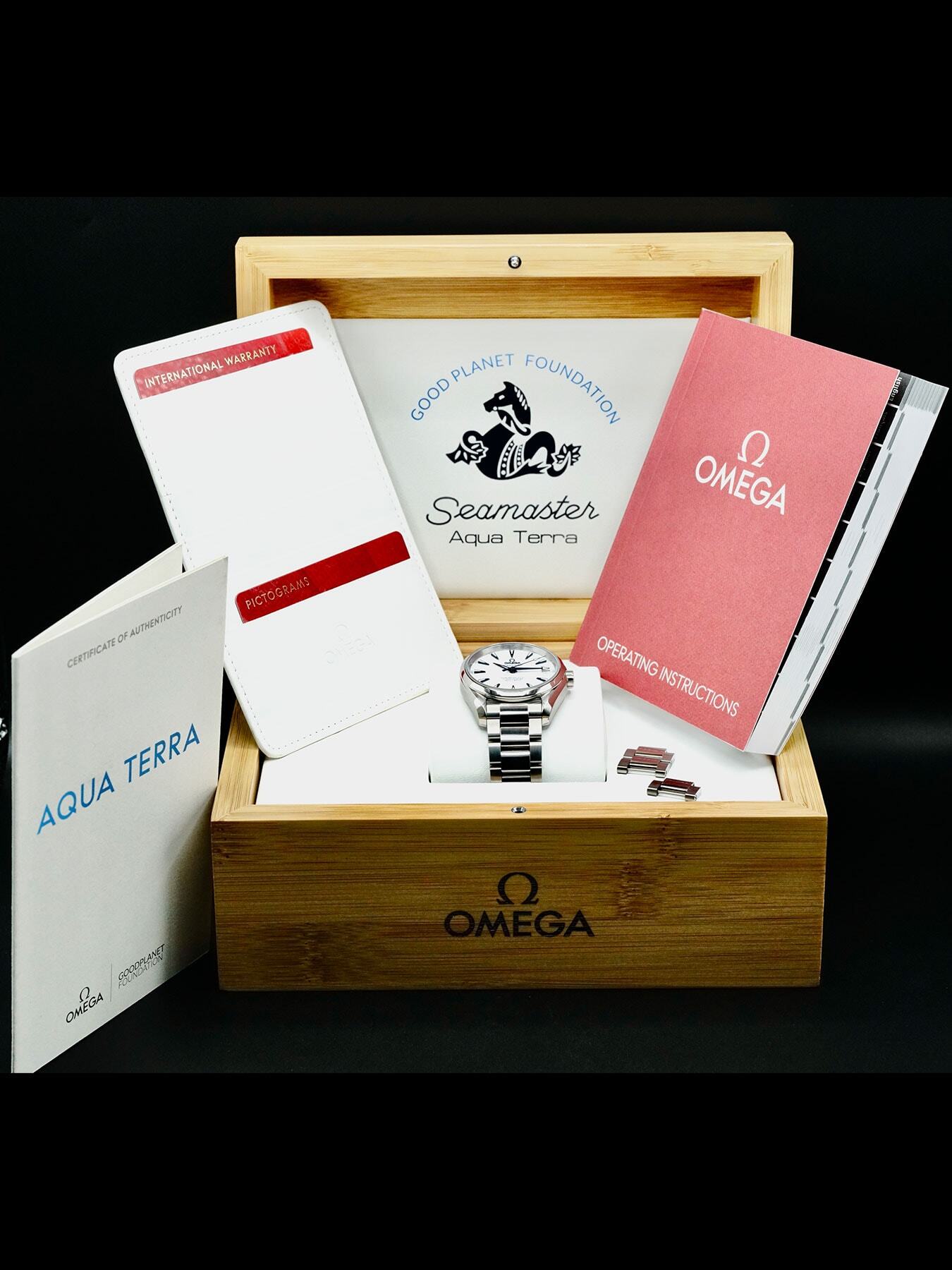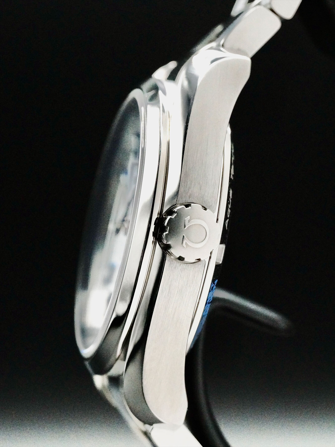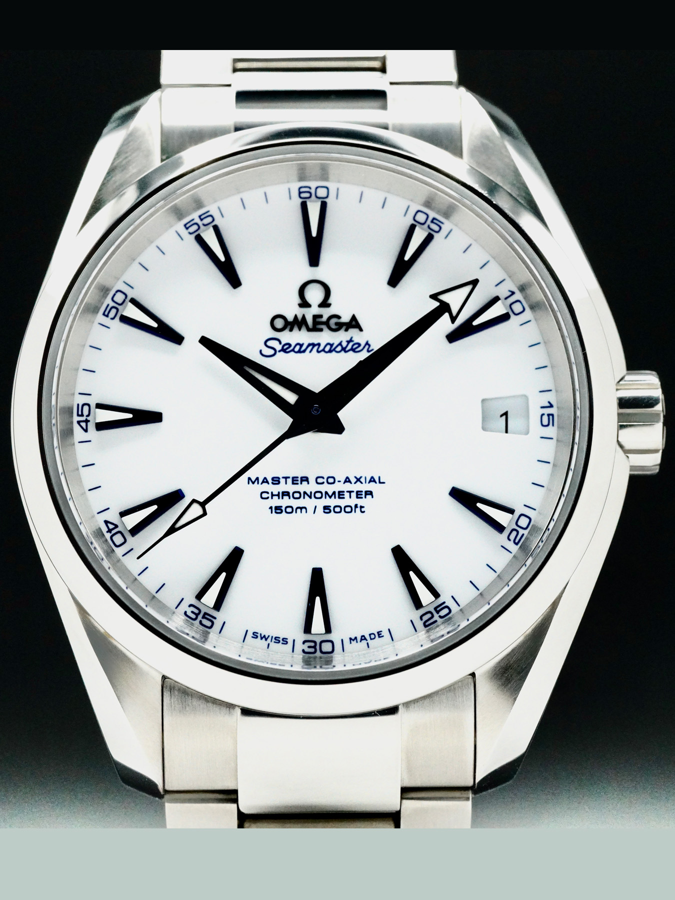 This Omega Seamaster Aqua Terra 150M features a 38.5mm titanium case with an exhibition case back on a titanium bracelet. This watch also sports a white dial with luminous hands and index dial markers covered by scratch resistant sapphire crystal.