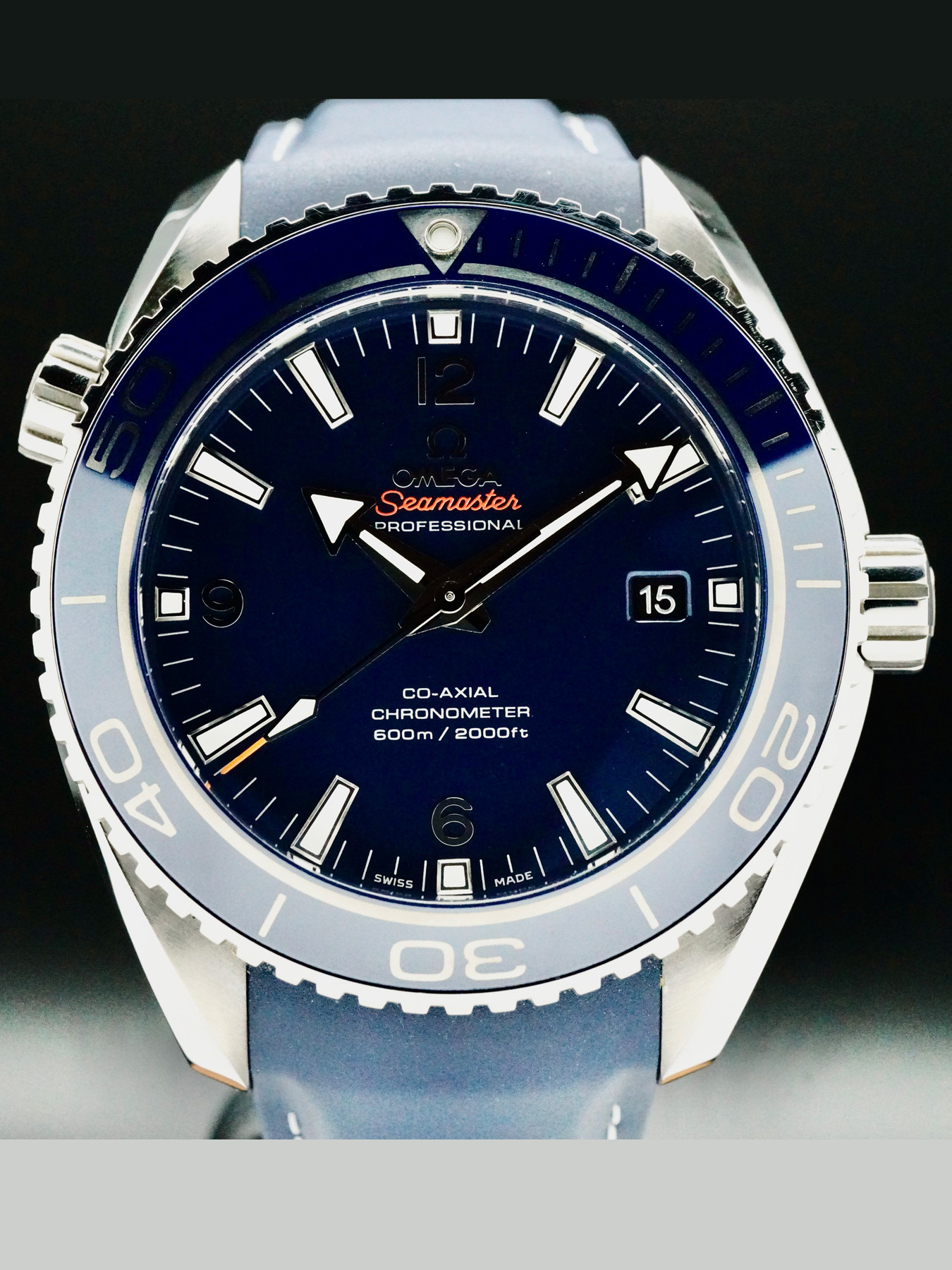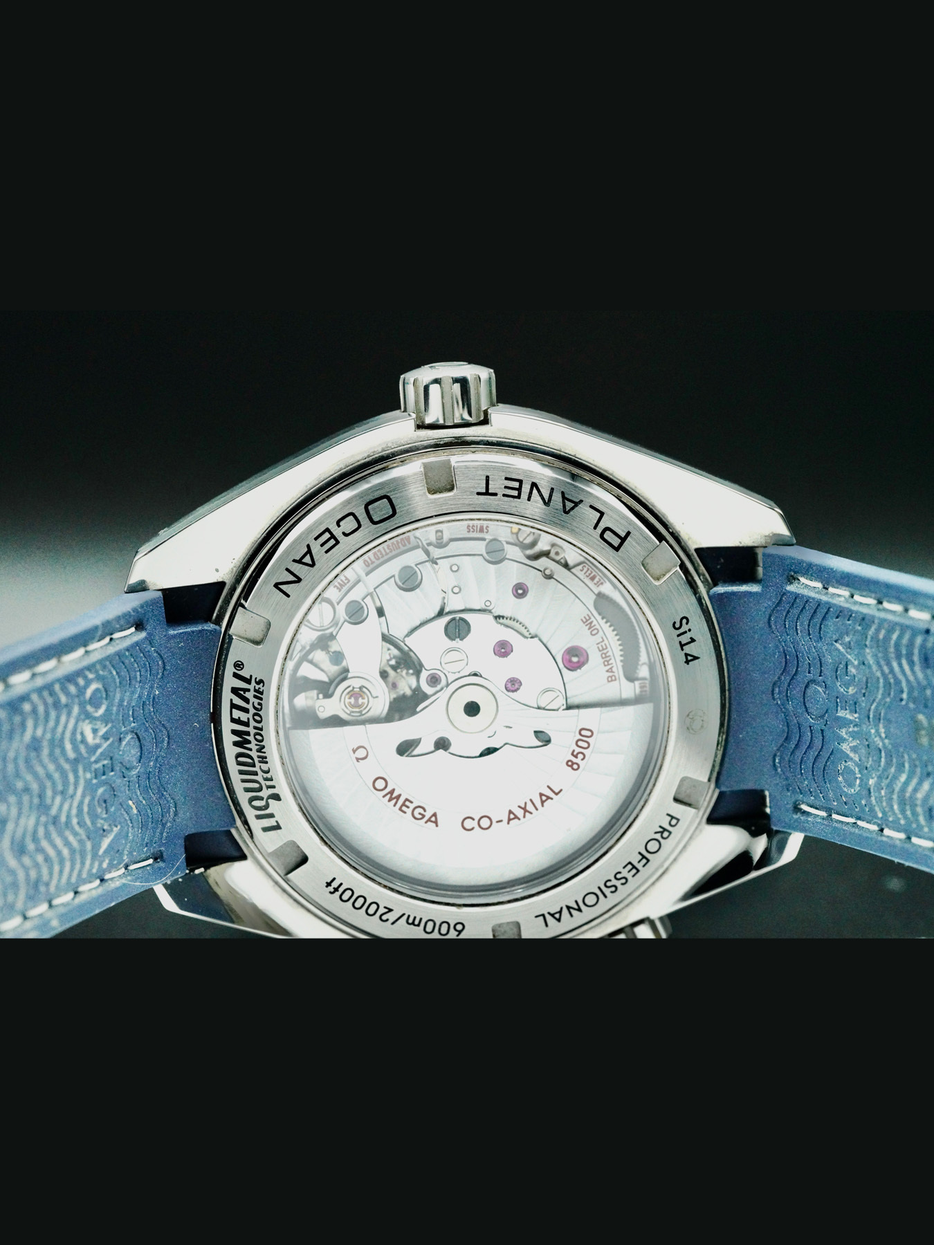 This Omega Planet Ocean 600M features a 45.5mm titanium case with a display case back on a blue rubber strap. This watch also sports a blue dial with luminous hands and index dial markers covered by scratch resistant sapphire crystal.