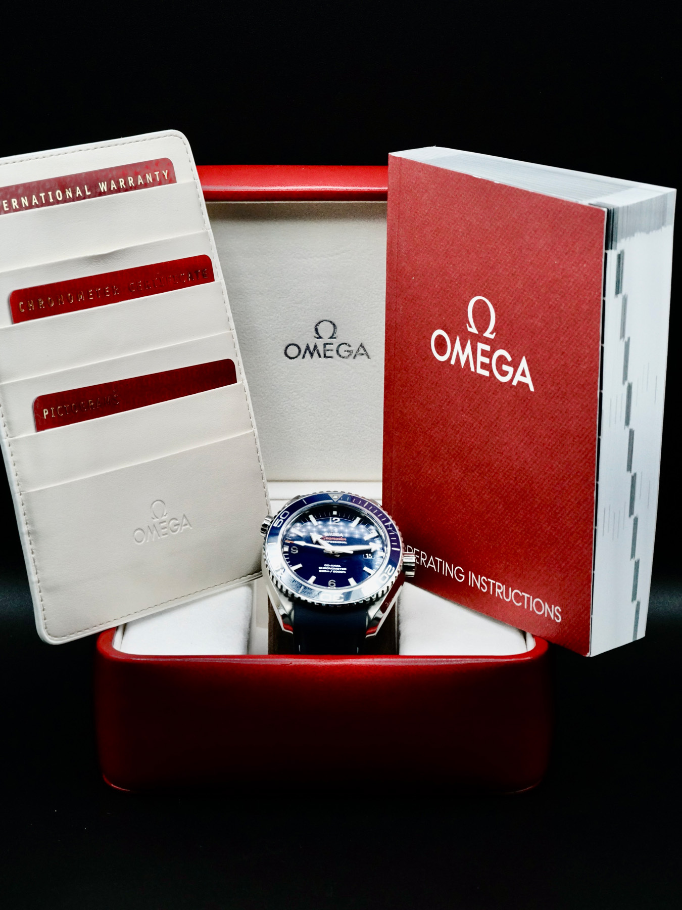 This Omega Planet Ocean 600M 232.92.46.21.03.001 is in EXCELLENT condition. This watch includes its original box, operating instructions, and international warranty card. No date on warranty card.