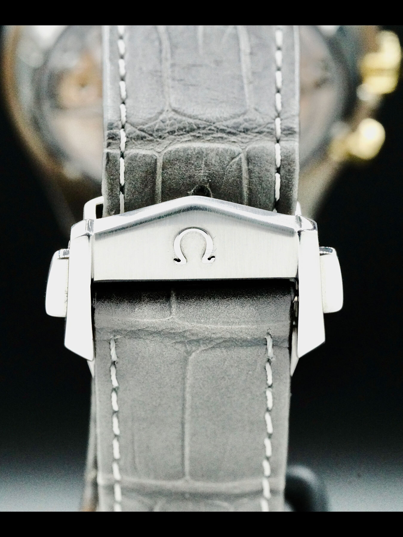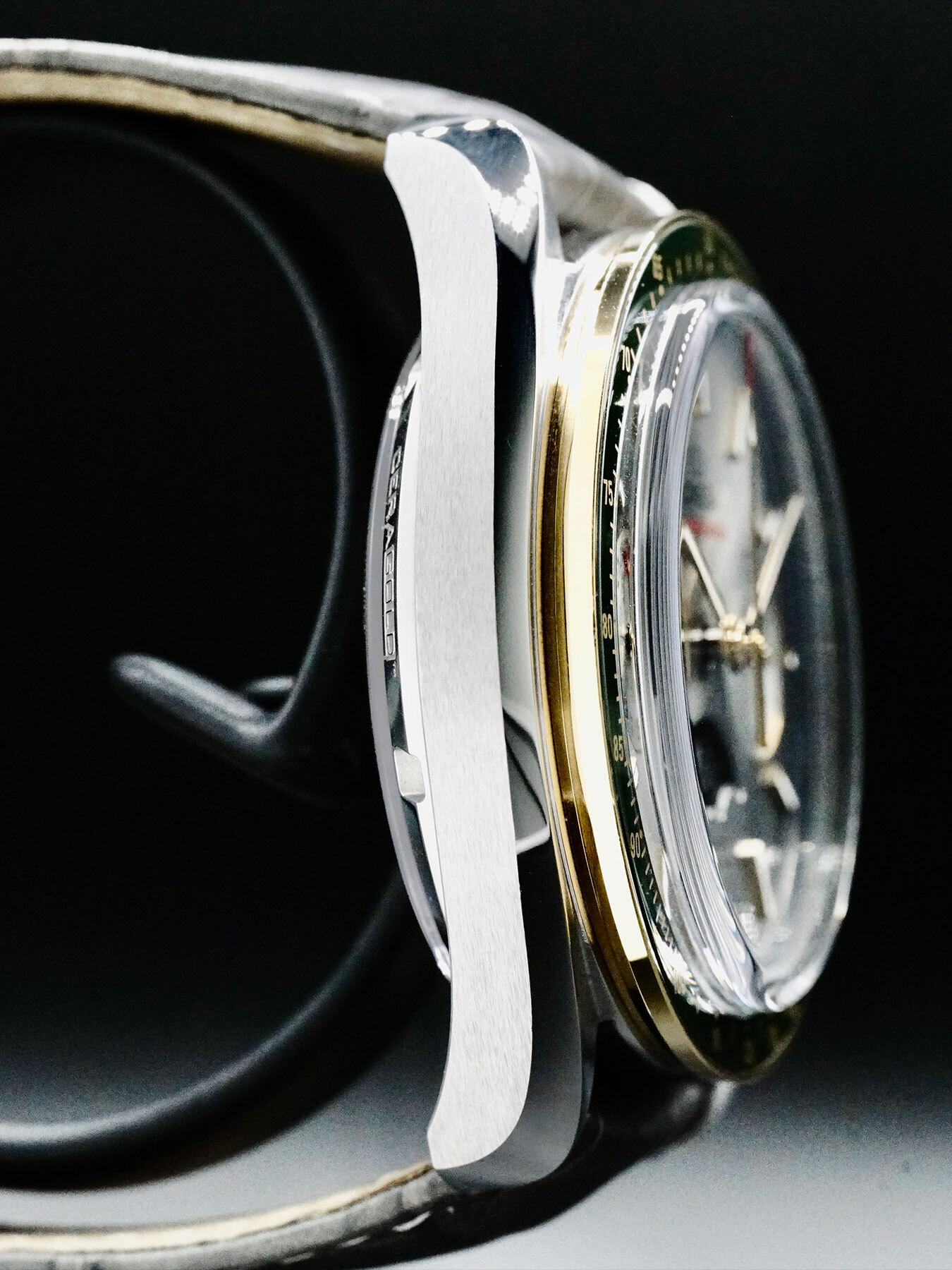 This watch features a 44mm stainless steel - 18k yellow gold case on leather strap. This watch also sports a grey dial. Powered by a mechanical automatic movement. Water resistance up to 100 meters.