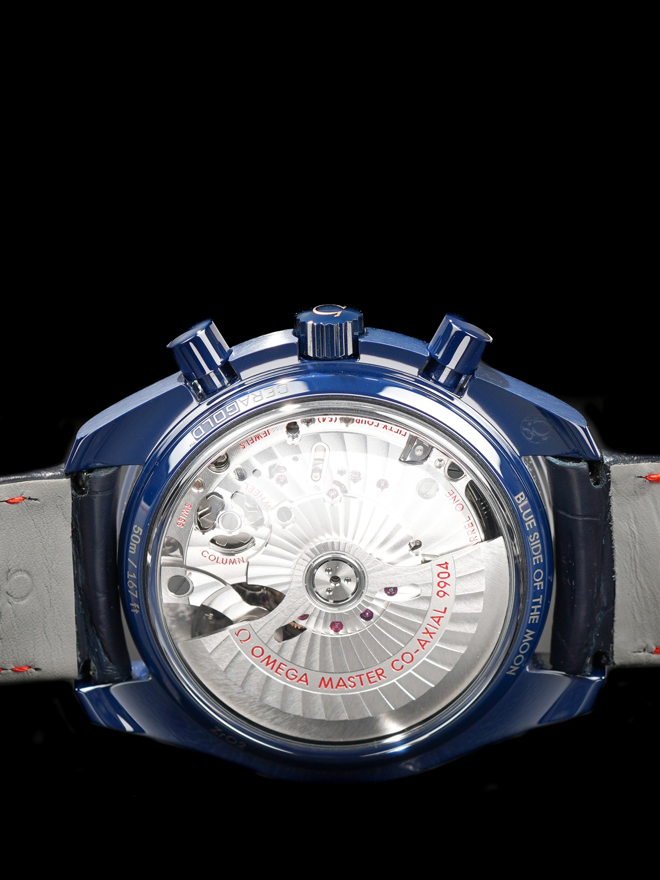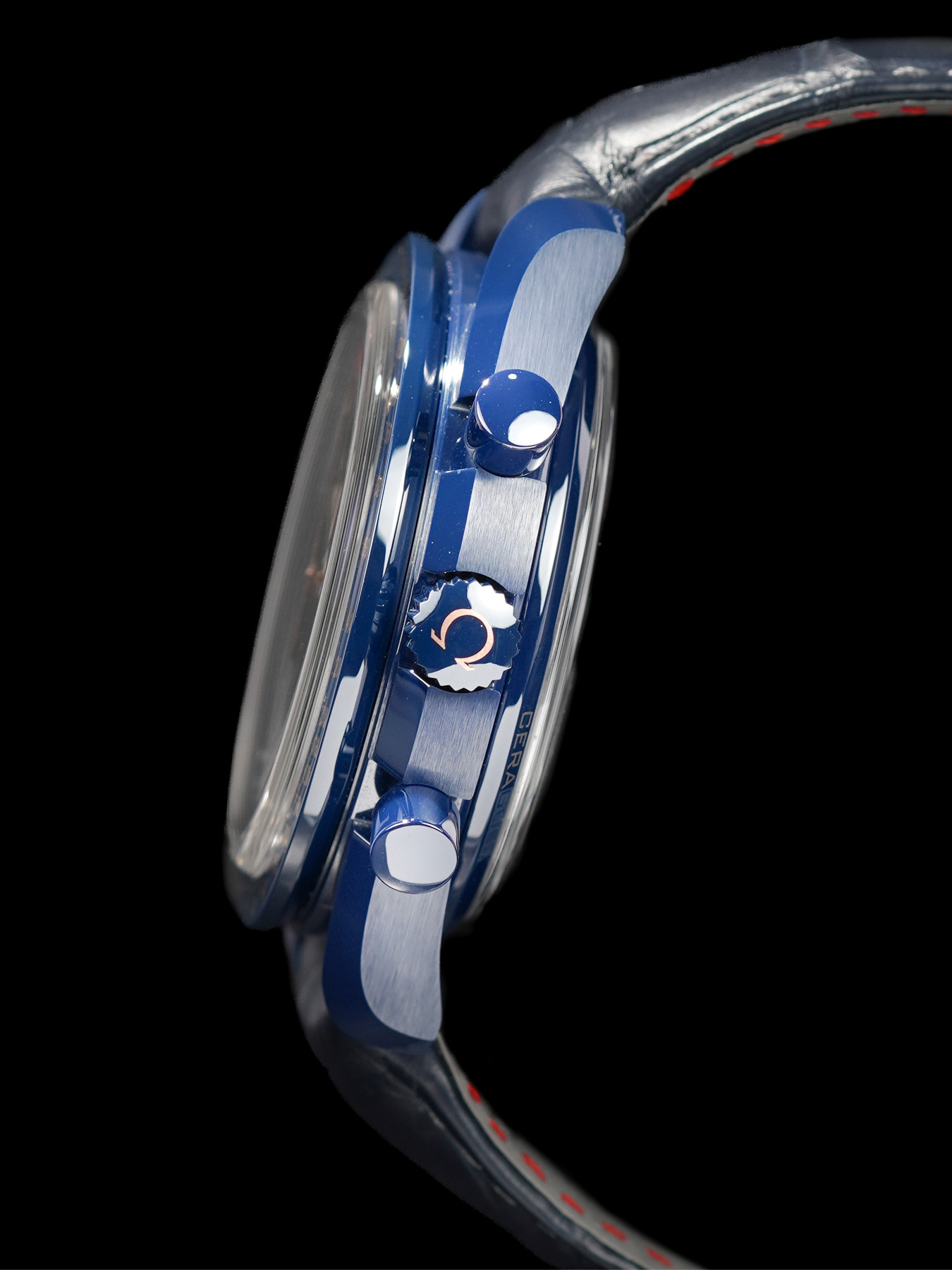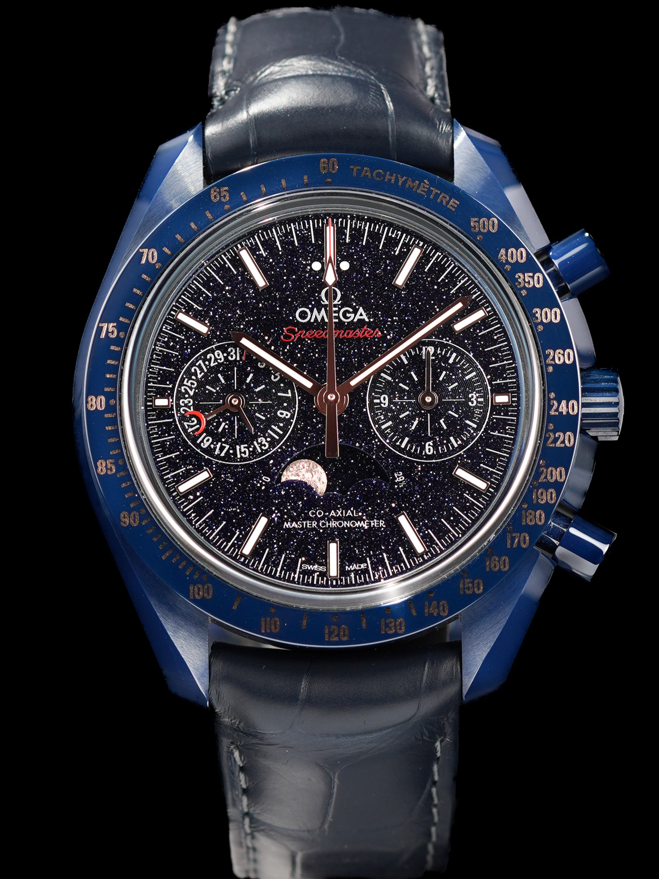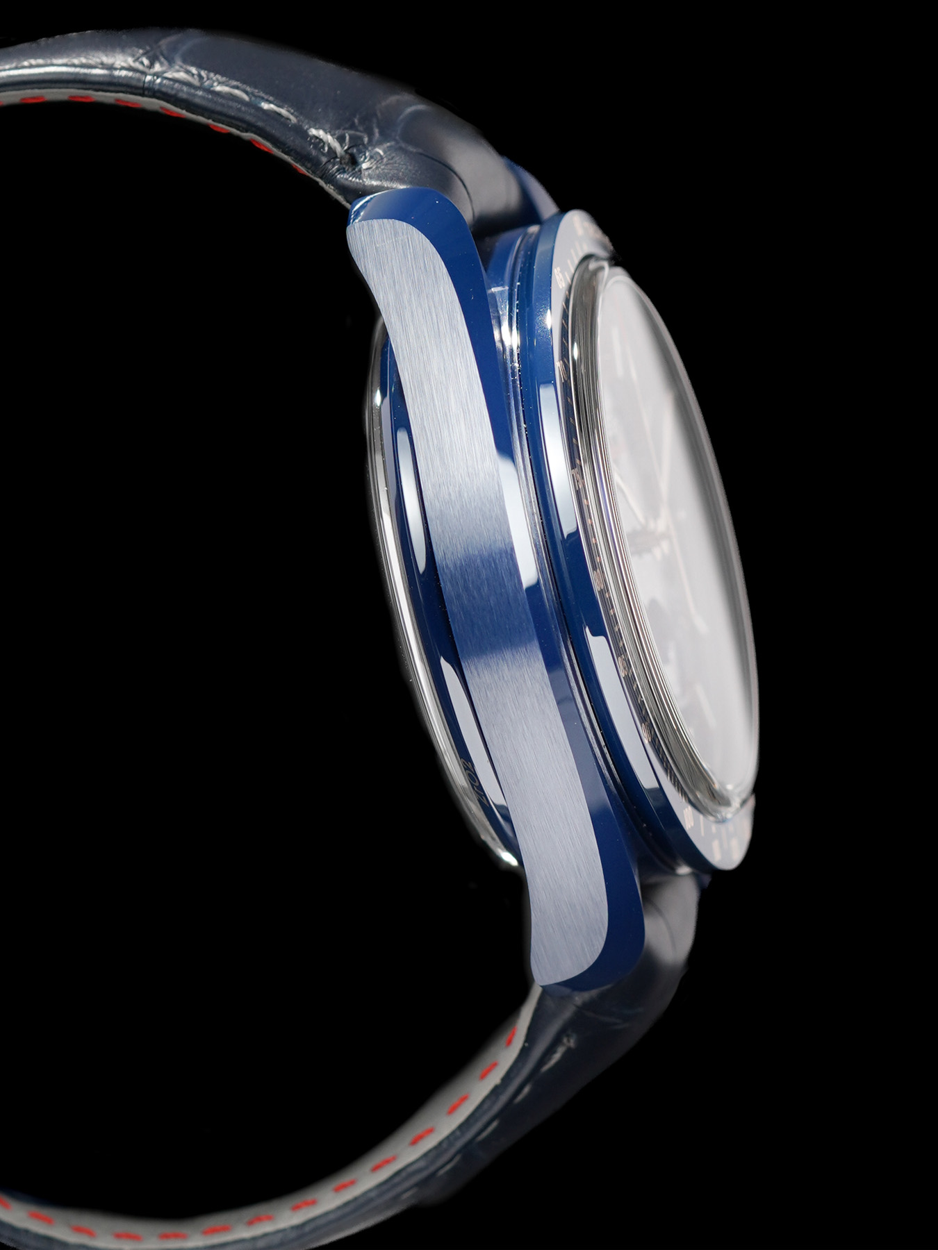 This watch features a 44.25mm blue ceramic case on leather strap. This watch also sports a blue dial. Powered by a mechanical automatic movement. Water resistance up to 50 meters.