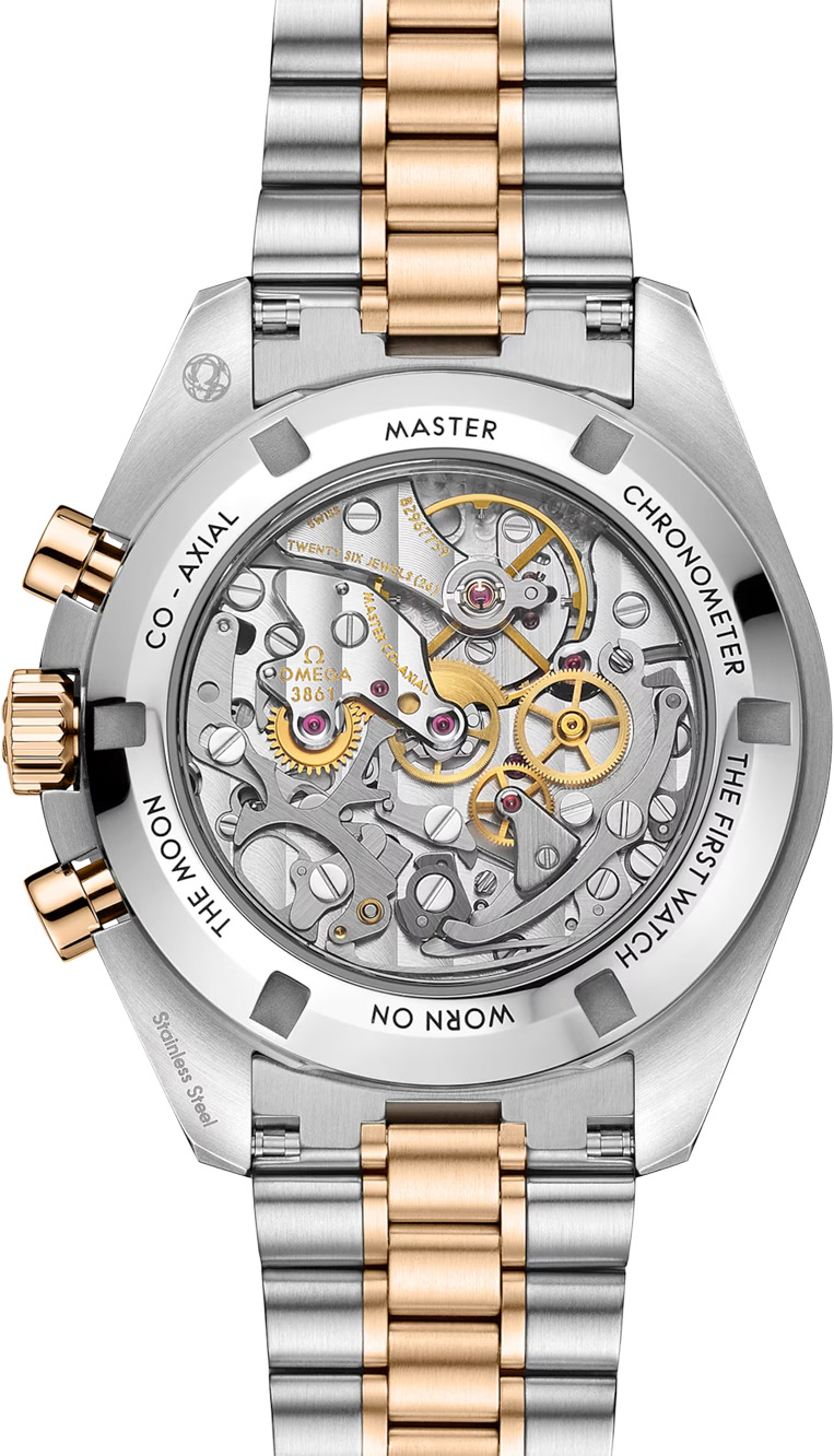 This 42 mm bi-colour model in stainless steel and 18K Moonshine™ Gold features sapphire crystal glass on the front as well as on the caseback. Inspired by the 4th generation Speedmaster style worn on the moon, it includes an asymmetrical case with a black ceramic bezel ring, with its tachymeter scale and famous “dot over ninety” in OMEGA Ceragold™.