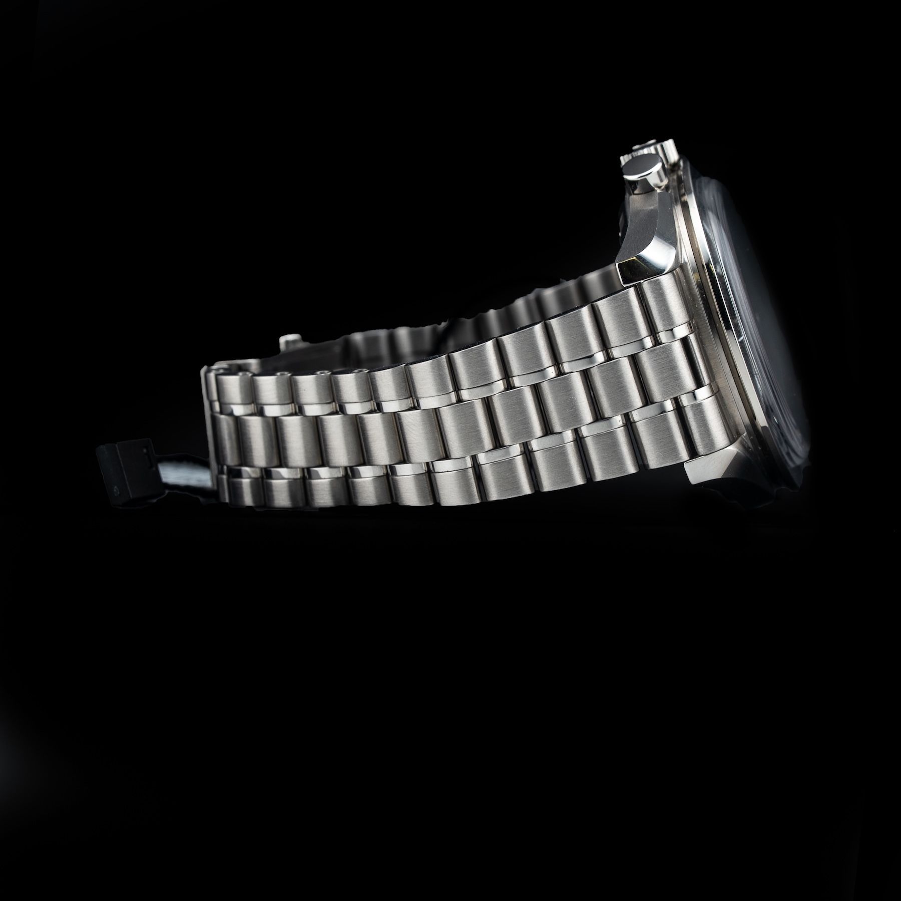 This watch features a 42mm stainless steel case on stainless steel bracelet. This watch also sports a black dial. Powered by a mechanical manual movement. Water resistance up to 50 meters.