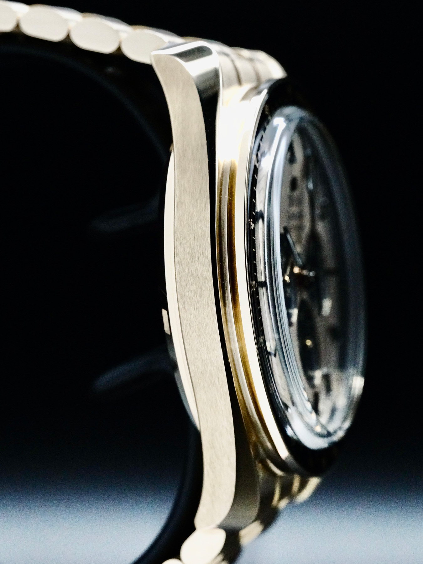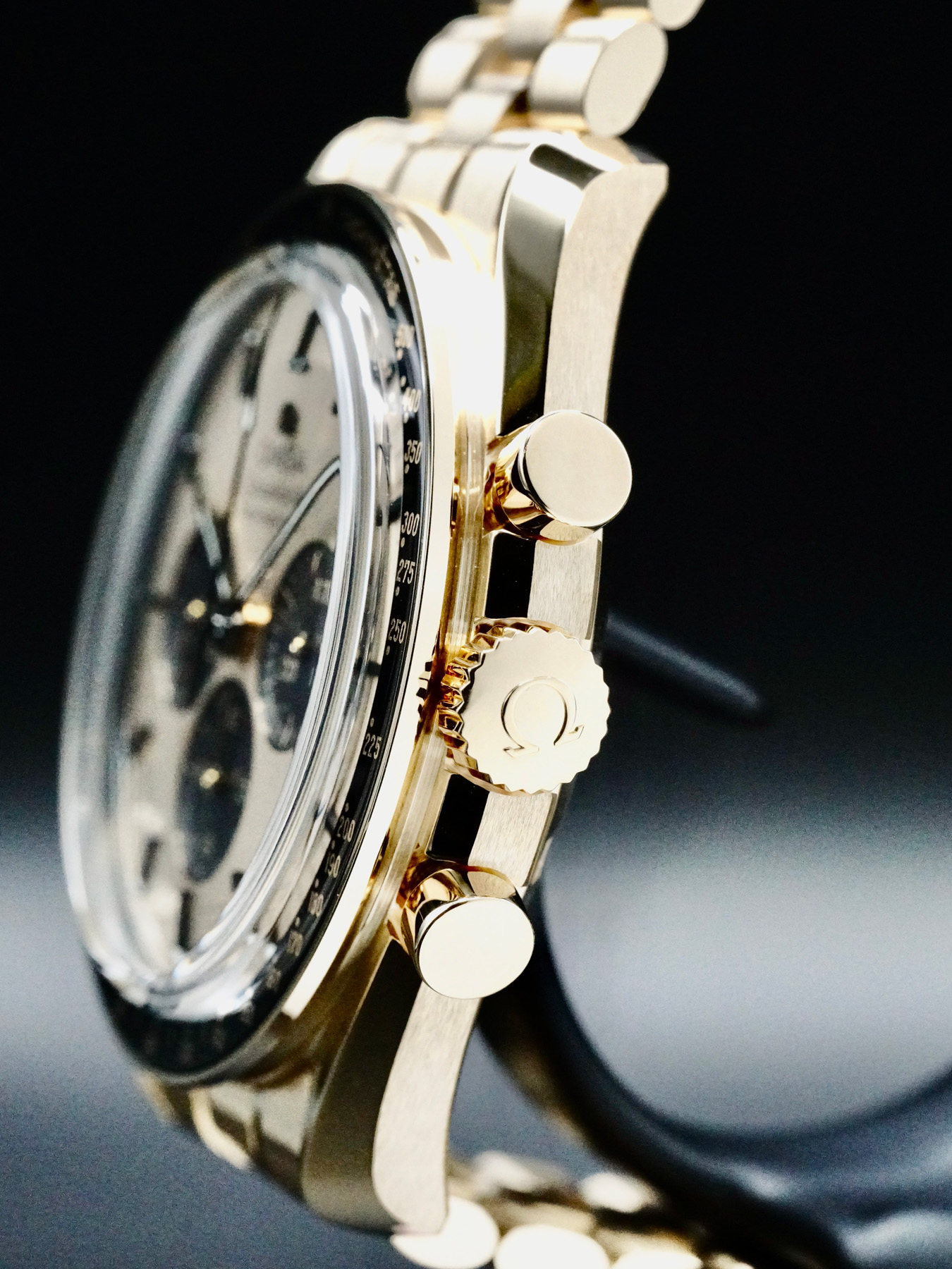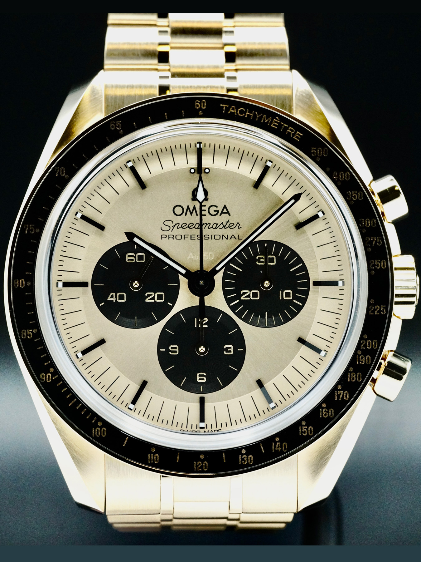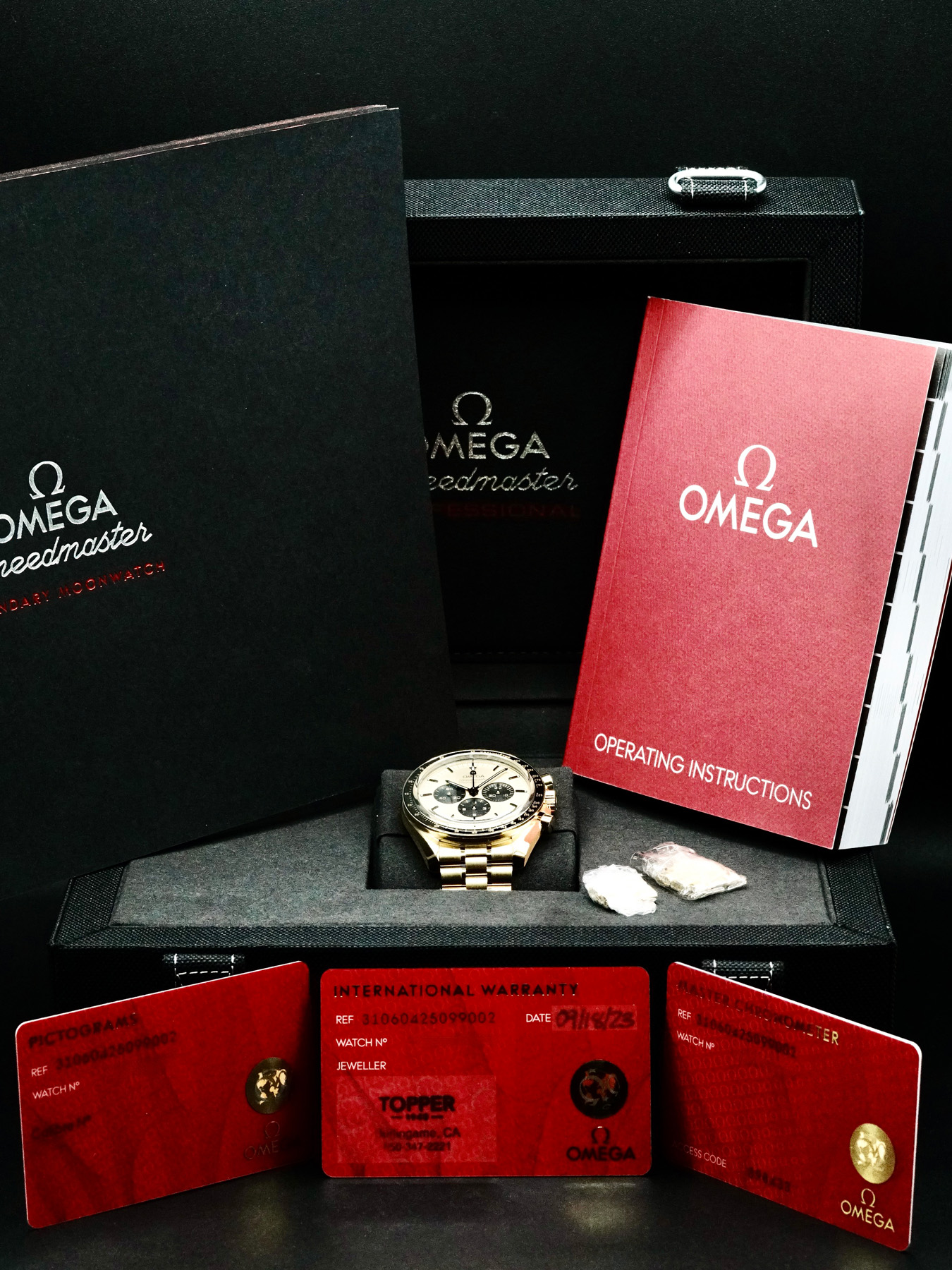This Omega Speedmaster Moonwatch Professional Moonshine Gold 310.60.42.50.99.002 is in EXCELLENT condition. This watch includes its original box, instruction manual, and warranty card dated for 2023. Extra 18k Moonshine gold bracelet links. This watch has been fully authenticated and certified by Exquisite Timepieces.