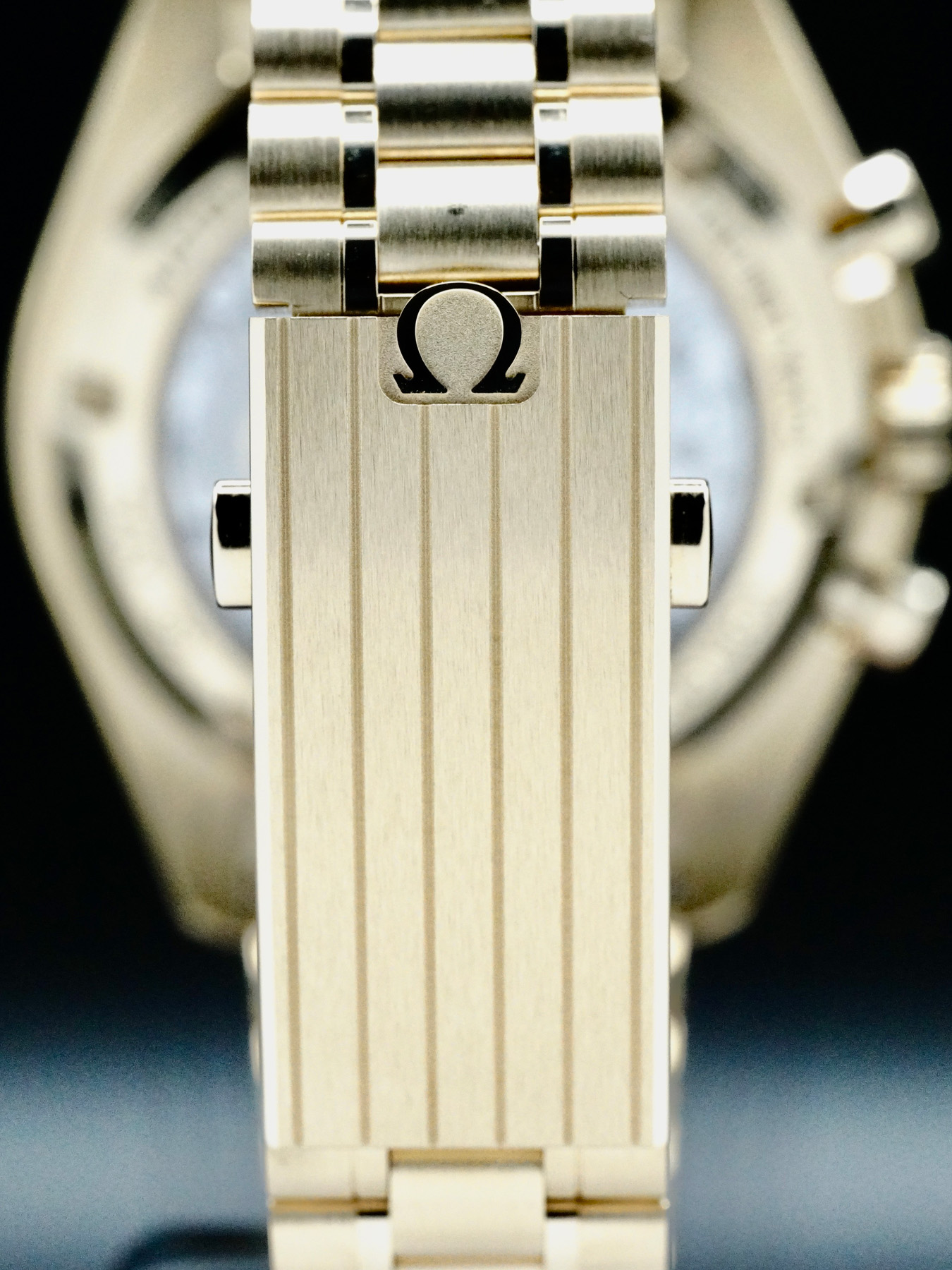 This Omega Speedmaster Moonwatch Professional features a 42mm 18k Moonshine gold case with an exhibition case back on an 18k Moonshine gold bracelet. This watch also showcases an 18k Moonshine gold dial with luminous hands and index dial markers covered by scratch resistant sapphire crystal.