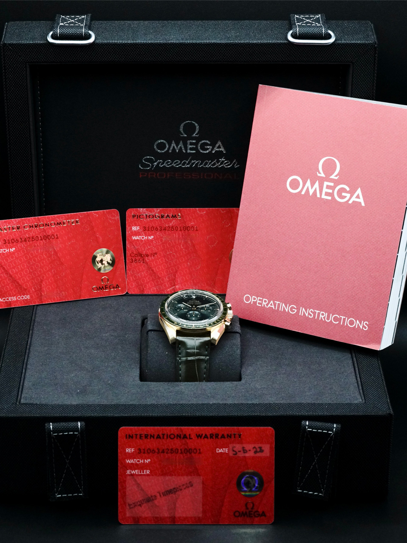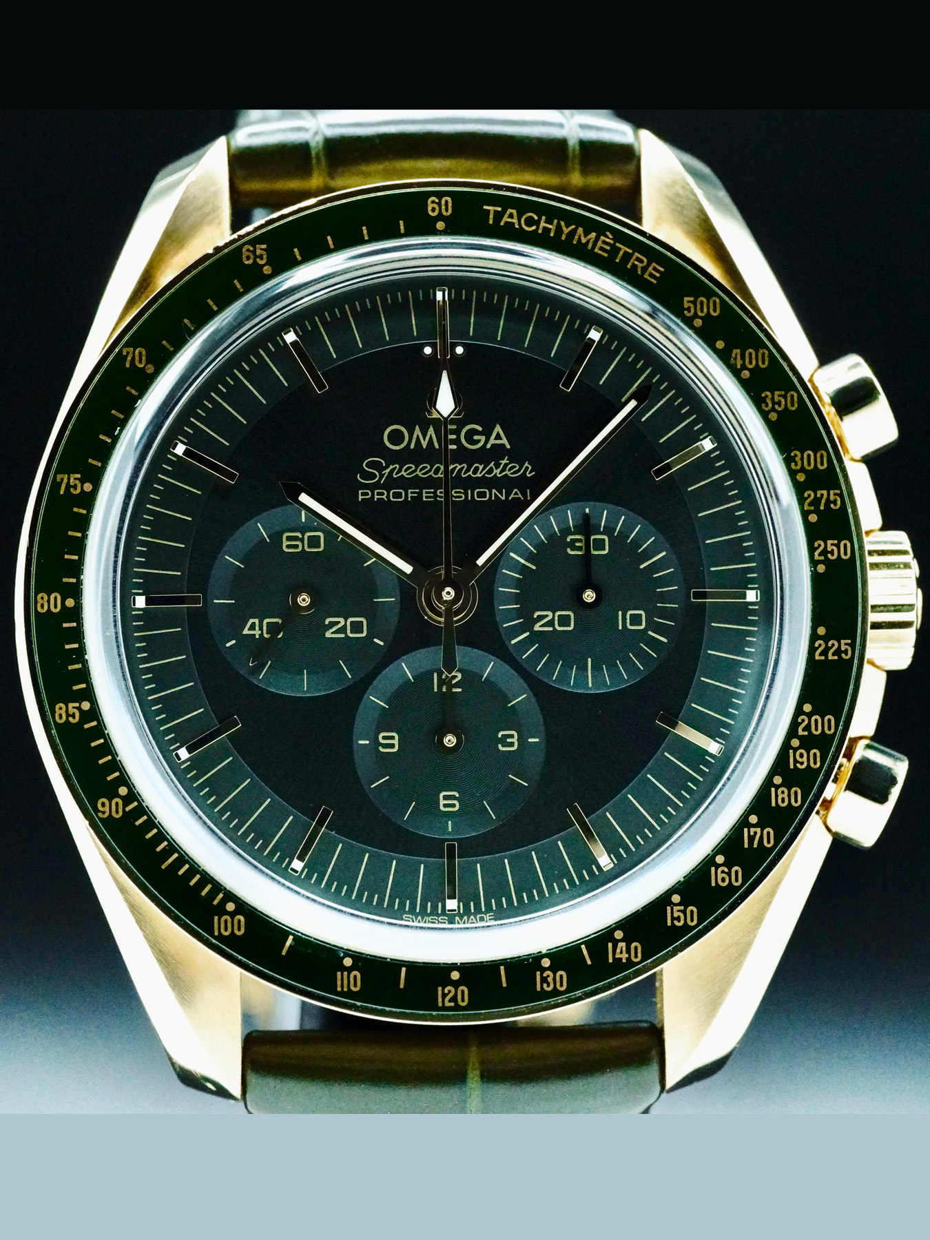This Omega Speedmaster Moonwatch Professional Master Chronometer Moonshine Gold Green Dial 310.63.42.50.10.001 is in GREAT condition. This watch includes its original box, instruction manual, and warranty card dated for 2023. This watch has been fully authenticated and certified by Exquisite Timepieces.