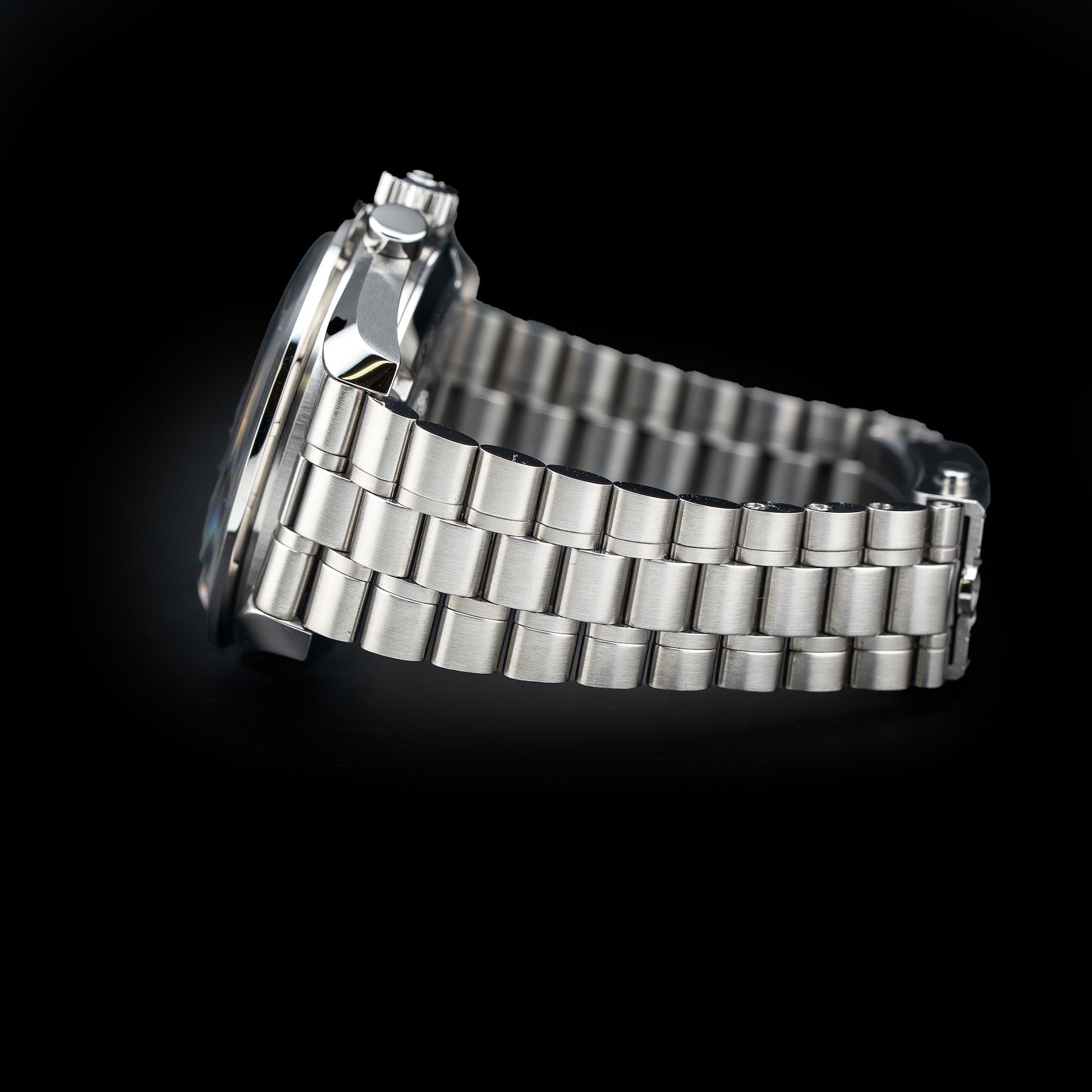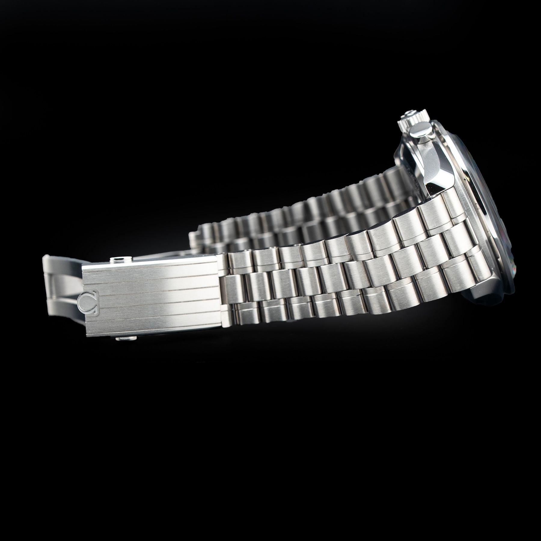 This watch features a 42mm stainless steel case on stainless steel bracelet. This watch also sports a black dial. Powered by a mechanical manual movement. Water resistance up to 50 meters.