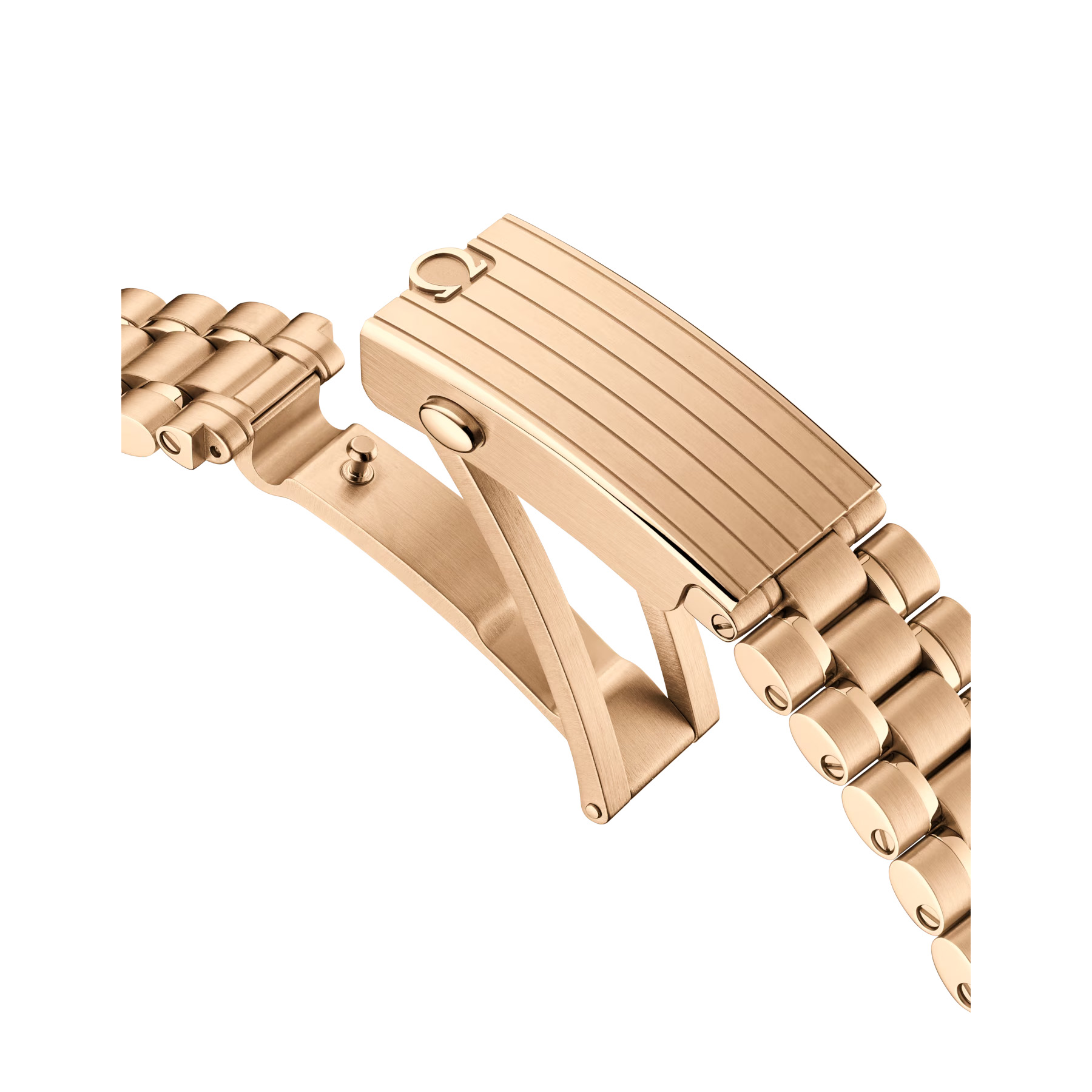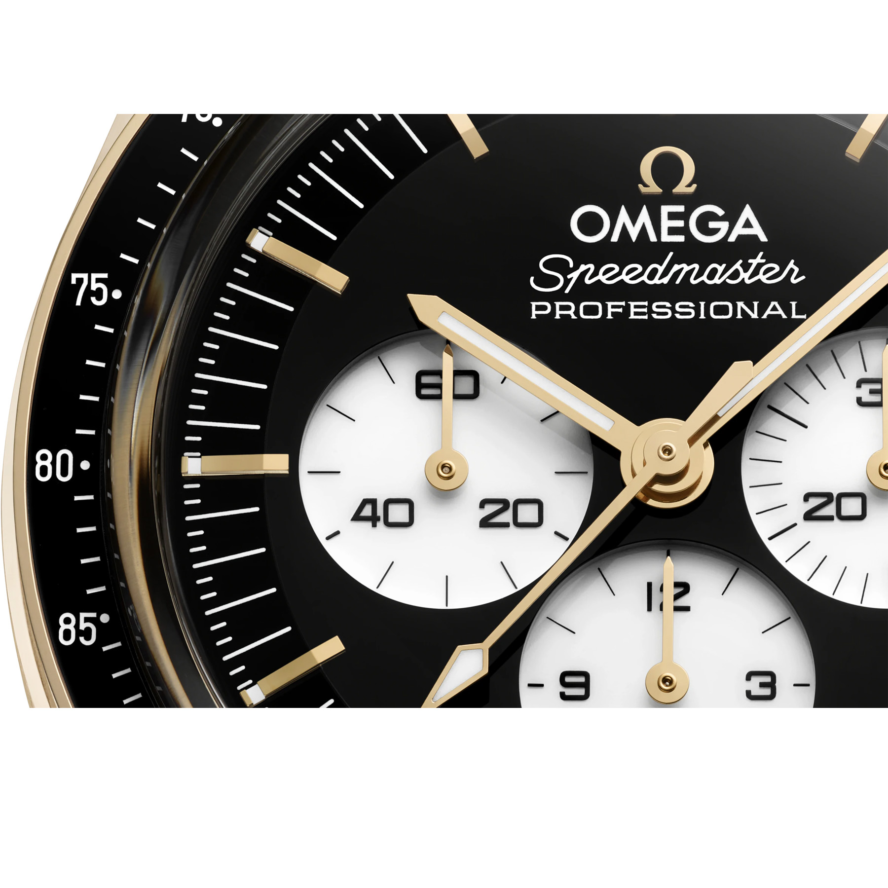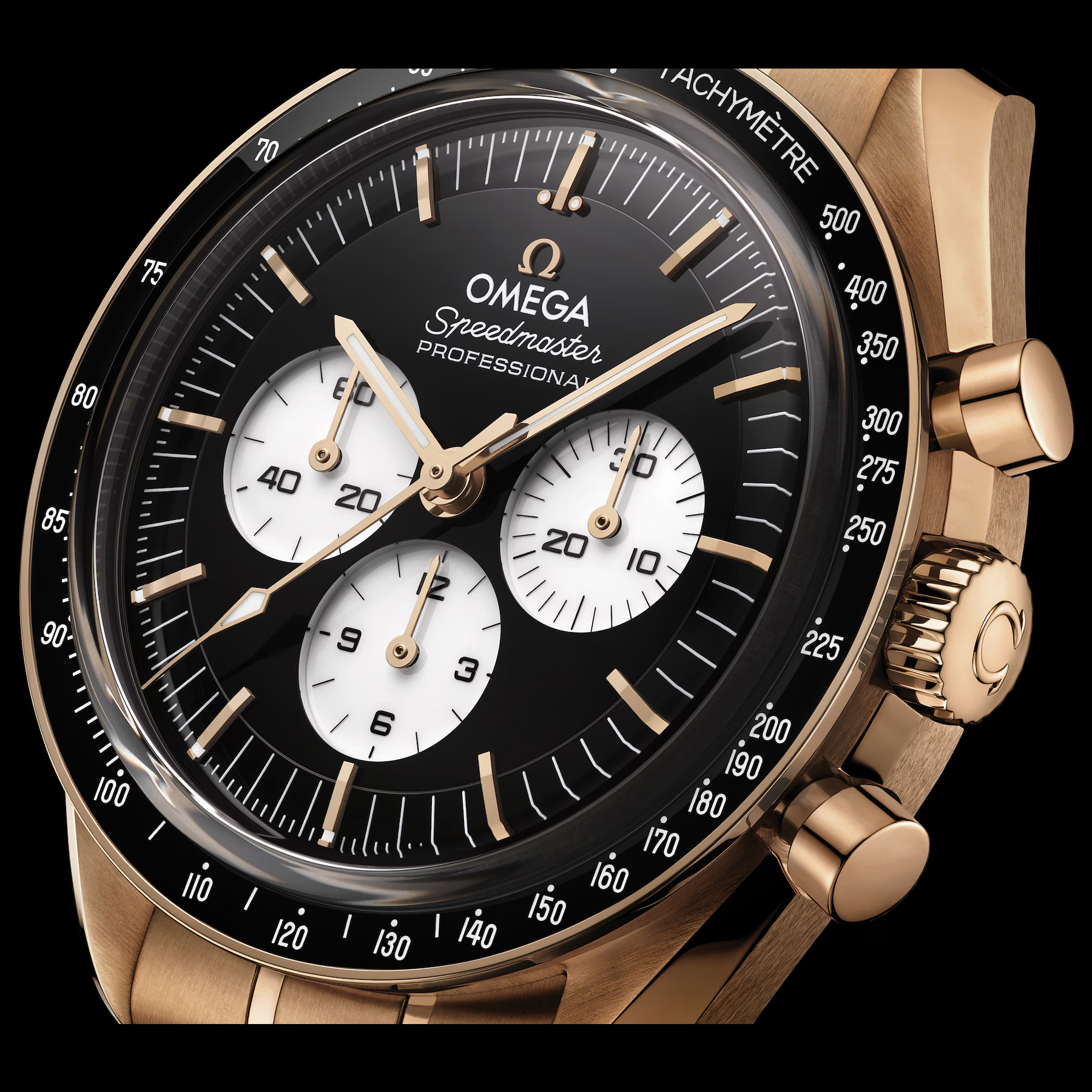 This 42 mm model in 18K Moonshine™ Gold features sapphire crystal glass on both the front and caseback, presented on a polished-brushed bracelet in the same precious metal. The design draws inspiration from the 4th generation Speedmaster worn on the moon. Its black varnished and lacquered double plate step dial is complemented by white varnished and lacquered subdials set within rhodium-plated frames. Details include the OMEGA logo, hands and indexes in 18K Moonshine™ Gold and the famous dot over 90 on the black ceramic bezel ring.