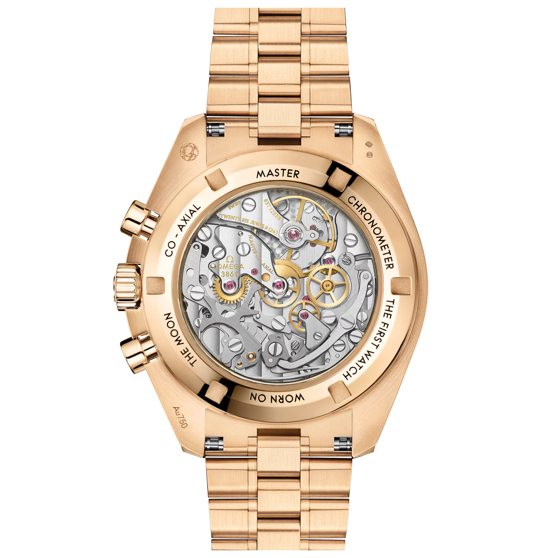 The watch is driven by the OMEGA Co-Axial Master Chronometer Calibre 3861, which powers the small seconds sub-dial, 30-minute recorder and 12-hour recorder, along with the central chronograph function.