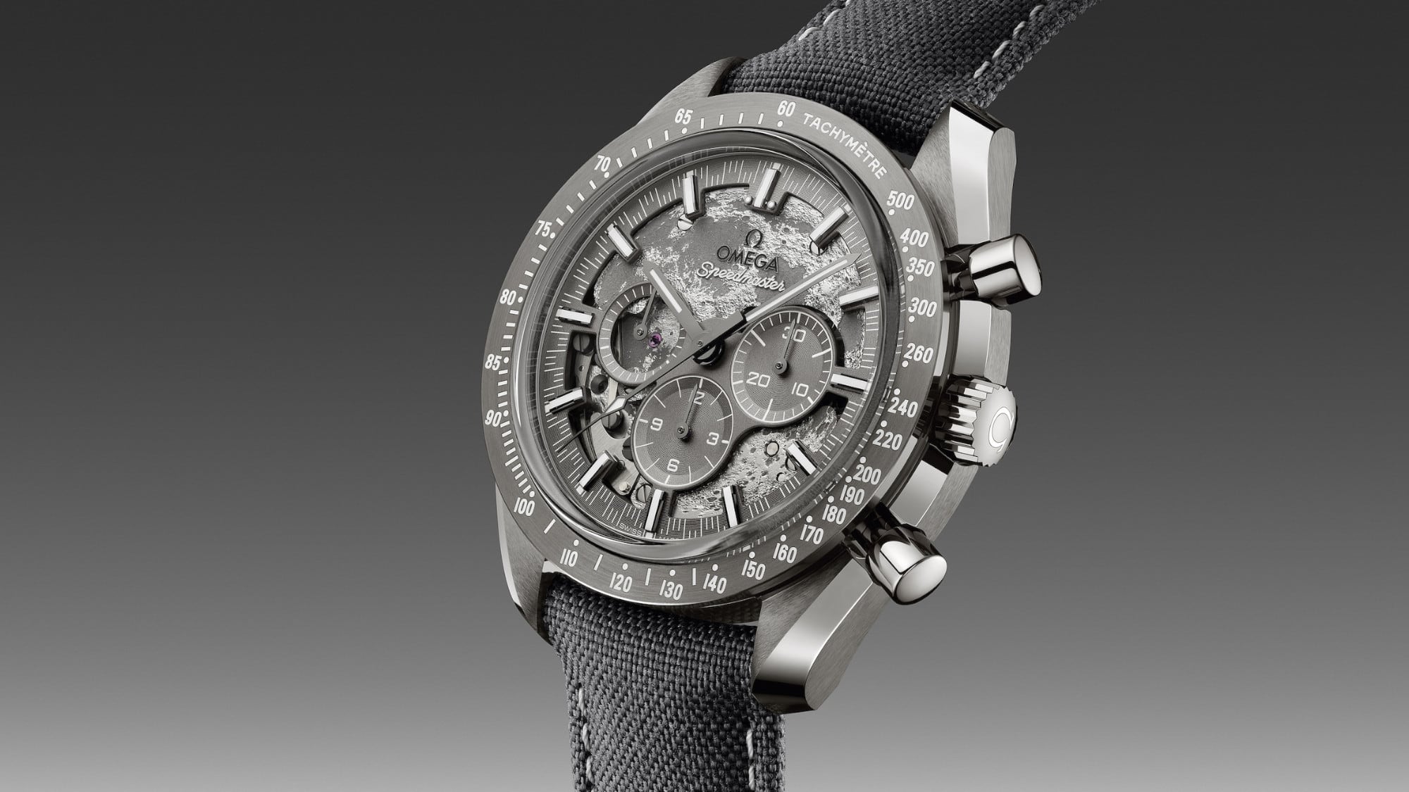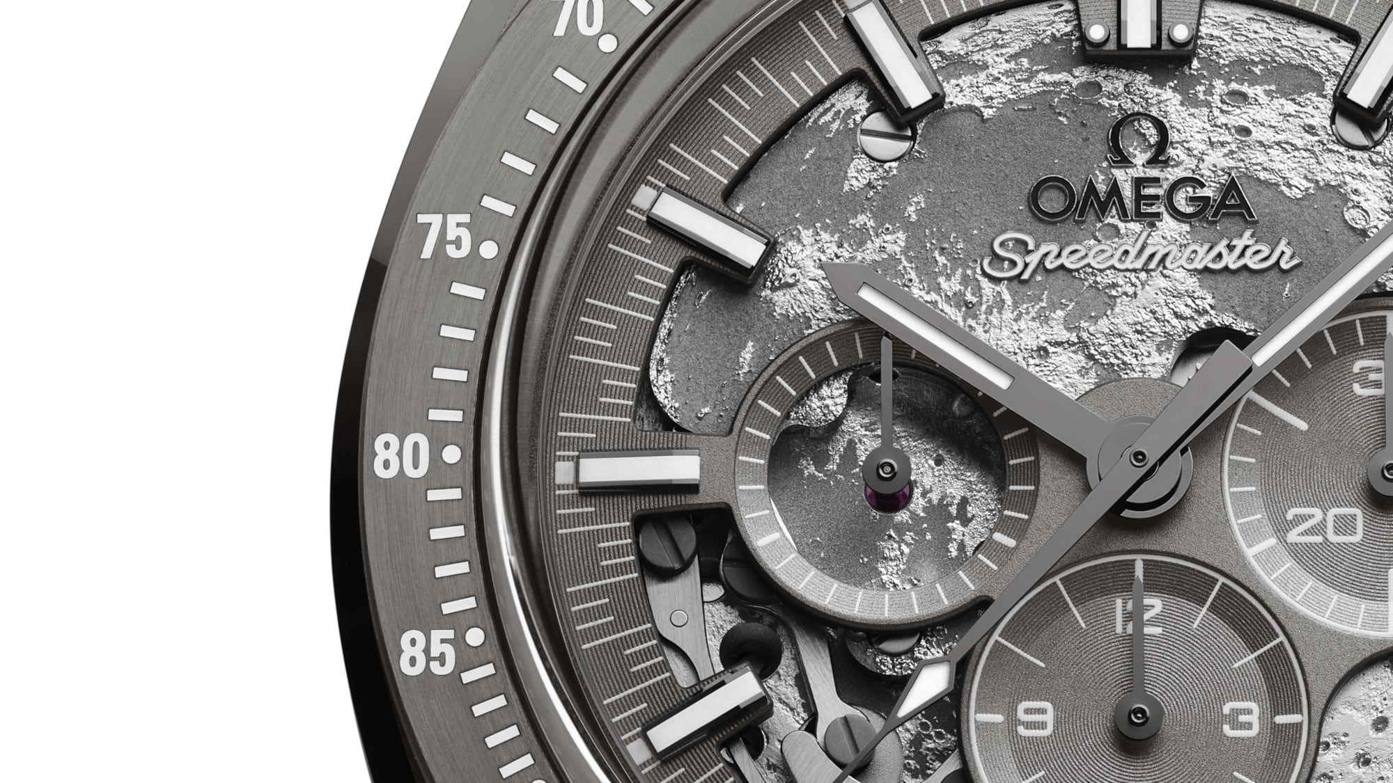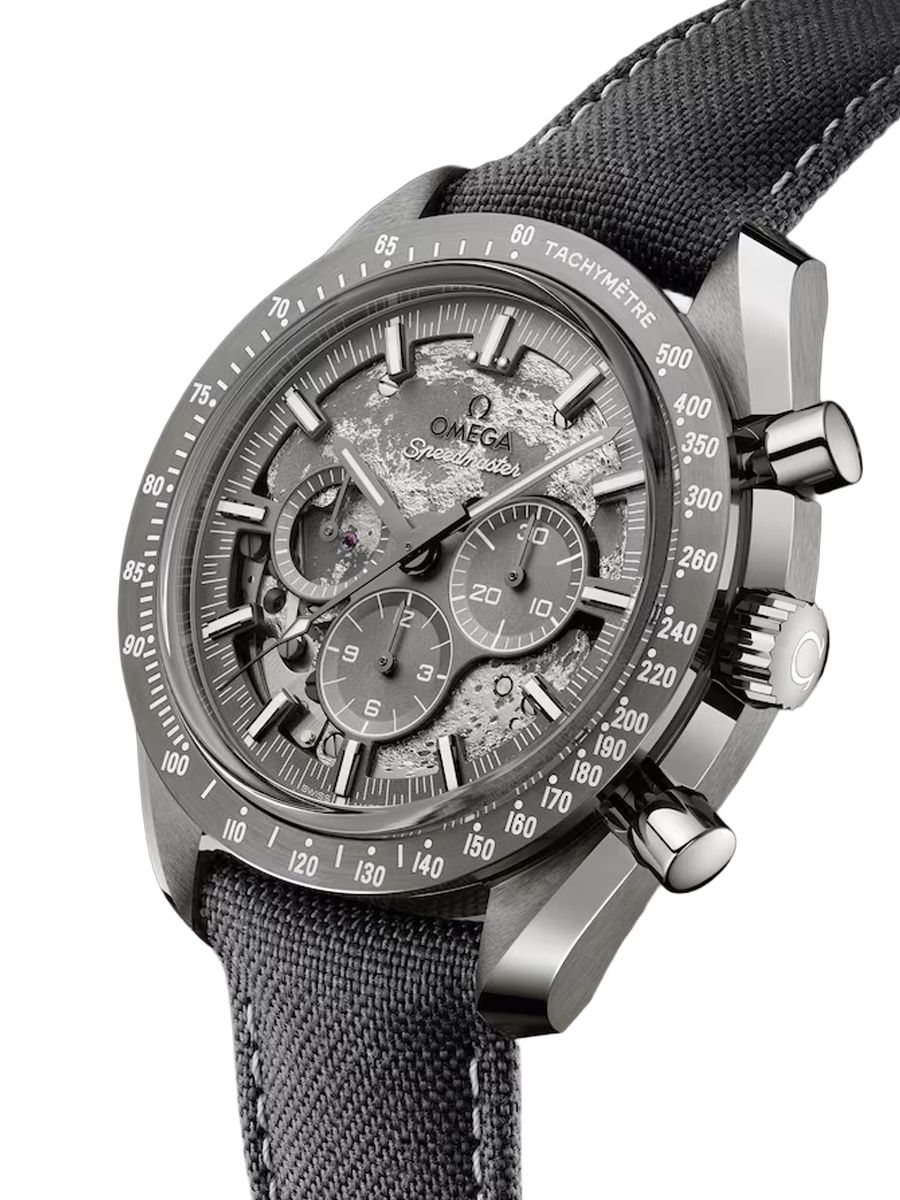 Honouring OMEGA’s legacy of space exploration, this Speedmaster Grey Side of the Moon features a 44.25 mm case in polished-brushed grey ceramic with a plasma treatment. The brushed bezel is also made from grey ceramic and features a laser-engraved tachymeter scale that is filled with white Super-LumiNova.