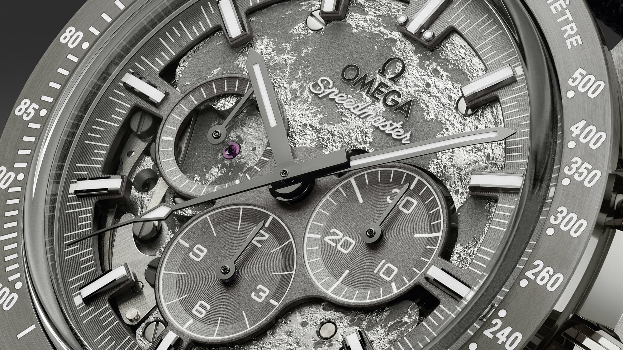 Beneath the front sapphire crystal, OMEGA’s connection to the moon is celebrated via the specially decorated movement, which is laser-ablated on the main plate and bridges to represent the moon’s surface. The near side can be seen on the skeletonized grey anodised aluminium dial, while the far side can be seen through the caseback.