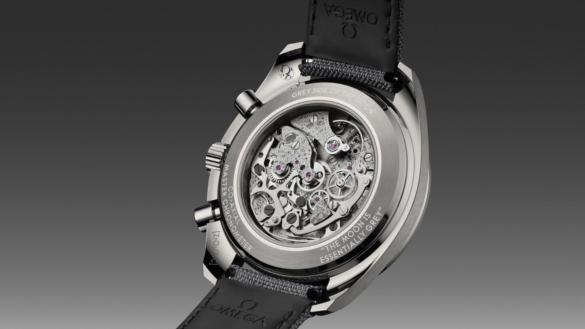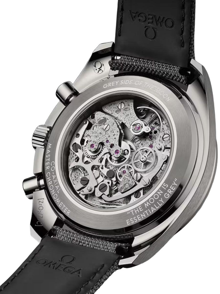 The specially decorated movement is the OMEGA Co-Axial Master Chronometer Calibre 3869, while the engravings on the caseback include the quote, THE MOON IS ESSENTIALLY GREY, which is attributed to Command Module Pilot, Jim Lovell, during the Apollo 8 mission.