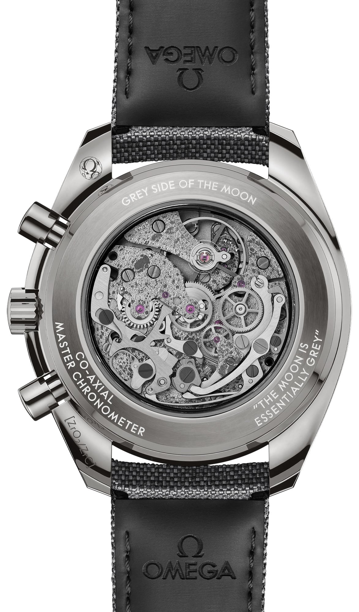 The specially decorated movement is the OMEGA Co-Axial Master Chronometer Calibre 3869, while the engravings on the caseback include the quote, THE MOON IS ESSENTIALLY GREY, which is attributed to Command Module Pilot, Jim Lovell, during the Apollo 8 mission.