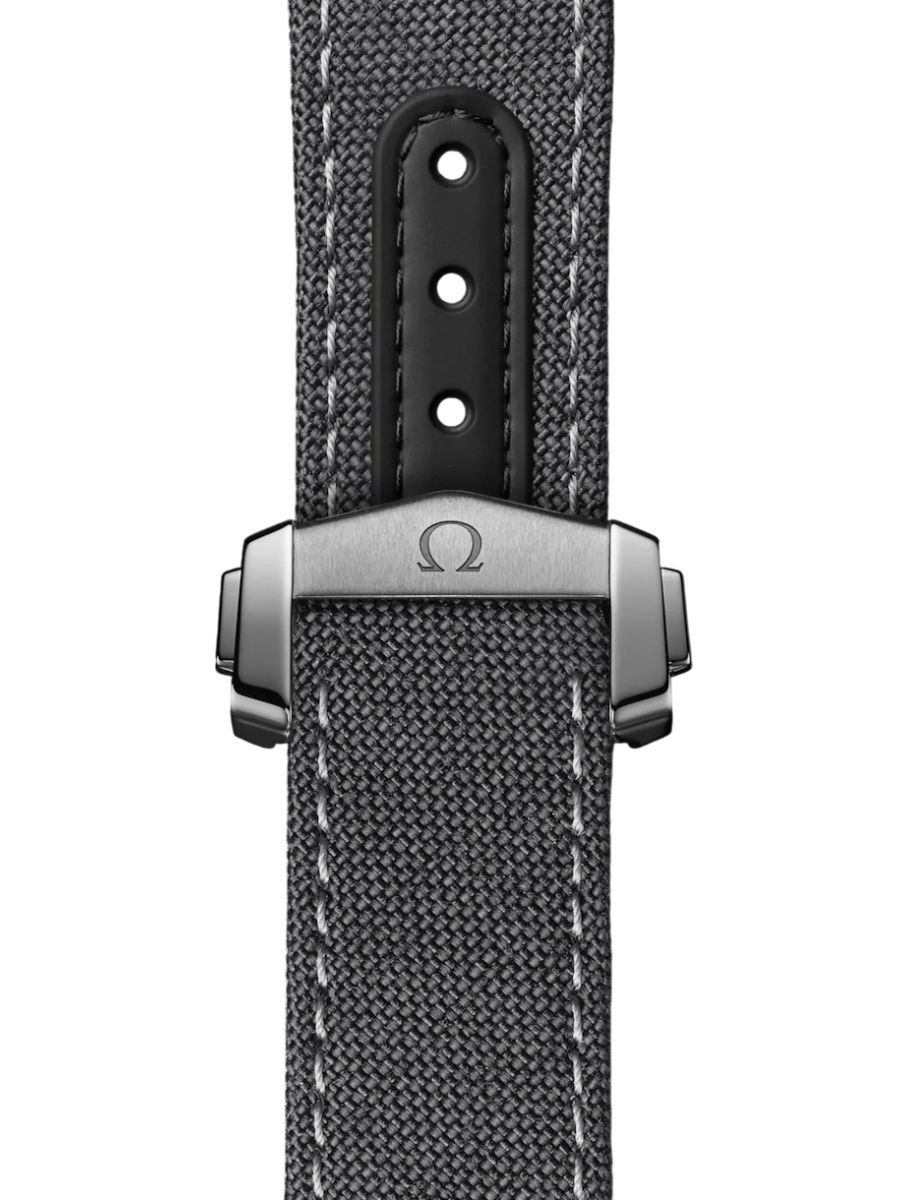 The watch is worn on a grey nylon fabric strap with black rubber lining, a ceramic foldover clasp and ceramised titanium frame-spring folders.