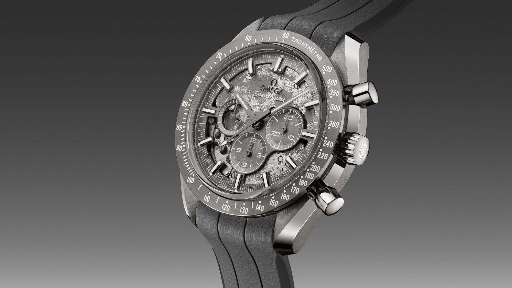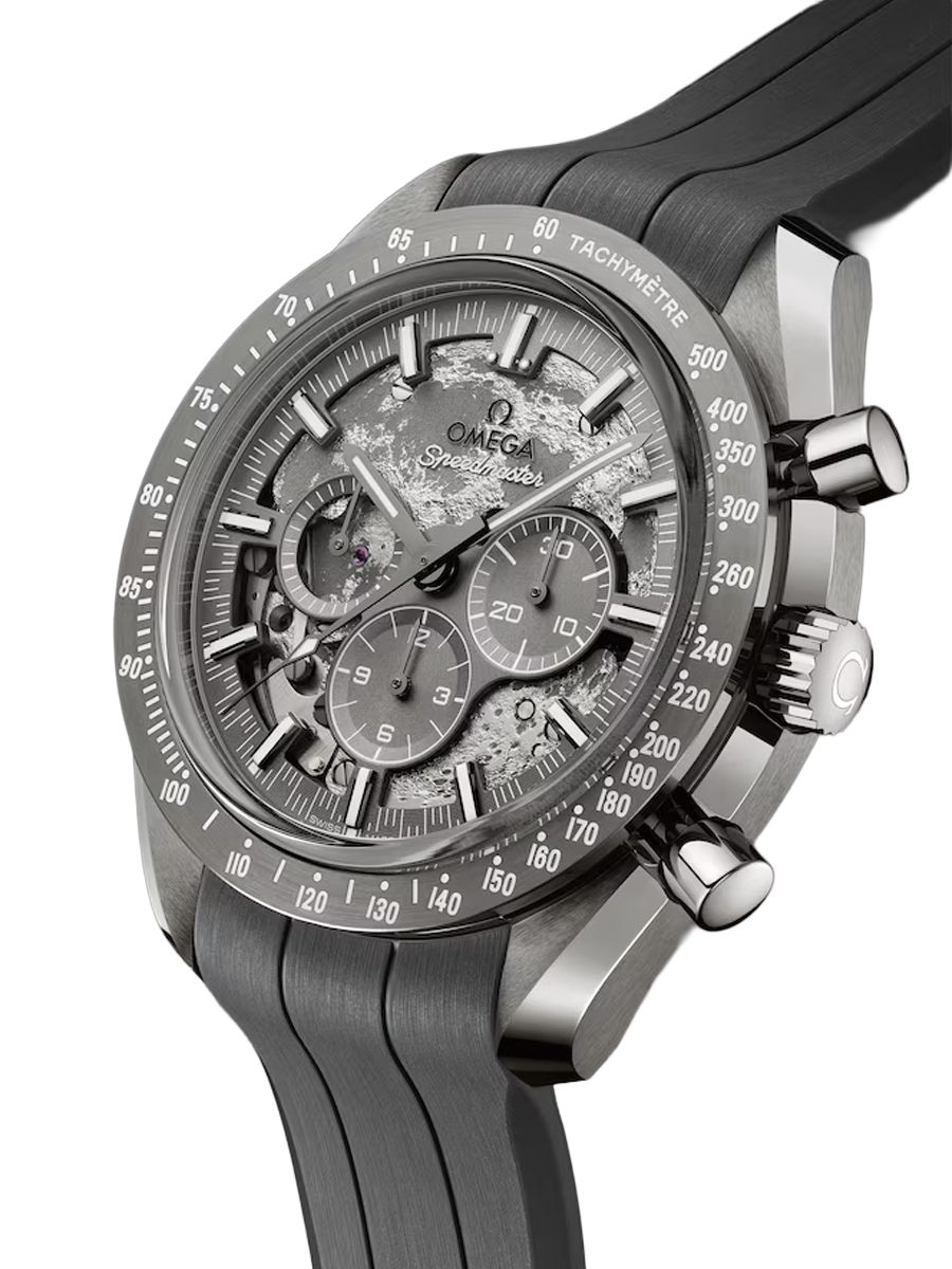The watch is worn on a grey rubber strap with a moon surface pattern on the underside, a ceramic foldover clasp and ceramised titanium frame-spring folders.