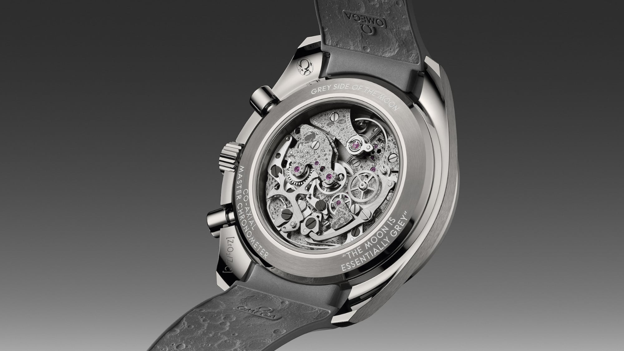 Beneath the front sapphire crystal, OMEGA’s connection to the moon is celebrated via the specially decorated movement, which is laser-ablated on the main plate and bridges to represent the moon’s surface. The near side can be seen on the skeletonized grey anodised aluminium dial, while the far side can be seen through the caseback.