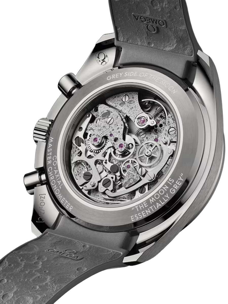 The specially decorated movement is the OMEGA Co-Axial Master Chronometer Calibre 3869, while the engravings on the caseback include the quote, THE MOON IS ESSENTIALLY GREY, which is attributed to Command Module Pilot, Jim Lovell, during the Apollo 8 mission.