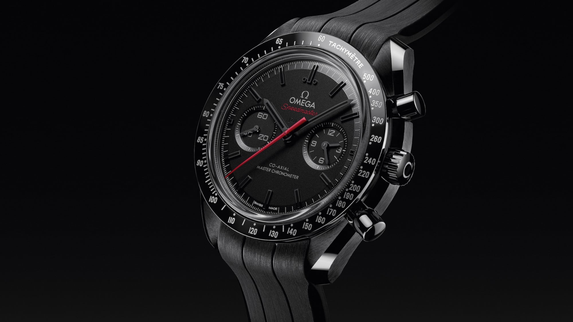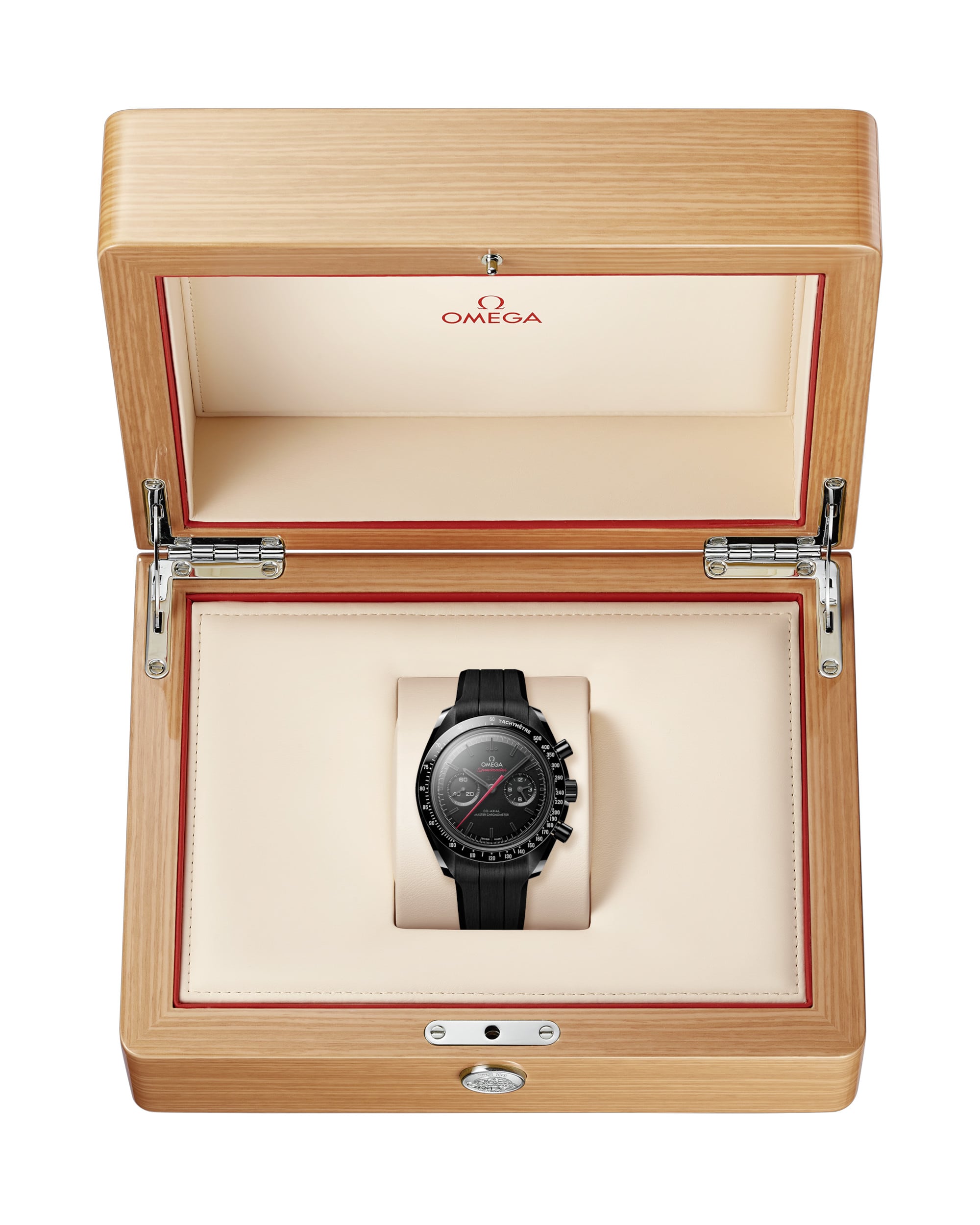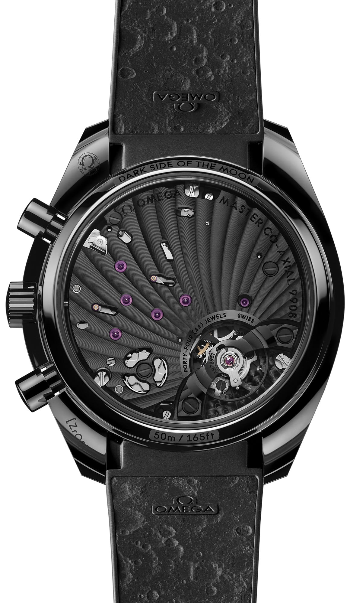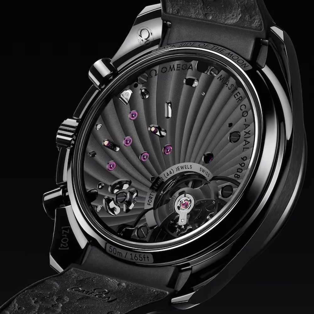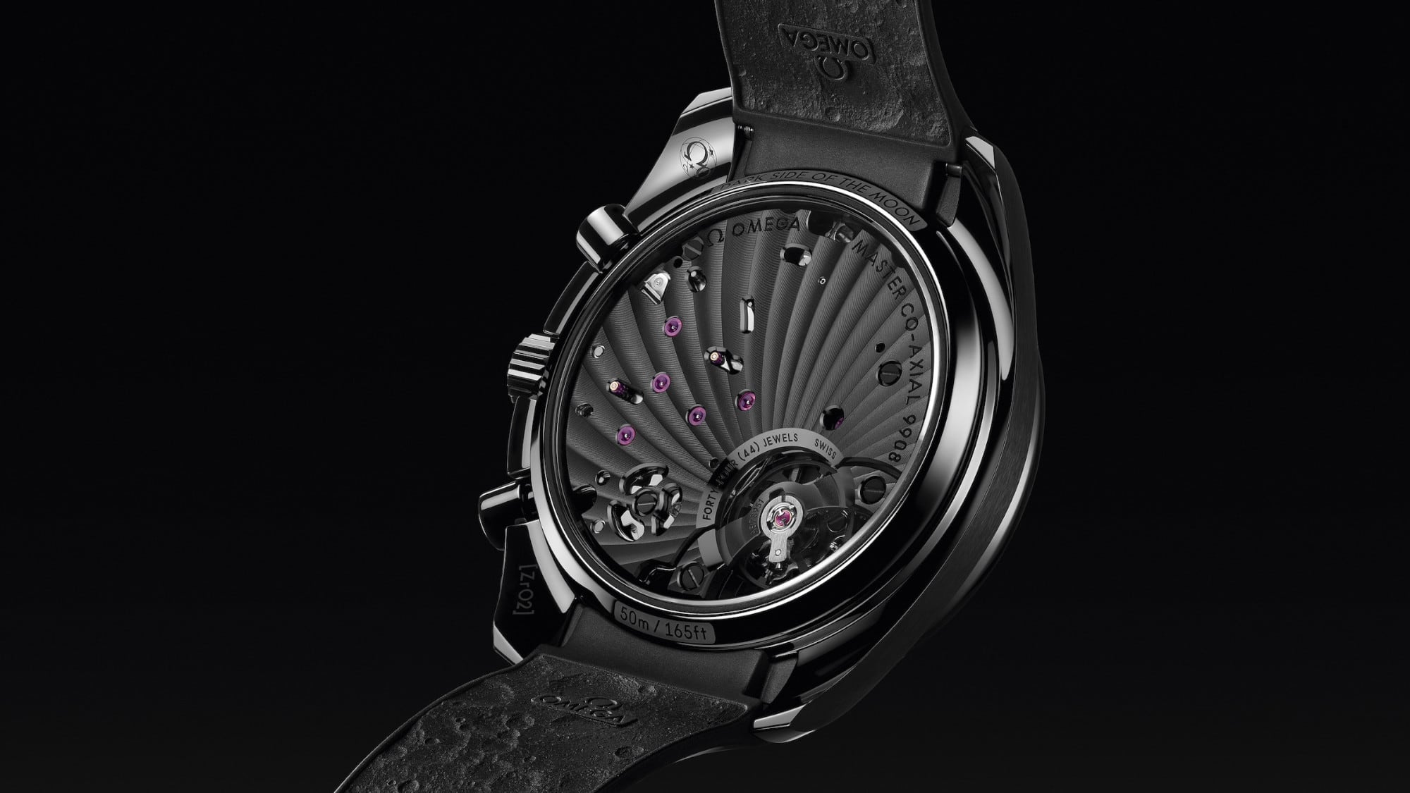 Visible through the caseback, OMEGA's manual-winding Co-Axial Master Chronometer Calibre 9908 has been given a special “black edition” finish , which includes a matte-blackened rotor, main plate and bridges, as well as black varnished engravings. The watch is worn on a black rubber strap with a lunar surface pattern on the underside, a ceramic foldover clasp, and ceramised titanium frame-spring folders.