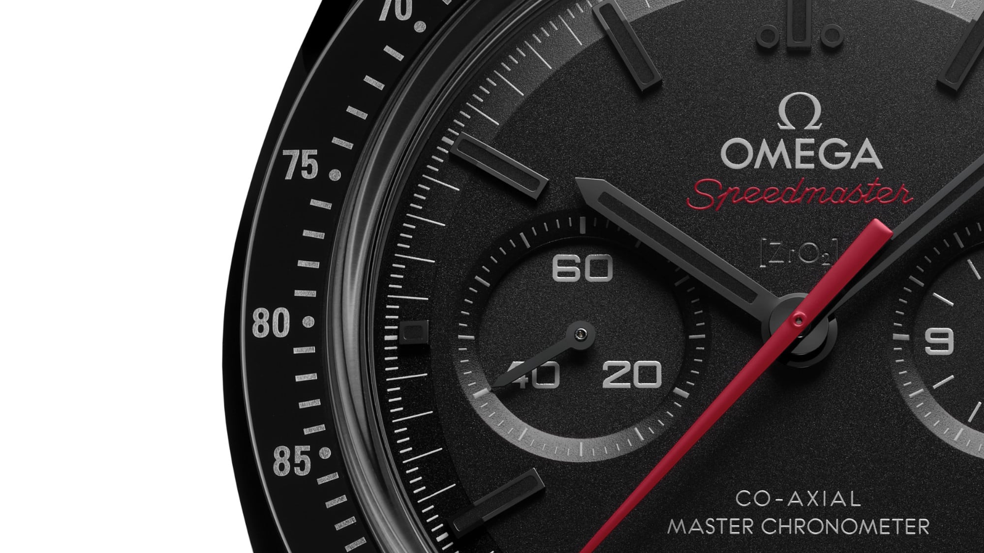 Honouring OMEGA’s legacy of space exploration, this Speedmaster Dark Side of the Moon features a 44.25 mm case in polished-brushed black ceramic. The polished bezel is also made from black ceramic and features a tachymeter scale in Liquidmetal™.