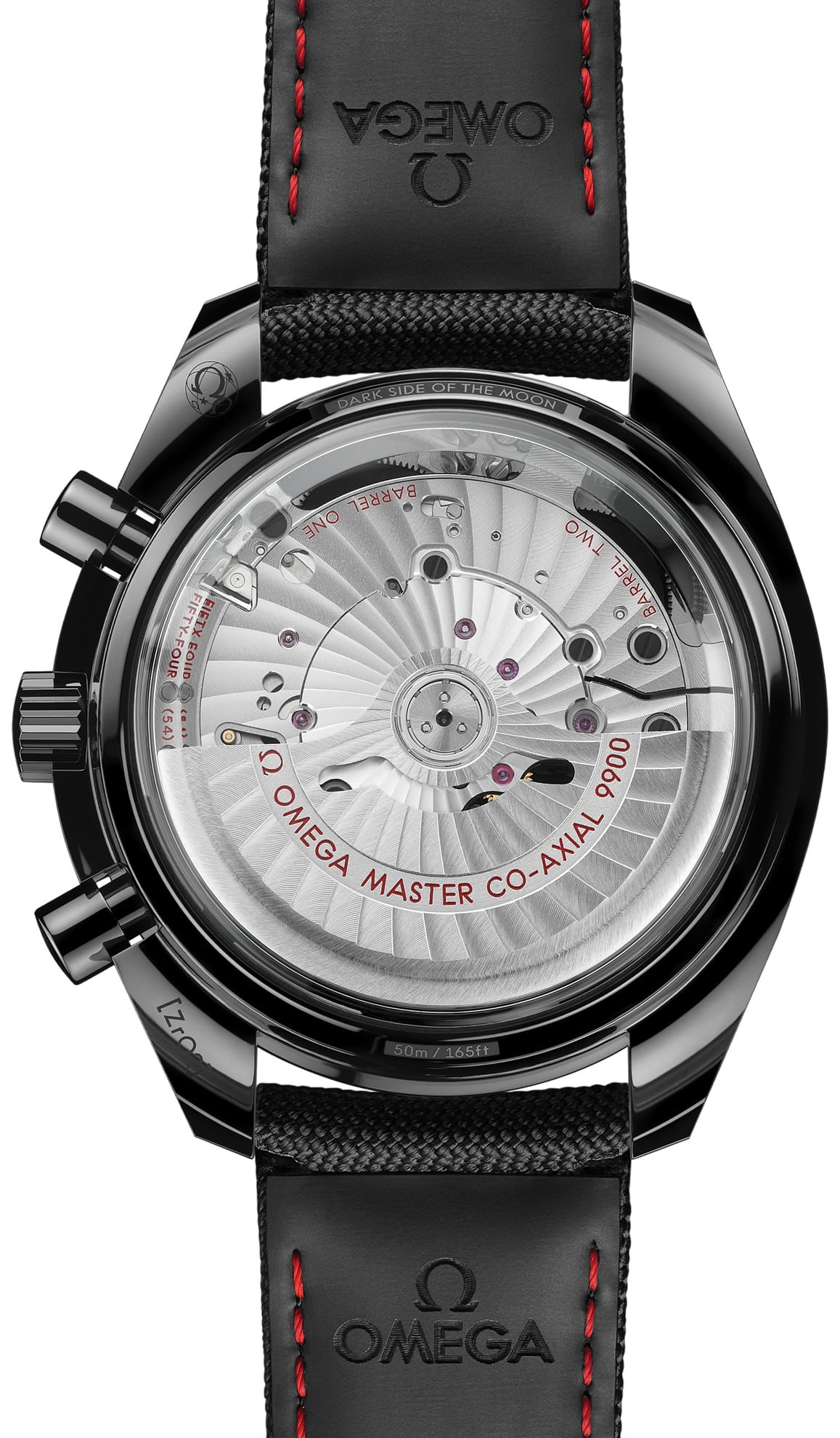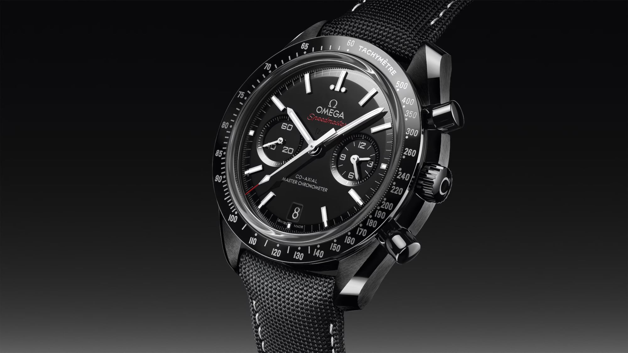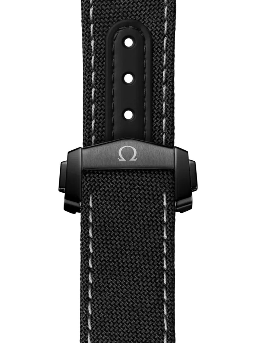 Driven by OMEGA's self-winding Co-Axial Master Chronometer Calibre 9900, this bold timepiece is finished with a black nylon fabric strap that includes black rubber lining, a ceramic foldover clasp, and ceramised titanium frame-spring folders.