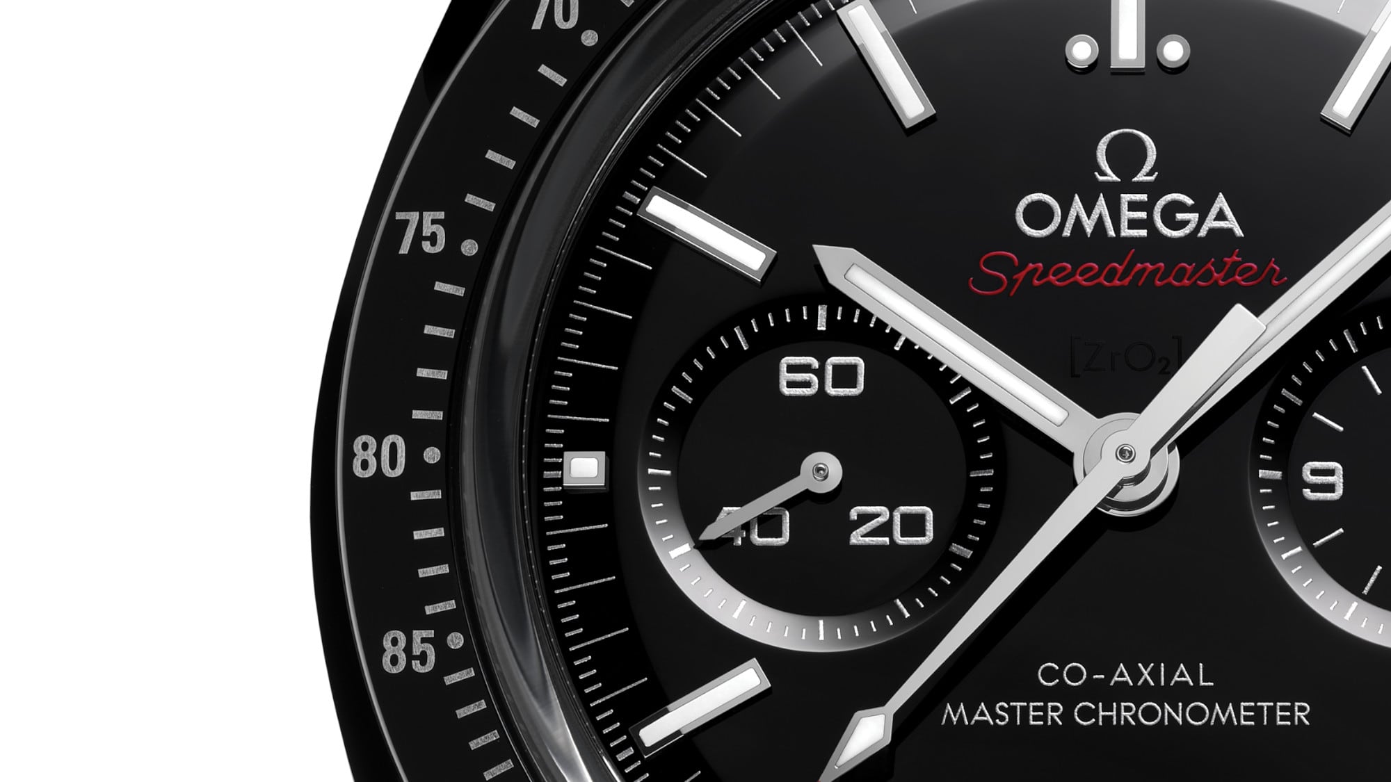 Honouring OMEGA’s legacy of space exploration, this Speedmaster Dark Side of the Moon features a 44.25 mm case in polished-brushed black ceramic. The polished bezel is also made from black ceramic and features a tachymeter scale in Liquidmetal™.