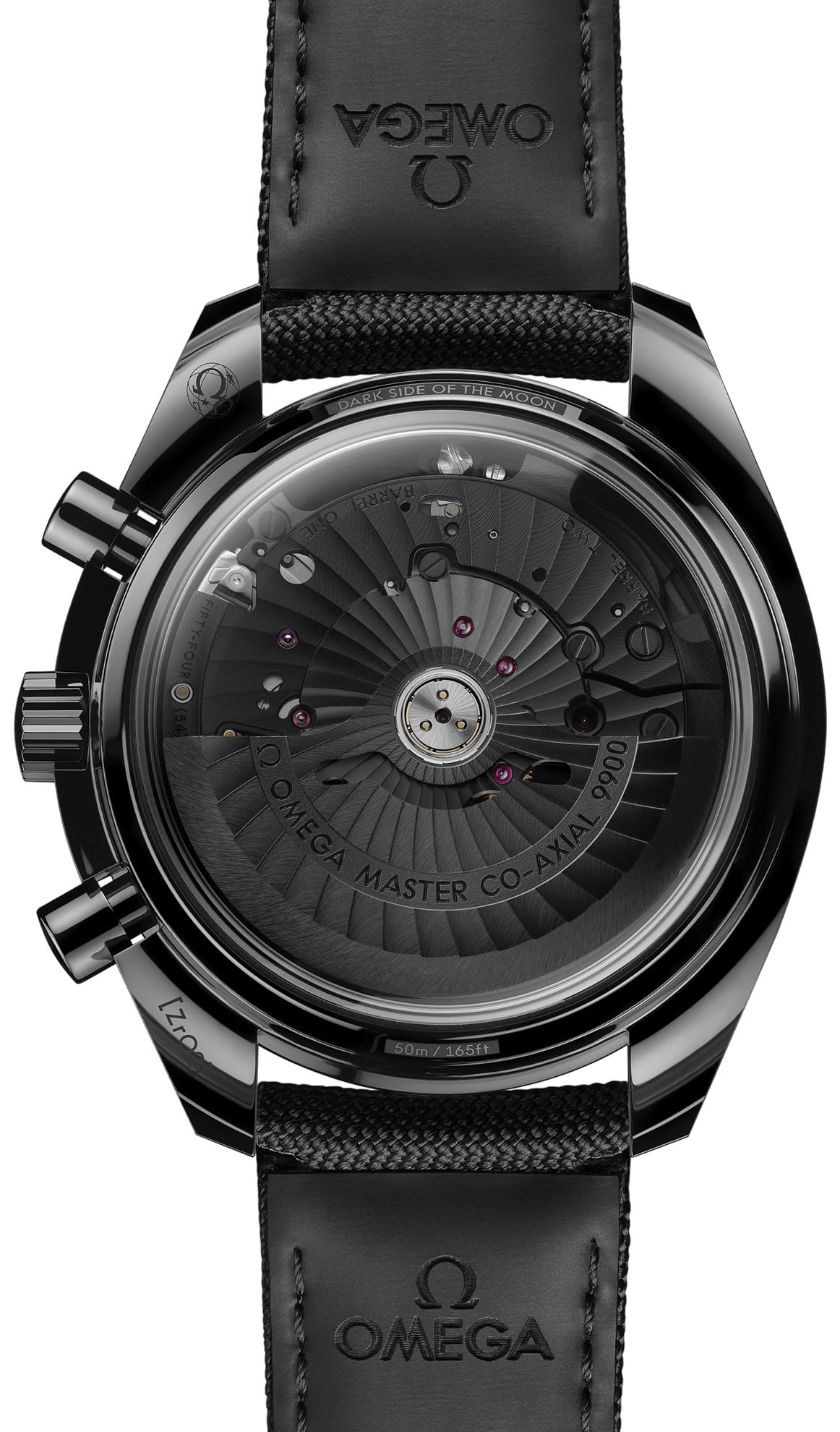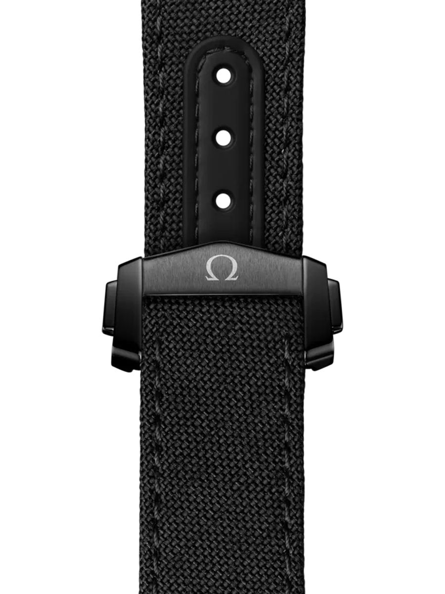 Visible through the caseback, OMEGA's self-winding Co-Axial Master Chronometer Calibre 9900 has been given a special finish with a matte-blackened rotor, main plate and bridges, as well as black varnished engravings. The watch is worn on a black nylon fabric strap that includes a ceramic foldover clasp and ceramised titanium frame-spring folders.