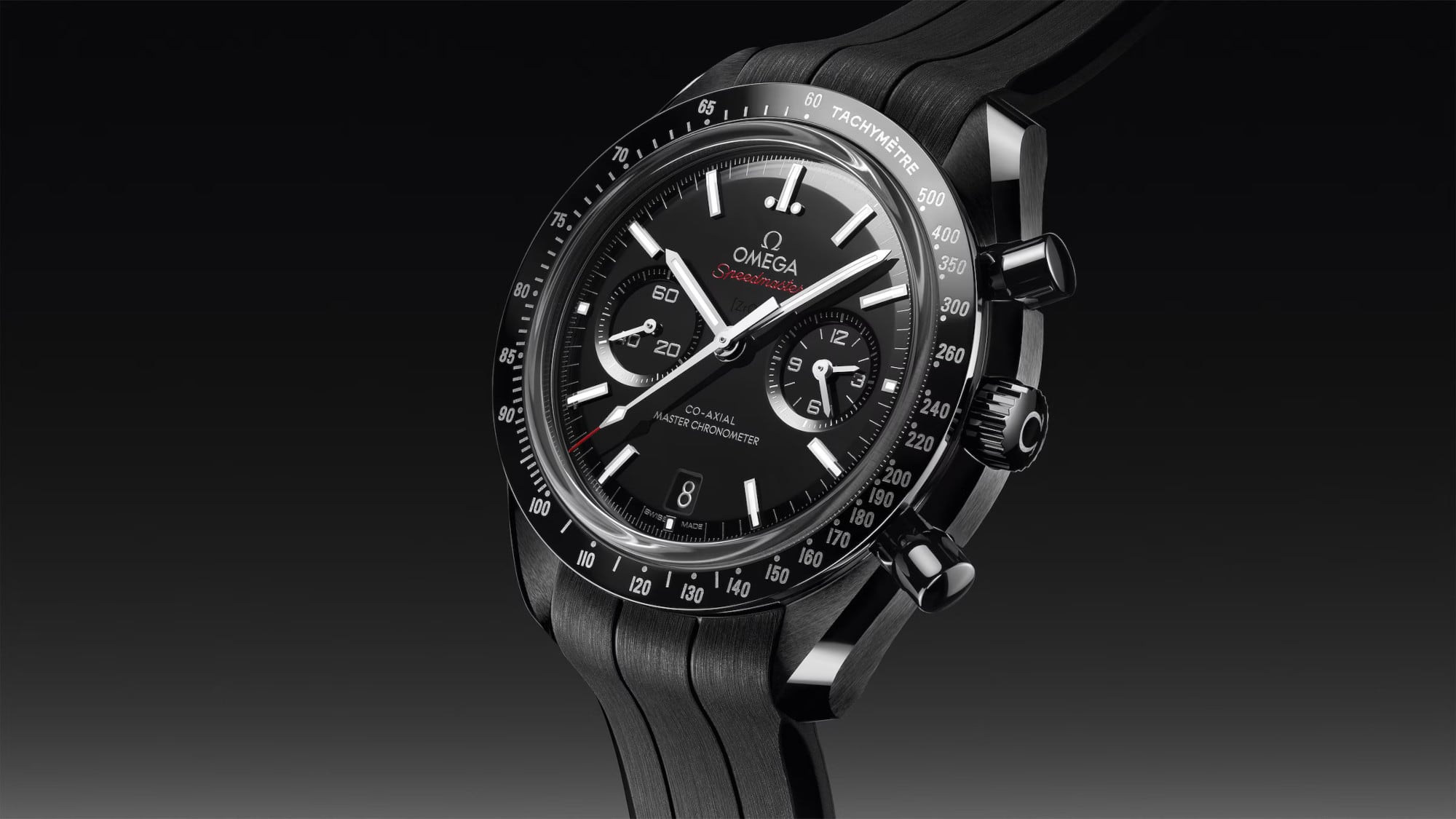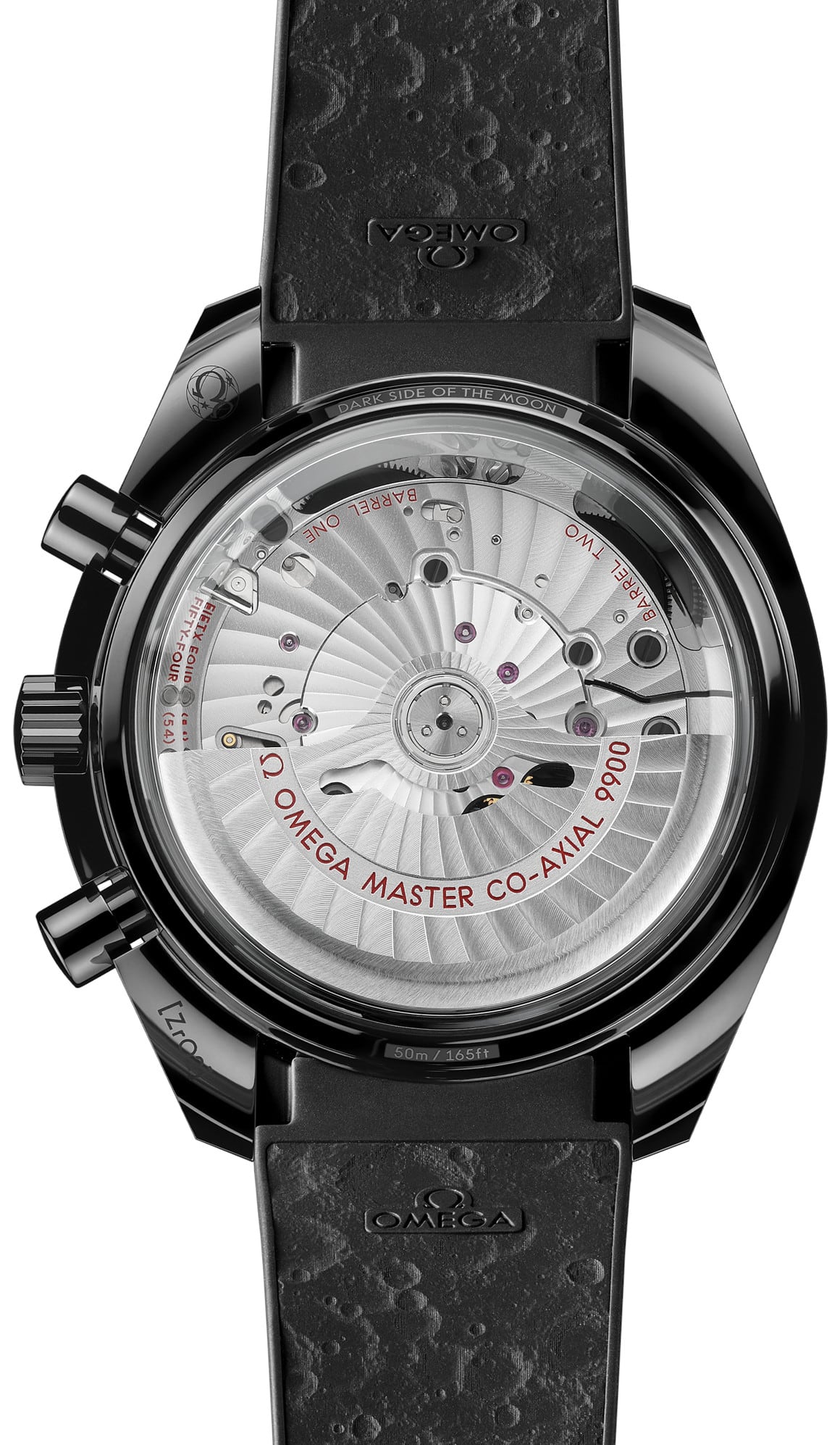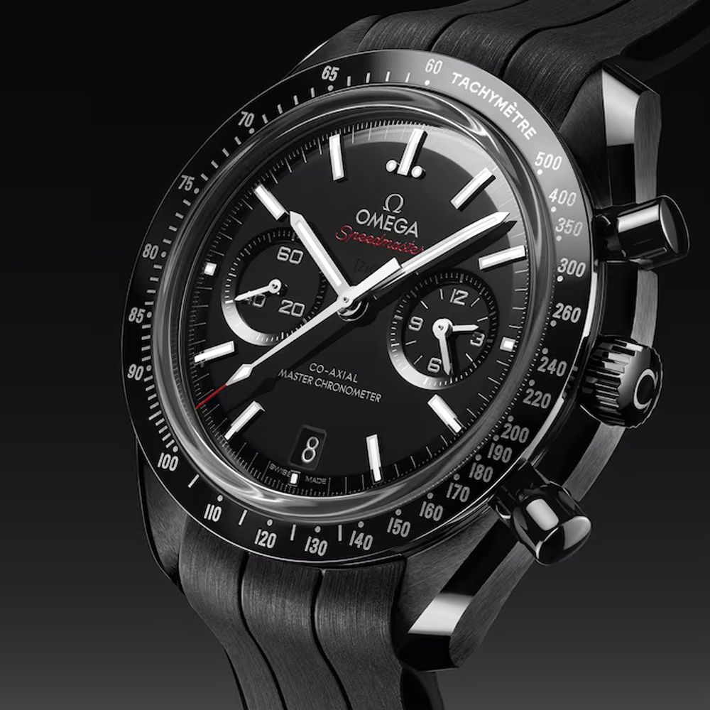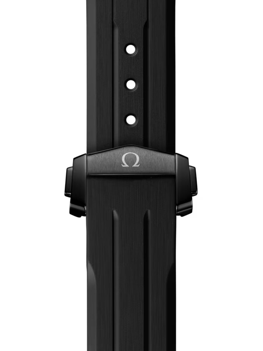 Driven by OMEGA's self-winding Co-Axial Master Chronometer Calibre 9900, this bold timepiece is finished with a black rubber strap with a lunar surface pattern on the underside, a ceramic foldover clasp, and ceramised titanium frame-spring folders.