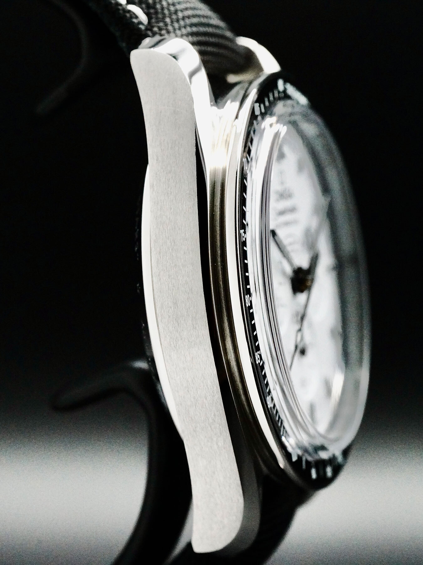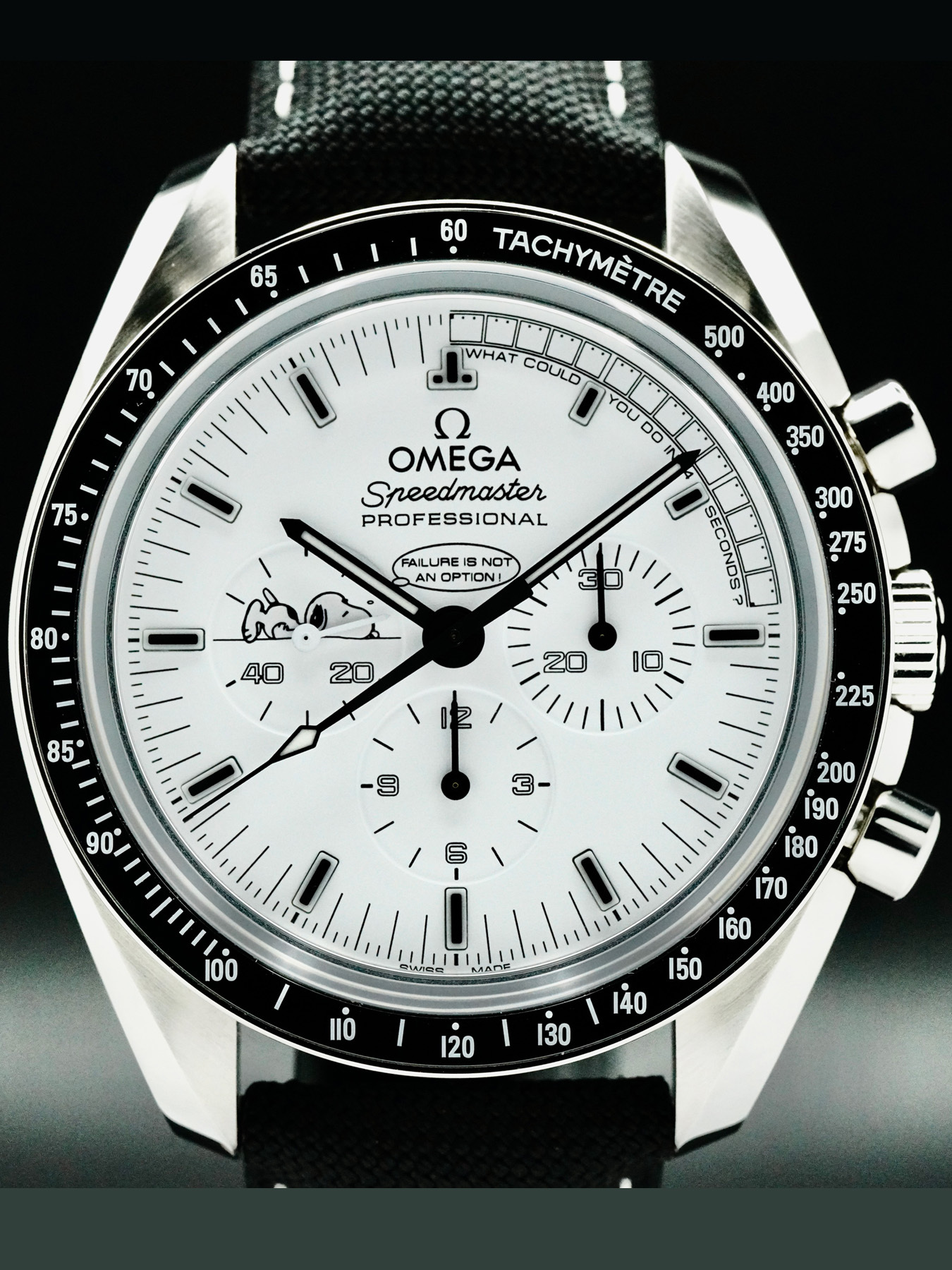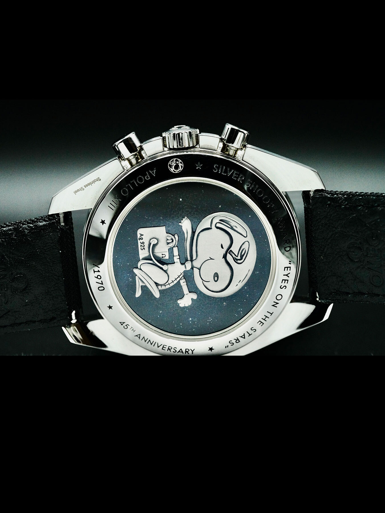 For the 45th anniversary, this inspired "Moonwatch" has been created in a Limited Edition series of 1,970 pieces. The design has been refreshed with a white dial that features a Super-LumiNova Snoopy on the 9 o'clock subdial.