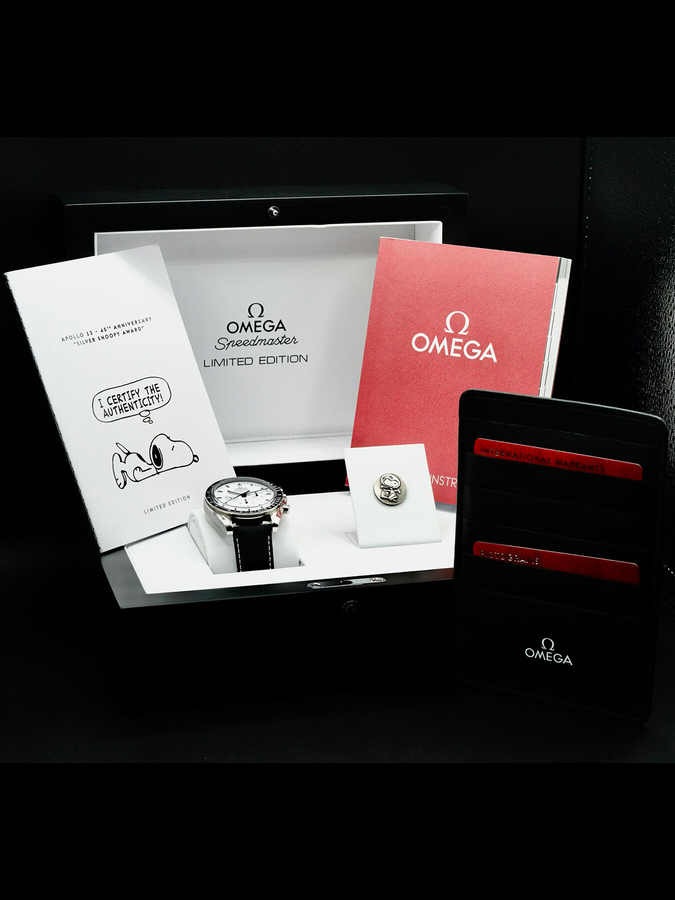 This Omega Speedmaster Snoopy Apollo Anniversary Series 311.32.42.30.04.003 is in EXCELLENT condition. This watch includes its original box, operating instructions, certificate of authenticity, and international warranty dated for December 2016. This watch has been fully authenticated and certified by Exquisite Timepieces.