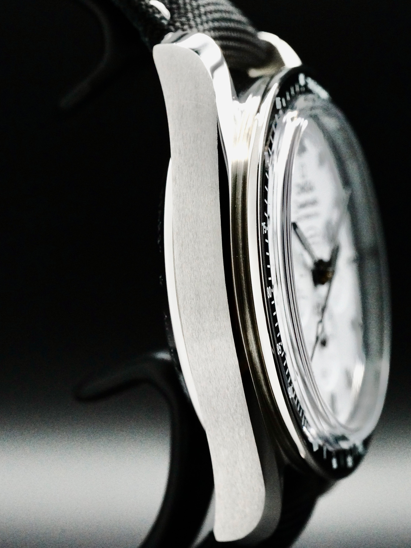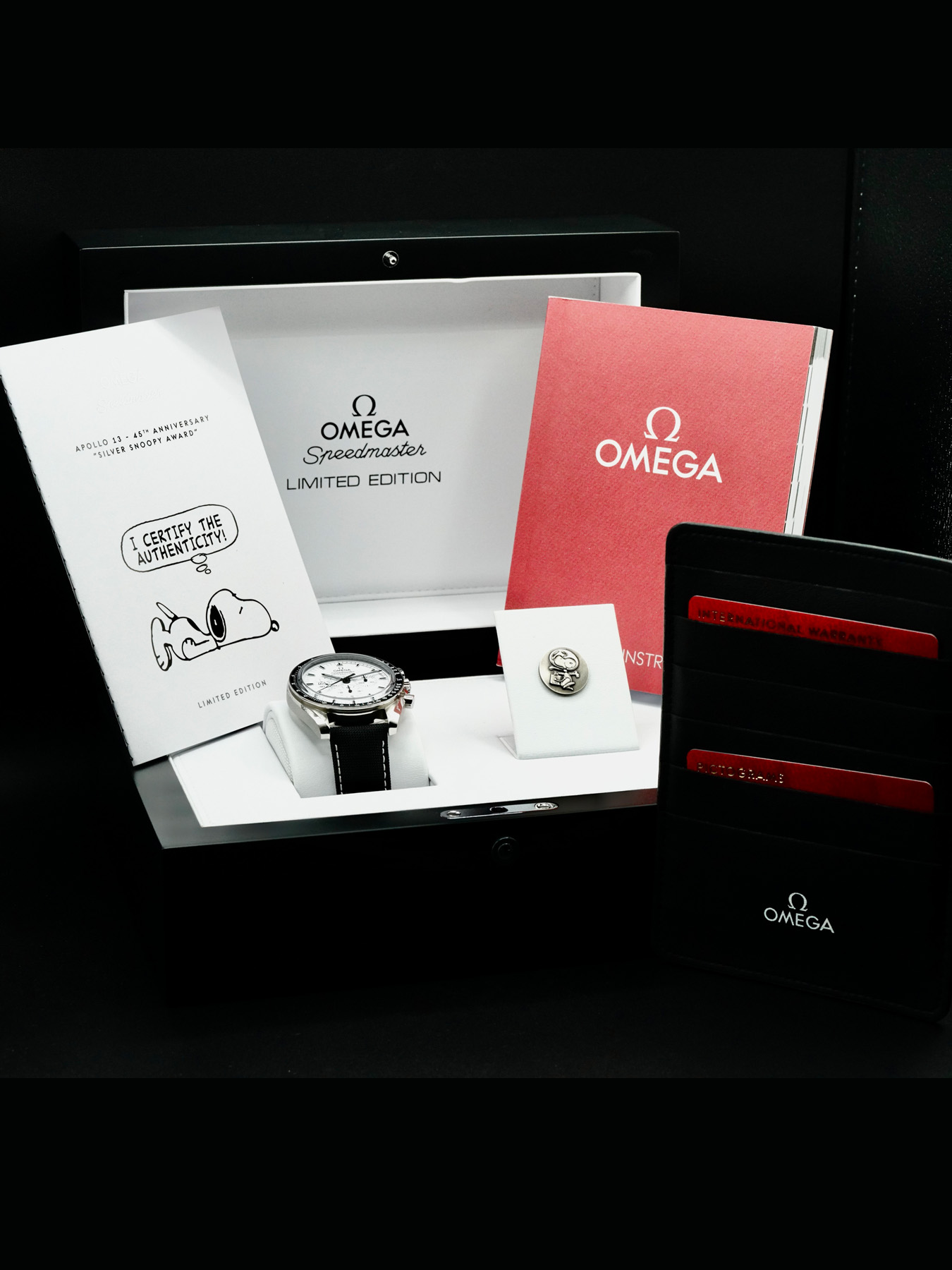 For the 45th anniversary, this inspired "Moonwatch" has been created in a Limited Edition series of 1,970 pieces. The design has been refreshed with a white dial that features a Super-LumiNova Snoopy on the 9 o'clock subdial.