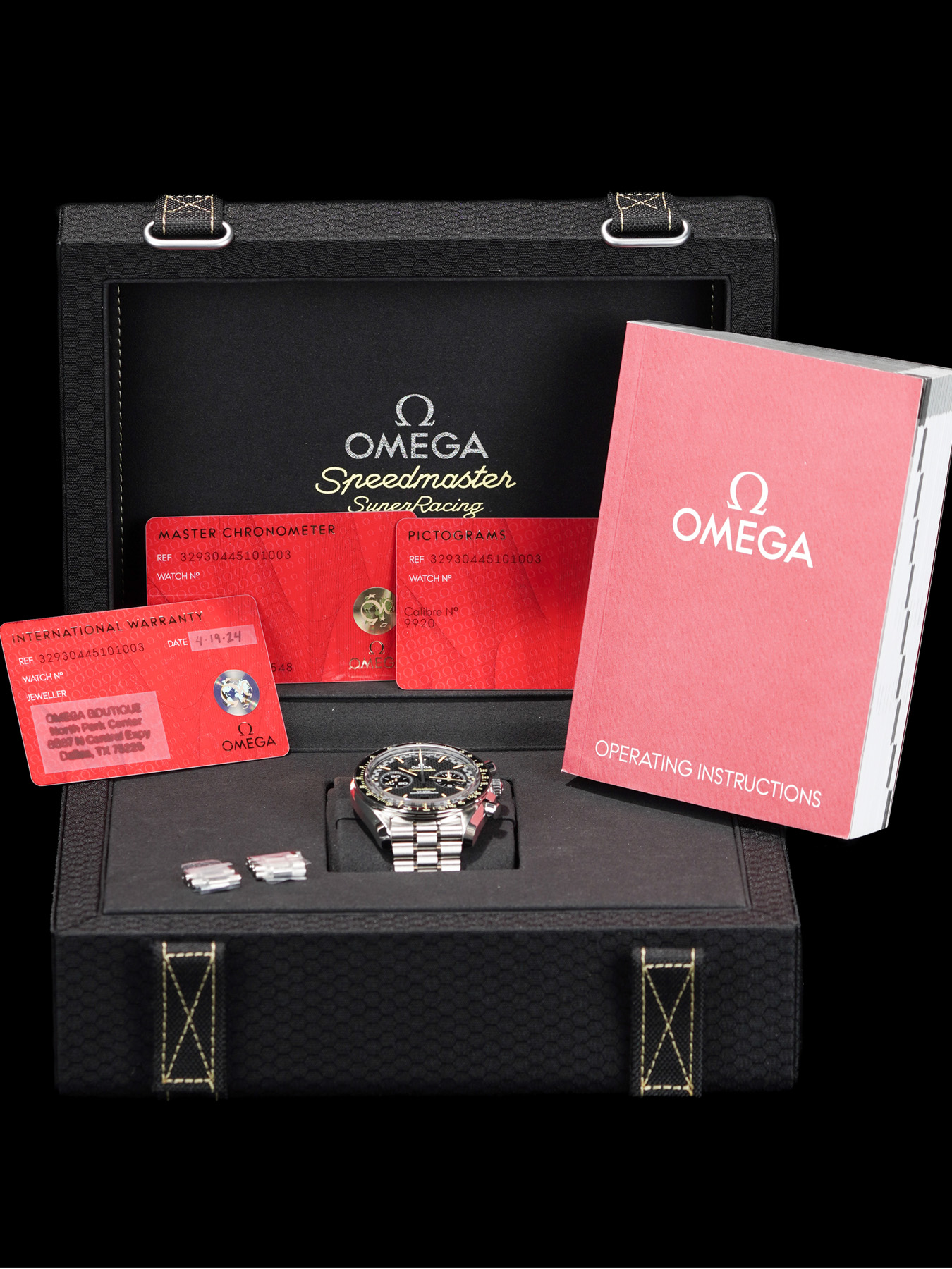 This Omega 329.30.44.51.01.003 Speedmaster Super Racing is in GREAT condition. This watch includes its Original Box, Warranty Card Dated April 2024 and Extra Bracelet Link. This watch has been fully authenticated and certified by Exquisite Timepieces.