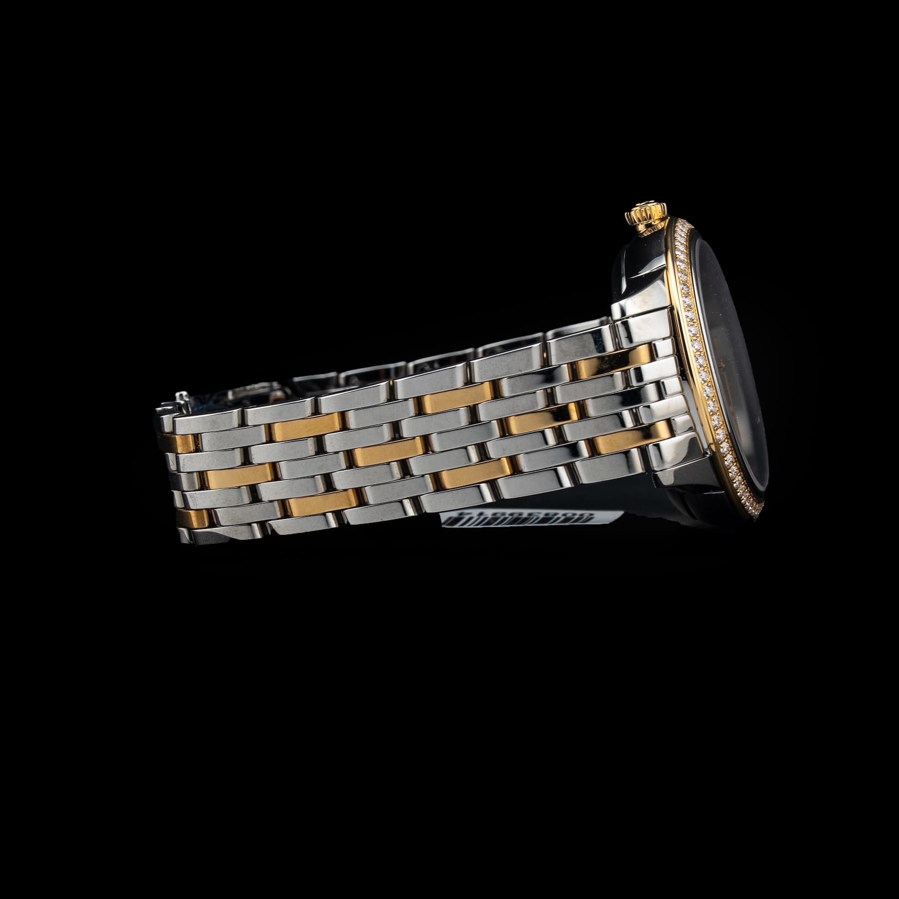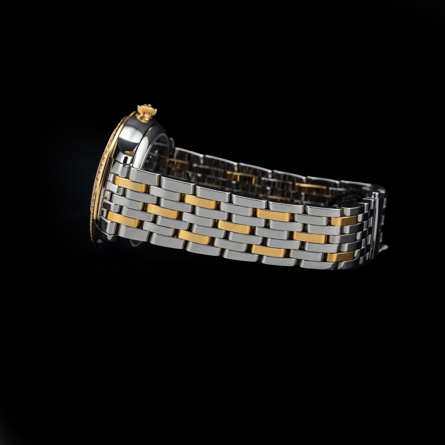 - This timepiece features a 34mm gold and steel case paired with a high quality steel bracelet. It showcases a distinctive yellow dial and is powered by a precise automatic winding movement. The watch is designed with a water resistance of up to 30m.