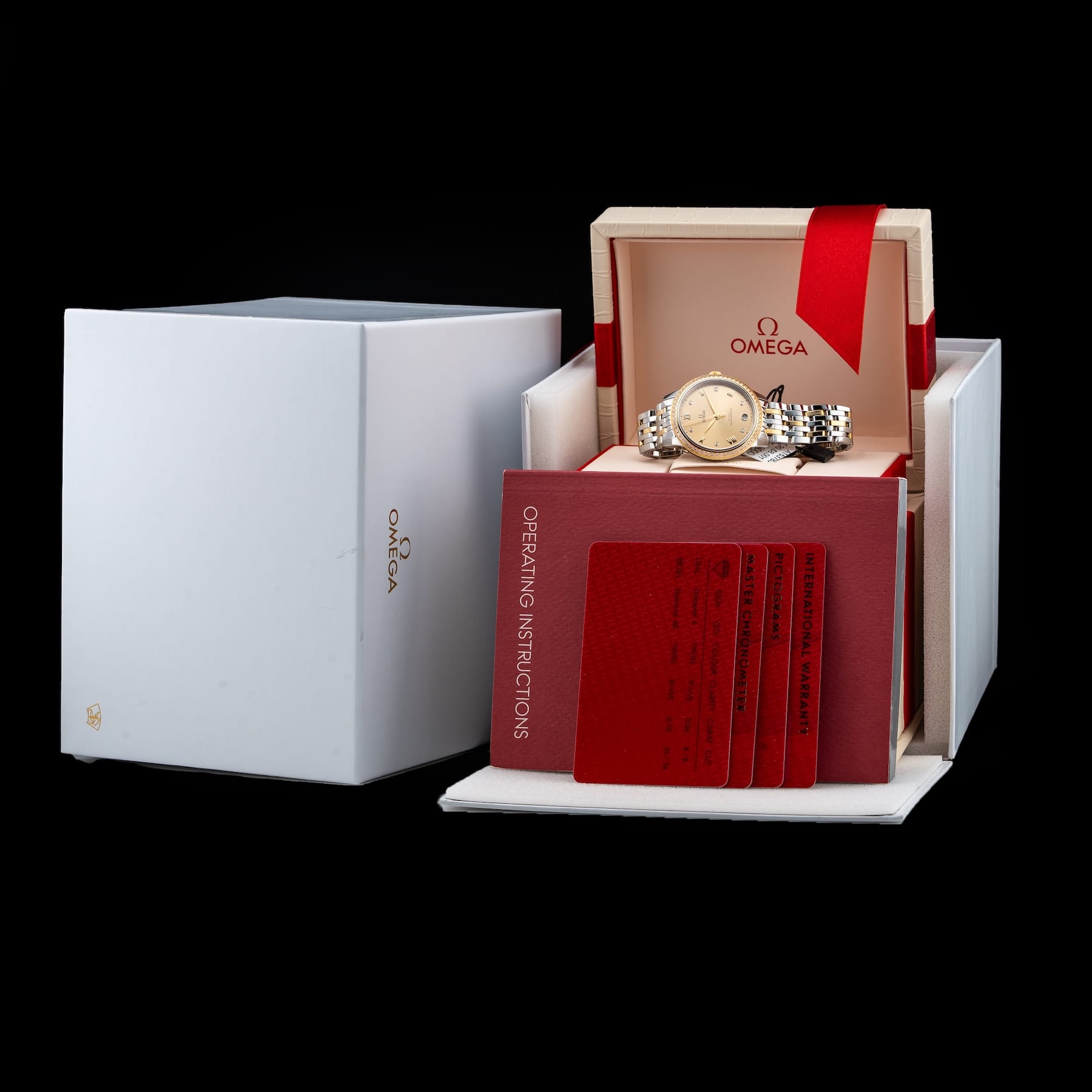 This Omega 434.25.34.20.58.001 De Ville Prestige 34mm Yellow Gold on Steel is in GREAT condition, it has box, papers and warranty card. This watch has been fully authenticated and certified by Exquisite Timepieces. Please note, the photos shown are of the actual watch you will receive.
