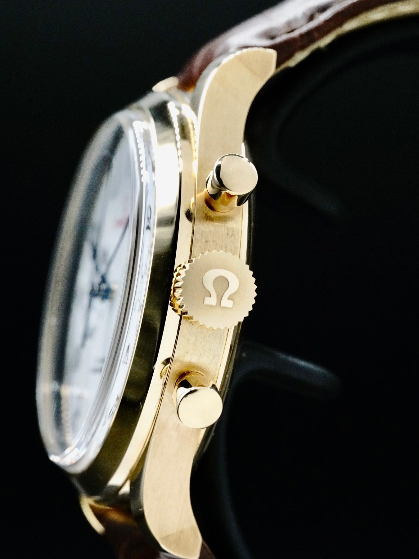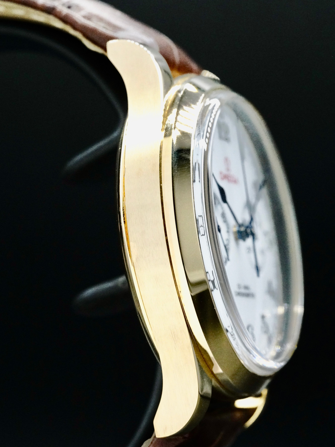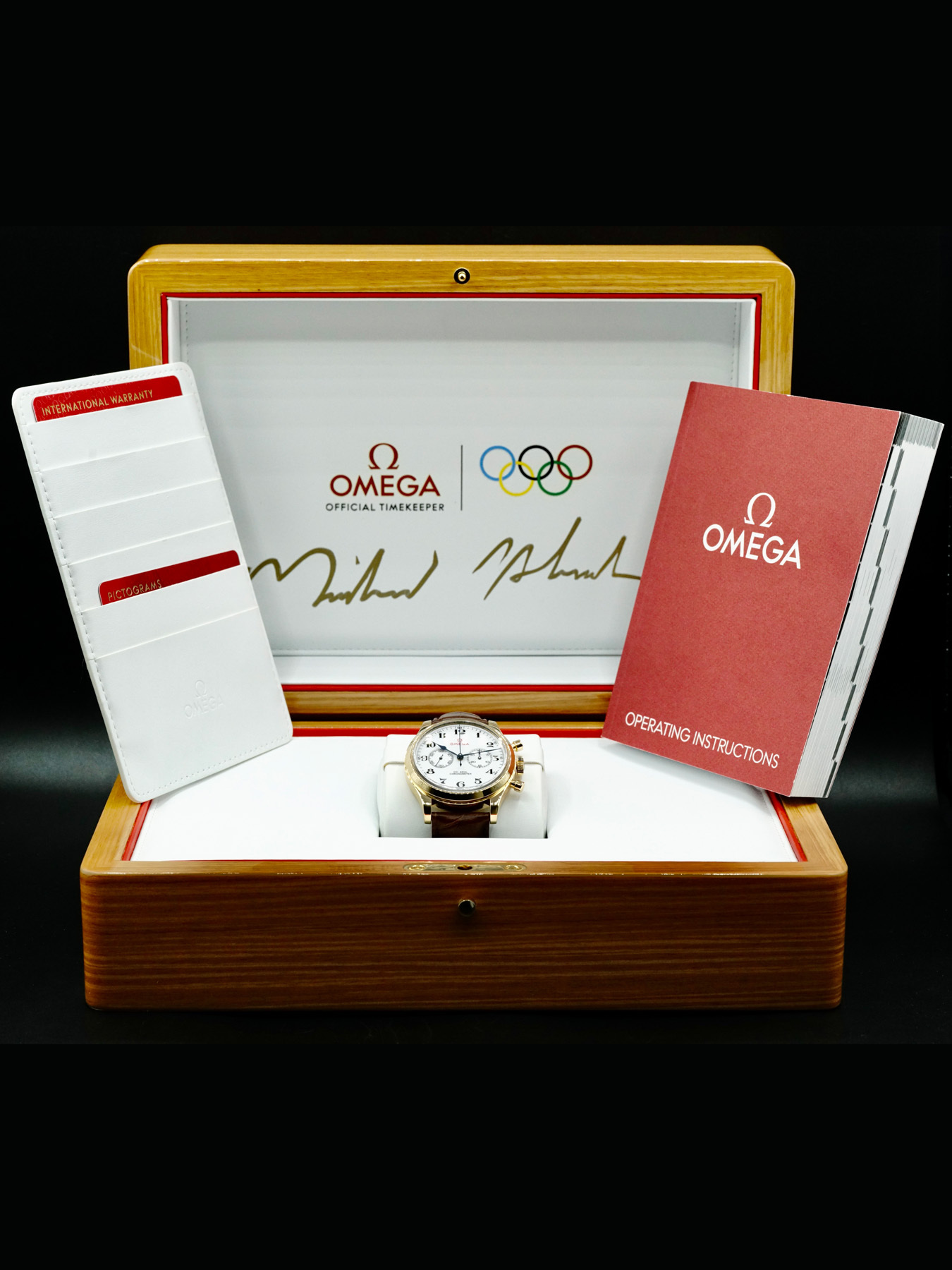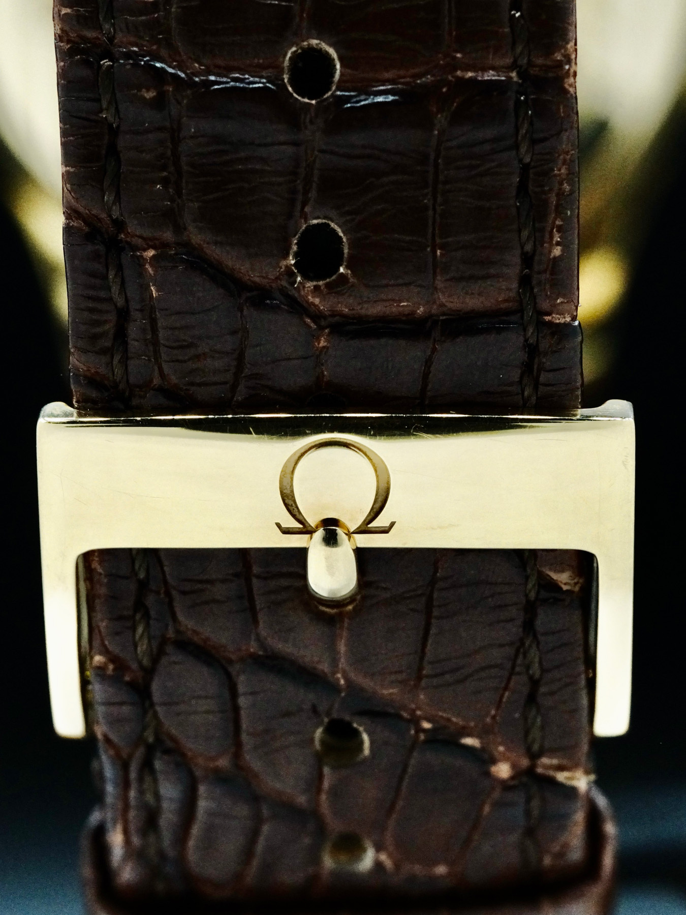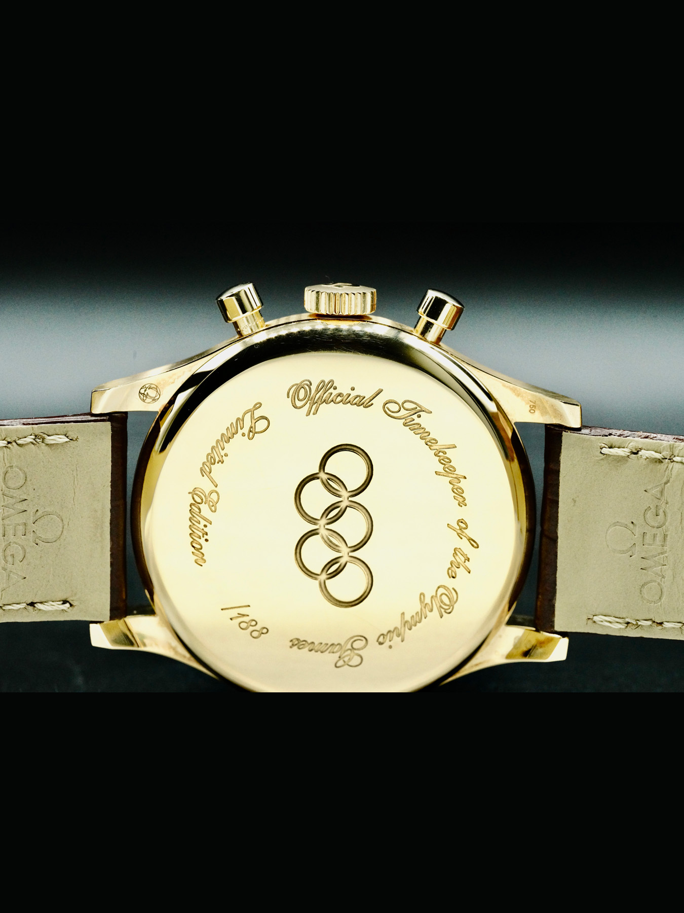 This Omega Olympic Official Timekeeper features a 39mm 18k yellow gold case with a display case back on a brown leather strap. This watch also sports a white enamel dial with blue steel hands and Arabic numeral dial markers covered by scratch resistant sapphire crystal.