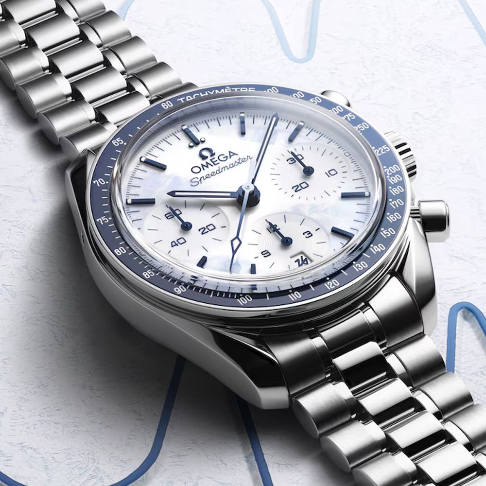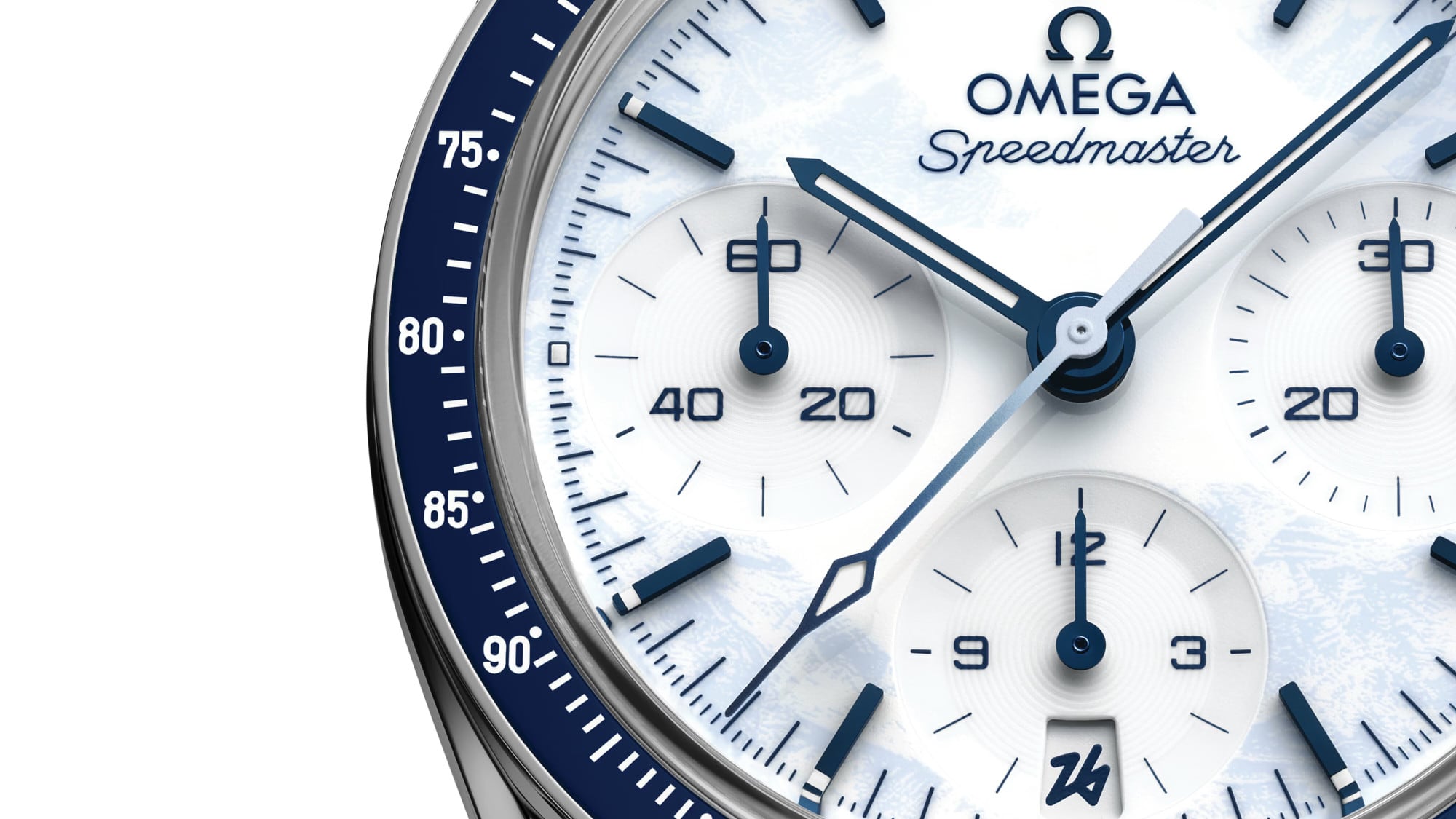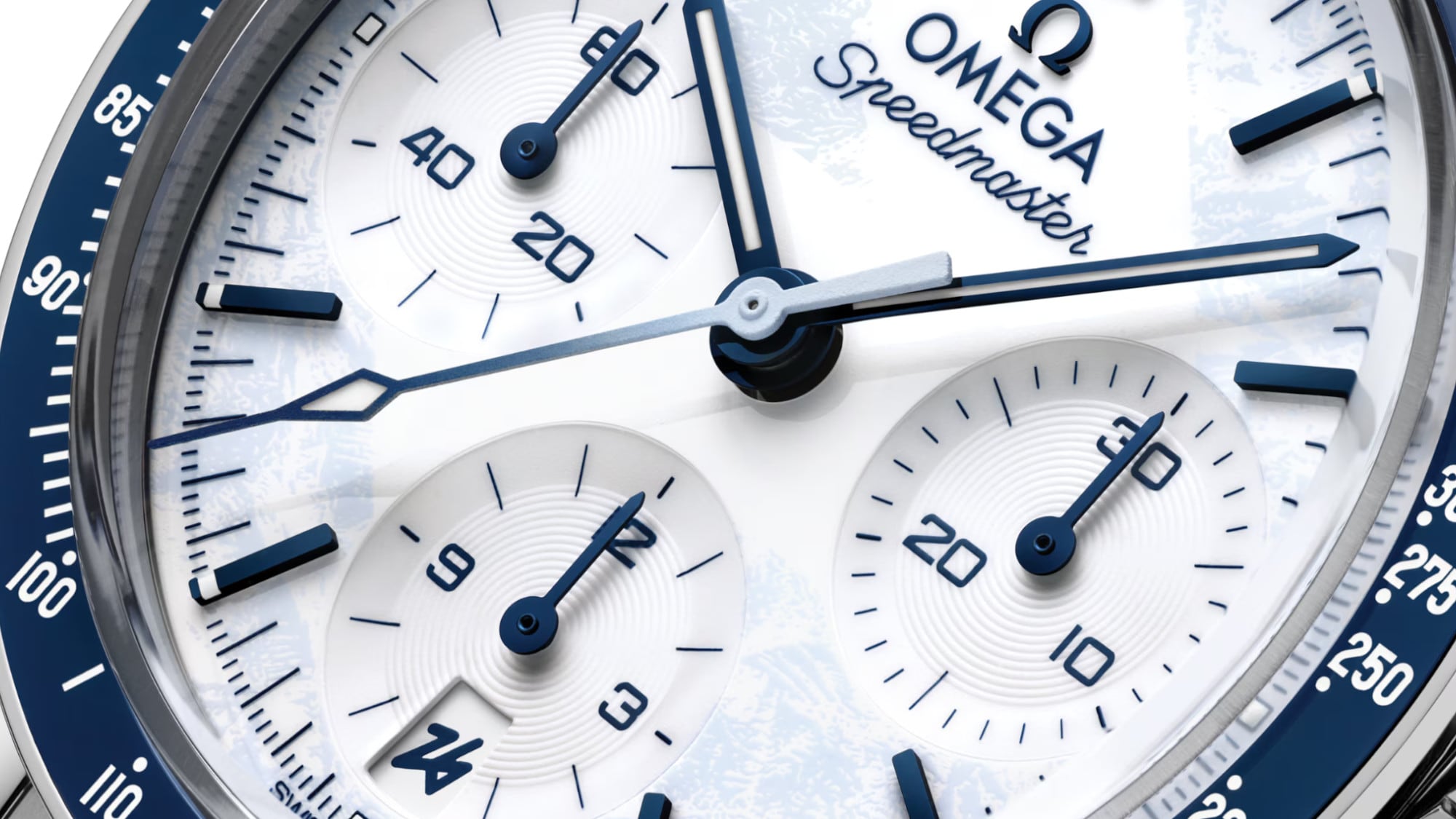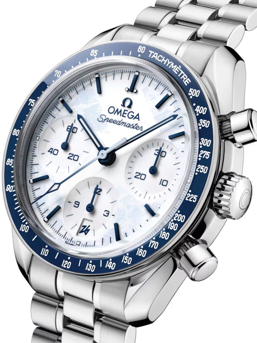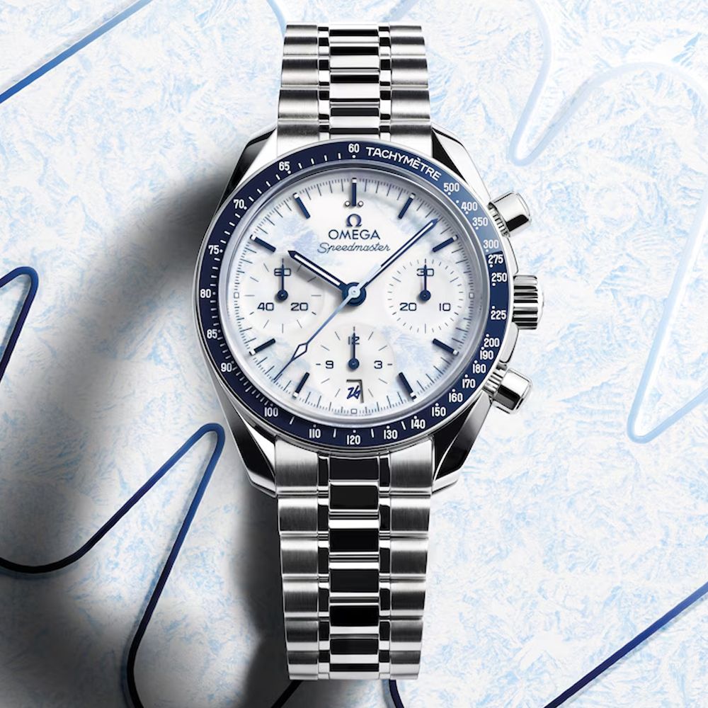 The 38 mm watch is crafted in stainless steel with a blue ceramic bezel that features a white enamel tachymeter scale. To create a wintry look, the varnished white dial includes a frosted blue transfer and finger trace pattern inspired by the Milano Cortina 2026 emblem. The white subdials are also varnished, with a special azurage finish that resembles a groomed ski slope.