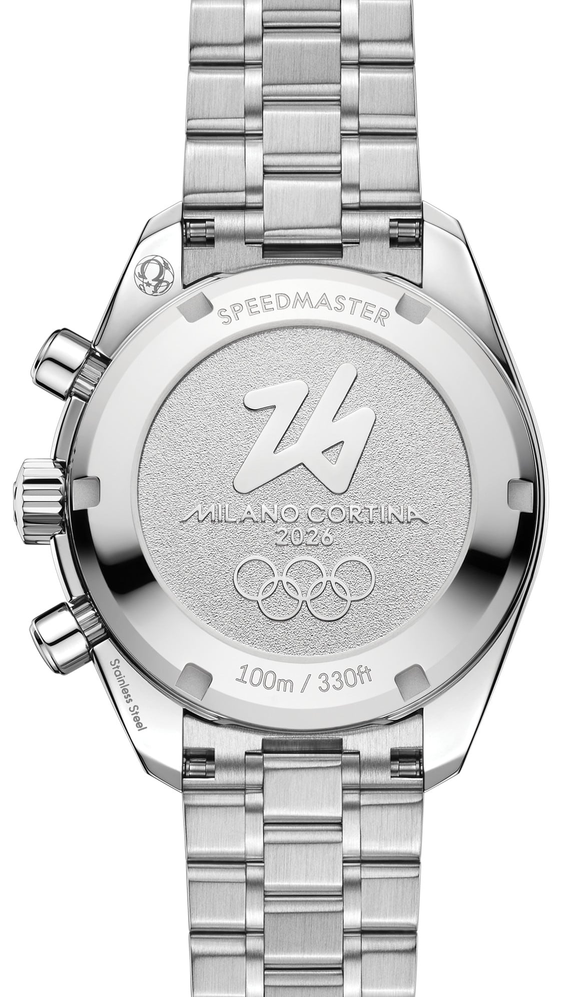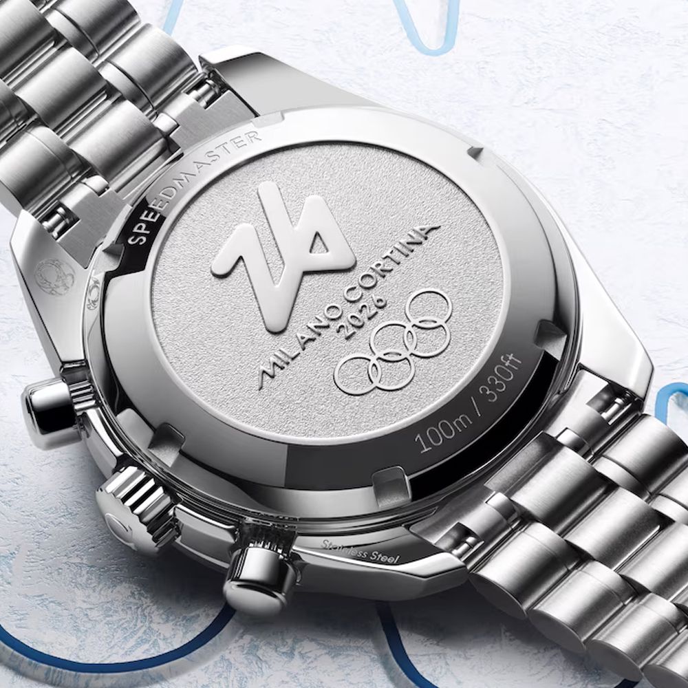 Additional details of interest include the central seconds hand, with its blue gradient, as well as the dark blue Milano Cortina typography that appears in the date window. On the caseback, OMEGA has added a stamped Milano Cortina 2026 medallion.