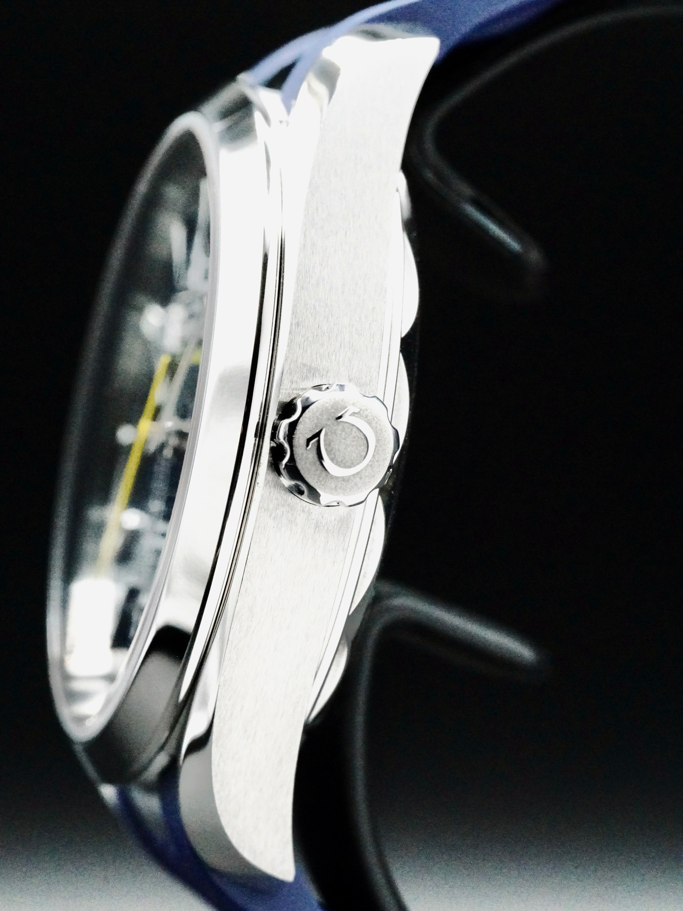 This Omega Aqua Terra 150M features a 41mm stainless steel case with an exhibition case back on a blue rubber strap. This watch also sports a blue dial with luminous hands and index dial markers covered by scratch resistant sapphire crystal.