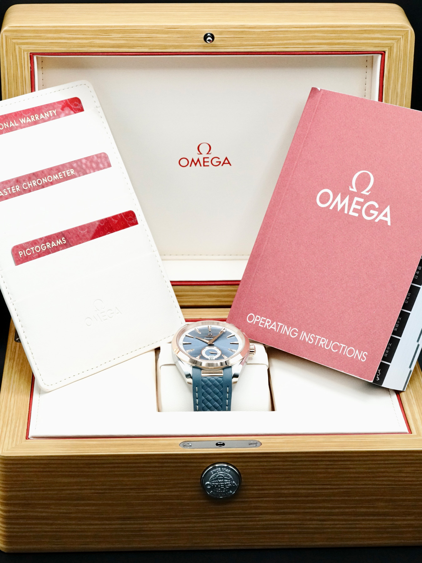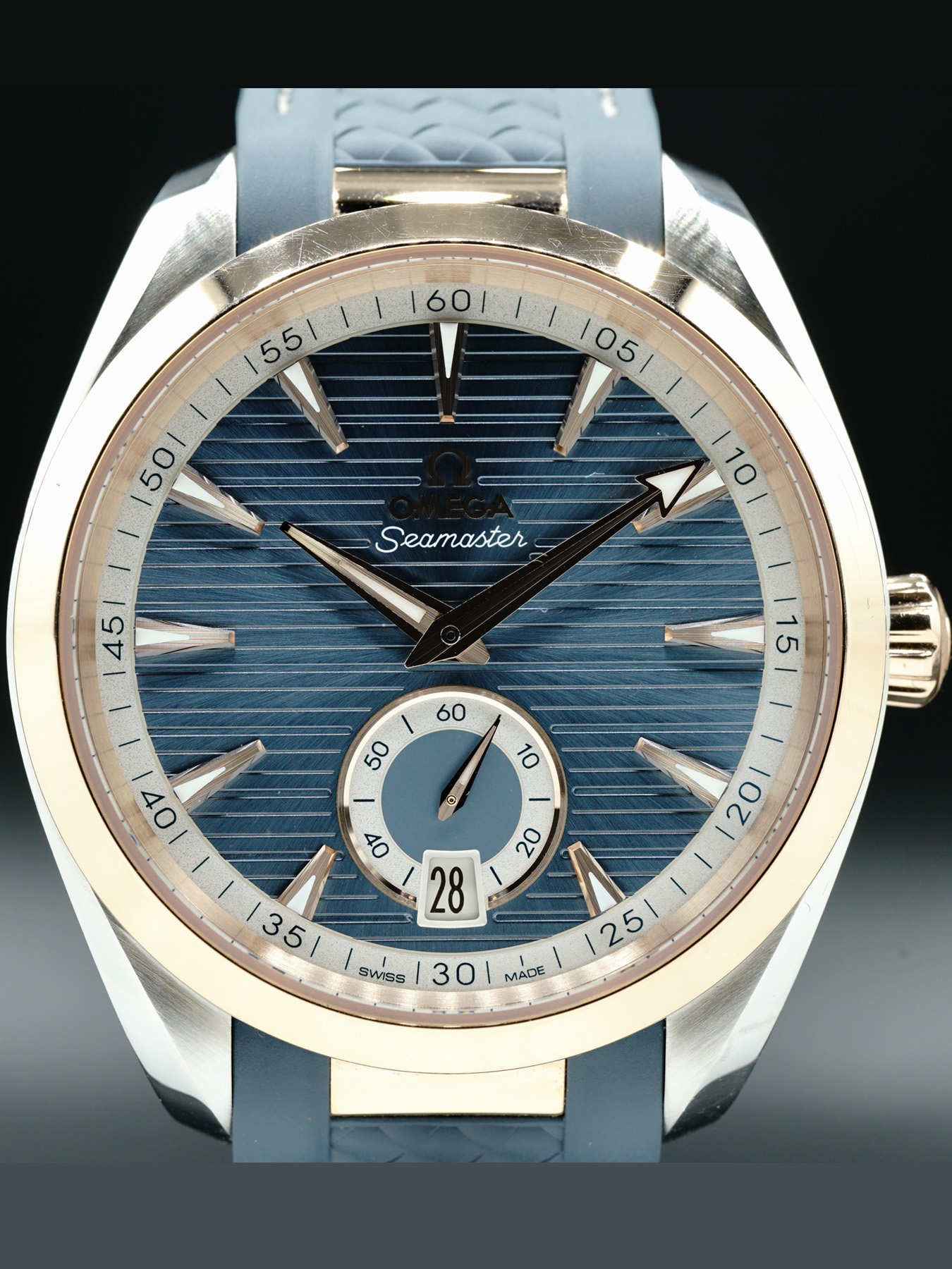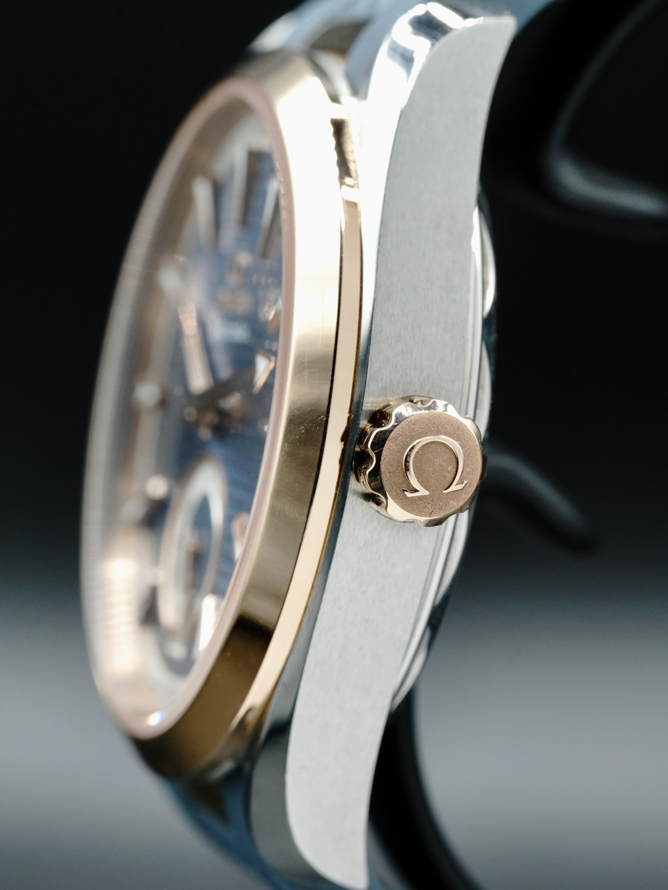 This Omega Seamaster Aqua Terra 150M features a 41mm stainless steel case with an 18k Sedna Gold bezel on a blue rubber strap. This watch also sports a blue dial with luminous gold-tone hands and index dial markers covered by scratch resistant sapphire crystal.