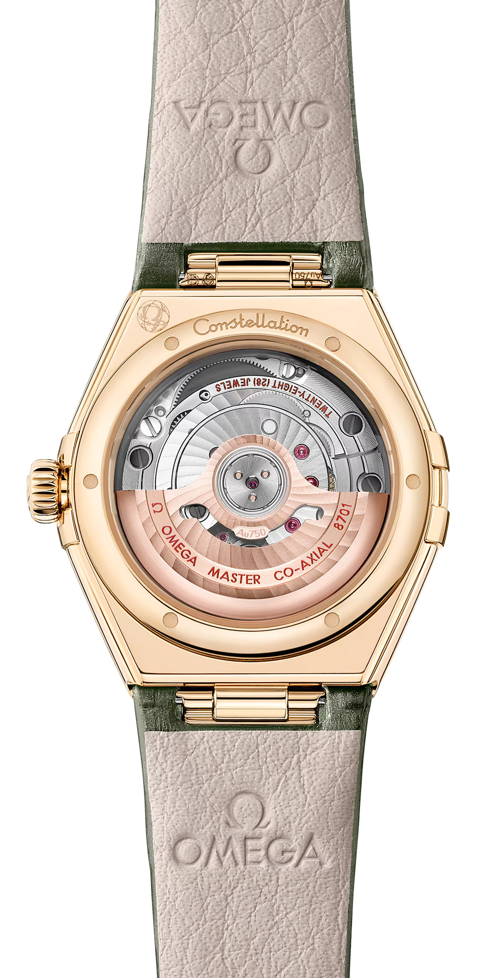 The watch is presented on a shimmering green leather strap, and is powered by the OMEGA Co-Axial Master Chronometer Calibre 8701, which is visible through the sapphire crystal caseback.