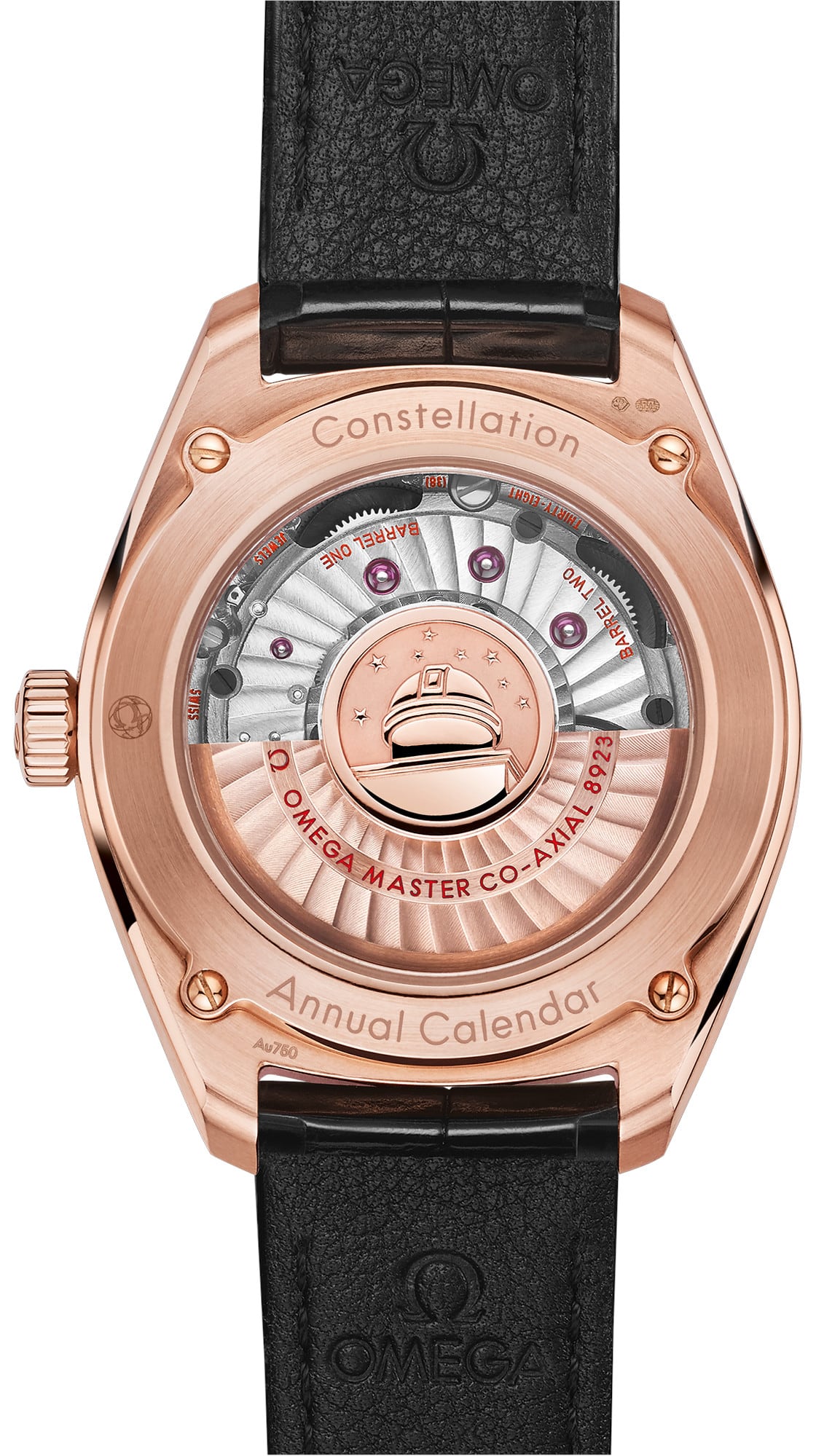 This watch has a glossy black leather strap and is driven by OMEGA's Co-Axial Master Chronometer Annual Calendar Calibre 8923, featuring revolutionary anti-magnetic technology.