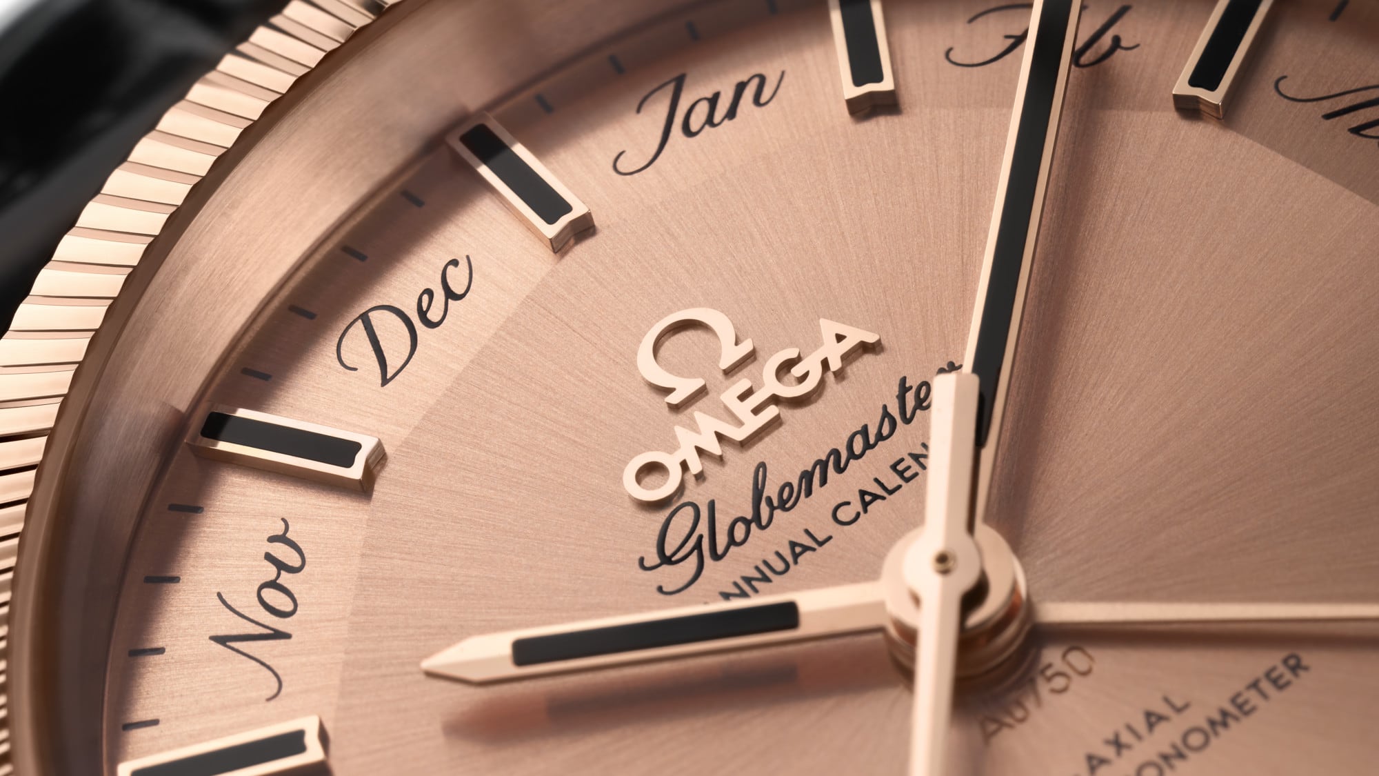 The sun-brushed 18K Sedna™ Gold "Pie Pan" dial marked "Au750" is reminiscent of the first 1952 Constellation model. Each of its facets includes a month of the year in keeping with the Annual Calendar function. There is an 18K Sedna™ Gold Constellation star and OMEGA logo. The 18K Sedna™ Gold facetted hour and minute hands, and indexes, are set with black onyx.