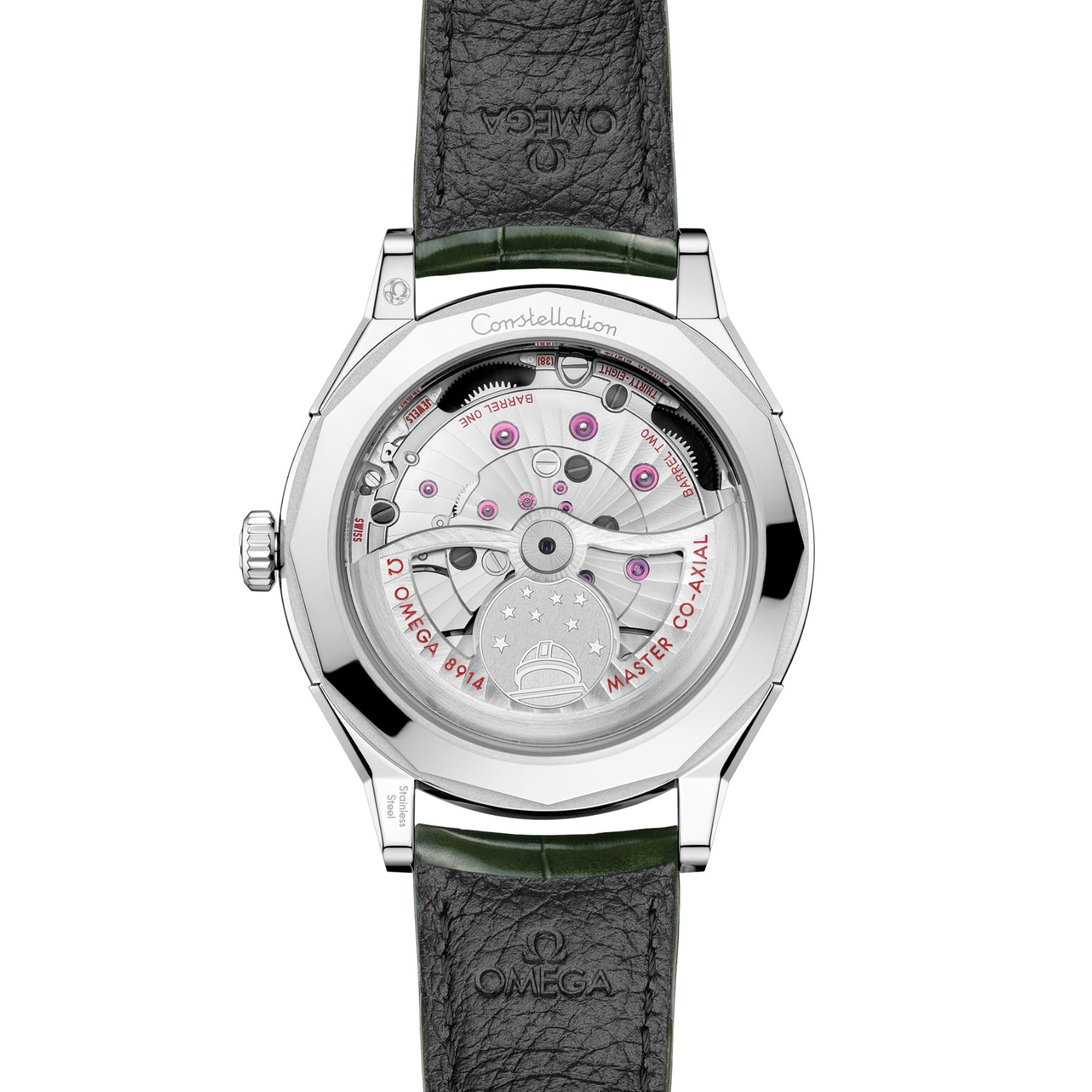 The watch is driven by OMEGA’s calibre 8914, the world’s first two-hand watch to achieve Master Chronometer certification approved by METAS. The movement is visible through the sapphire crystal caseback, revealing a rhodium-plated skeletonised rotor embellished by an applied medallion featuring the laser-engraved Constellation Observatory emblem in contrasting finish.