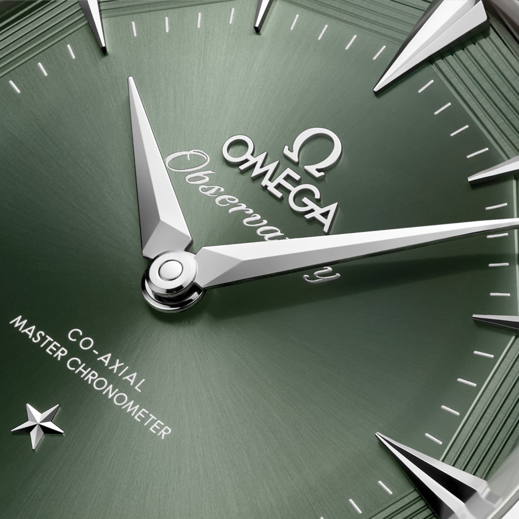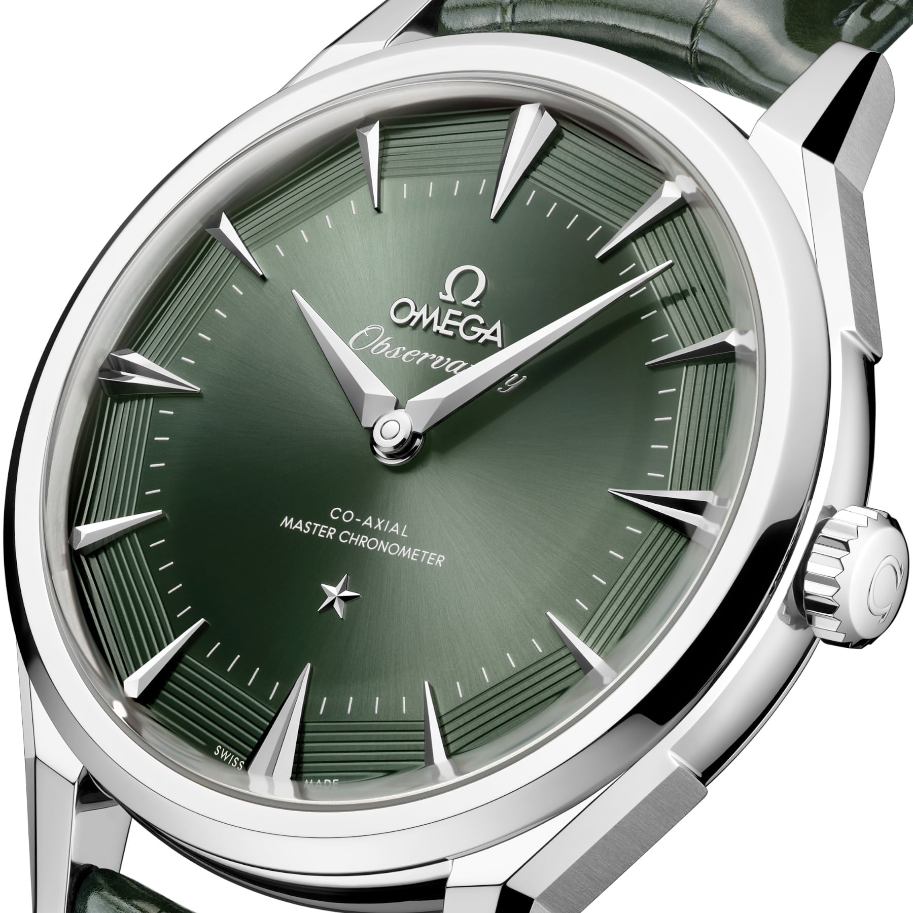 The “Pie-Pan” dial is a reminiscent of the original 1952 Constellation with dodecagonal facets, with applied OMEGA logo and Constellation star. The green dial is presented with sun-brushed centre and opaline facets with 8 embossedgrooves. The revamped kite-form indexes are fully diamond-polished, matched with diamond-polished kite-form hands, crafted from 18K white gold.