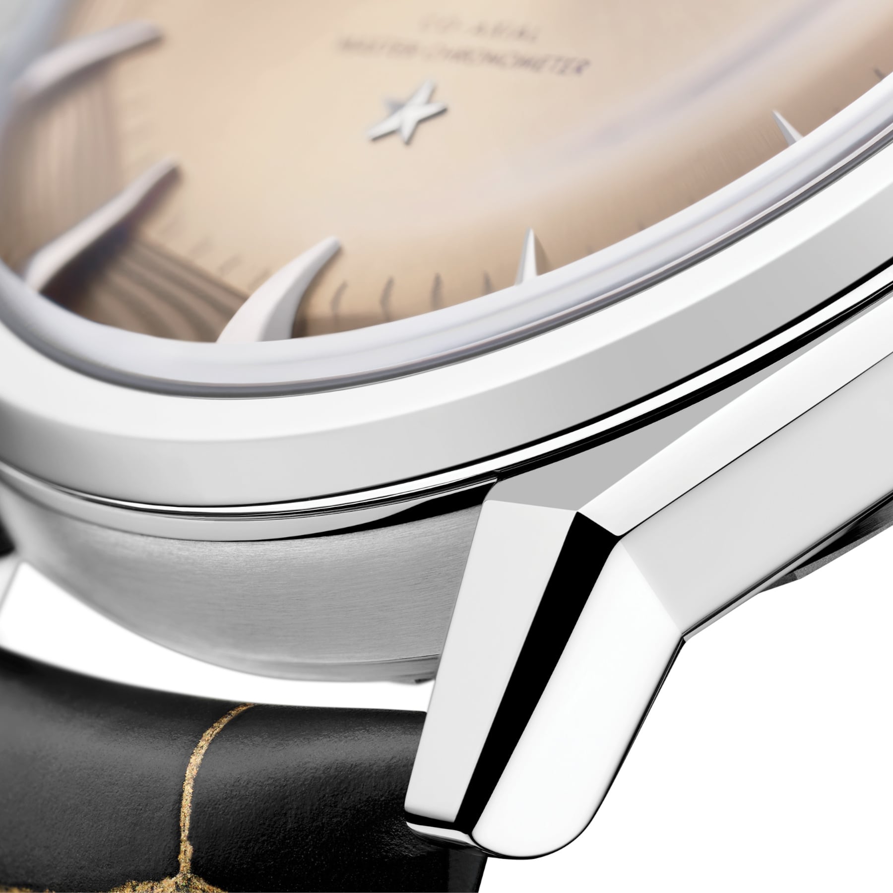This 39.4 mm polished-brushed model in 950 platinum-gold features the distinctive faceted “dog-leg” lugs accompanied by a bezel with clear-cut facets. It is presented on a dark grey leather strap with golden scalelines on polished buckle.