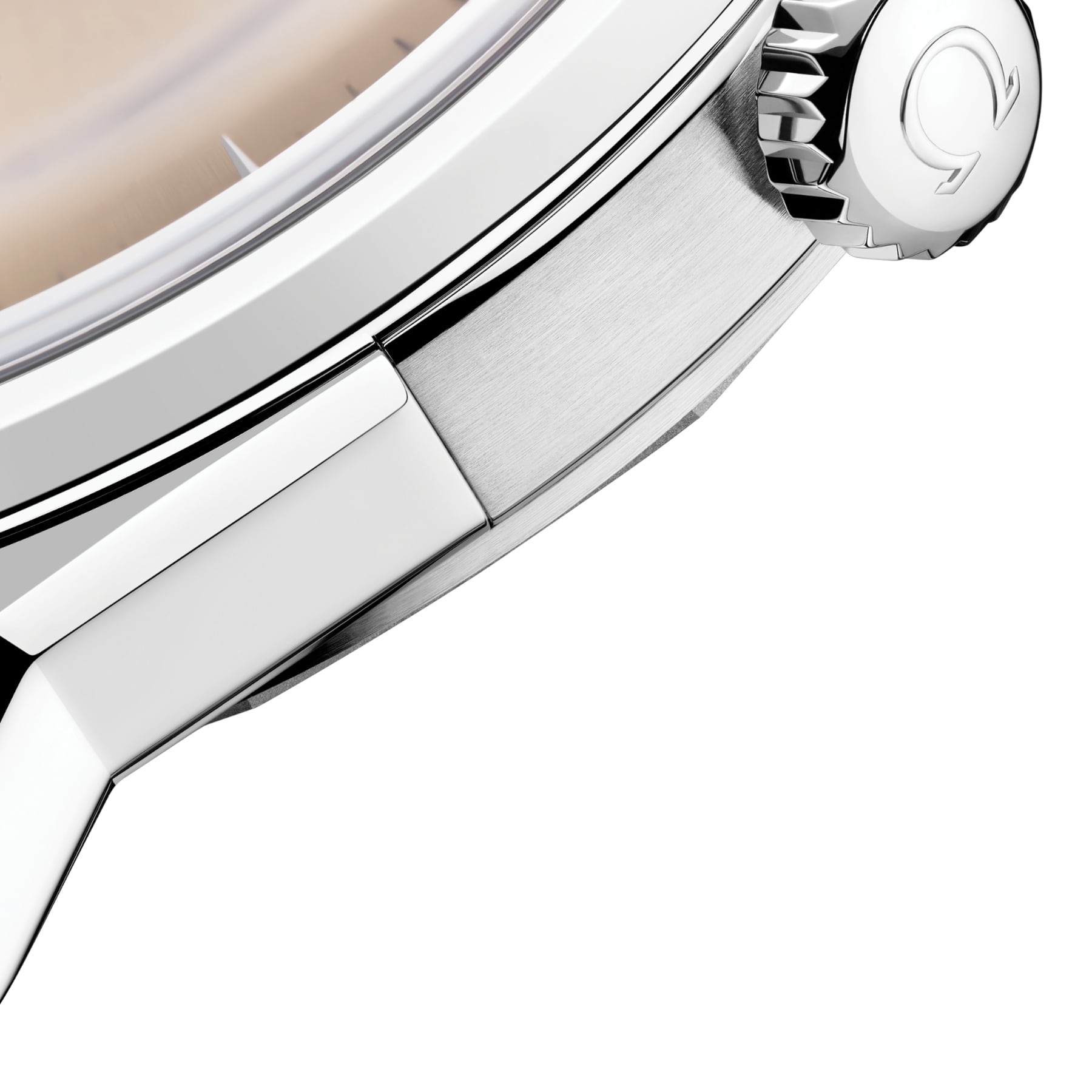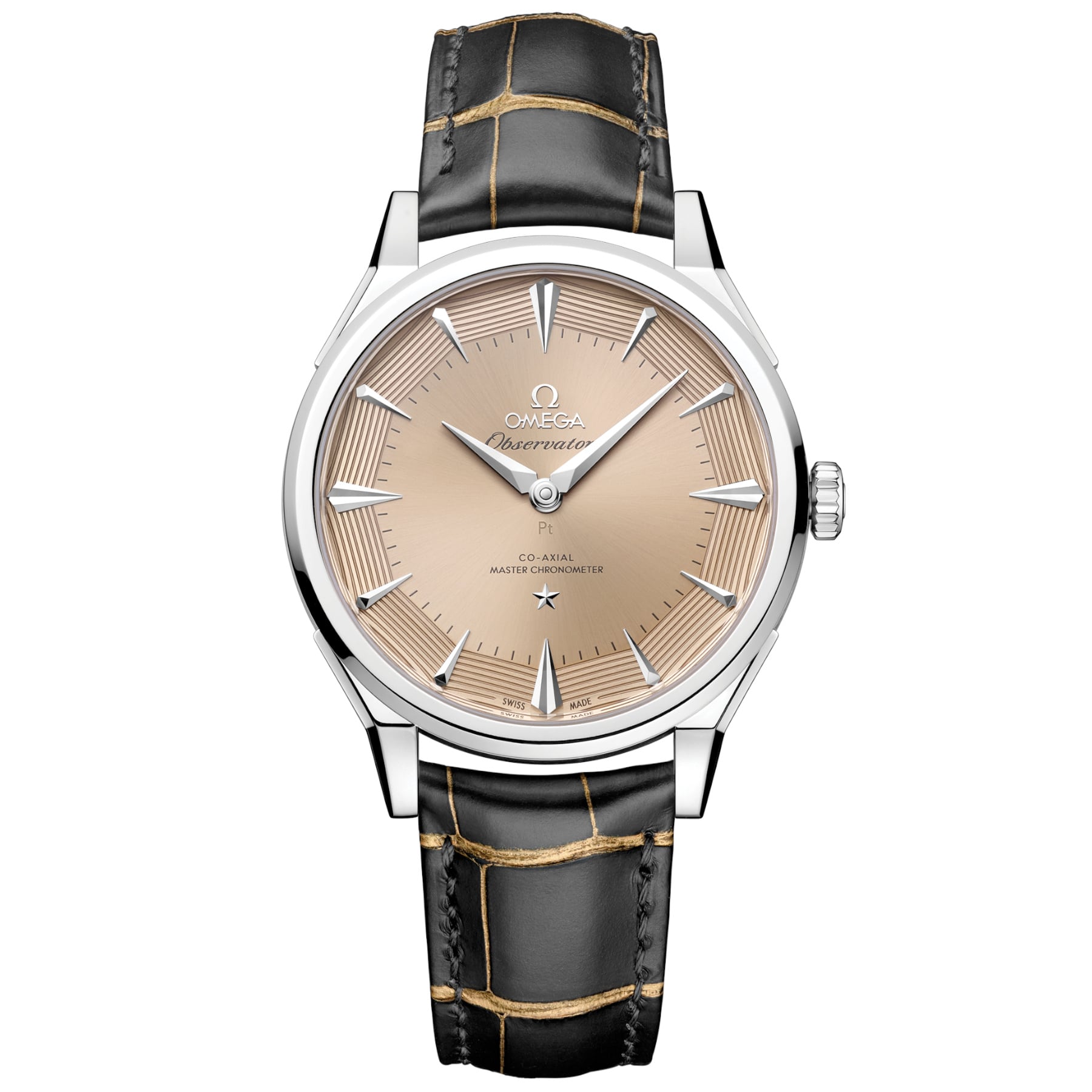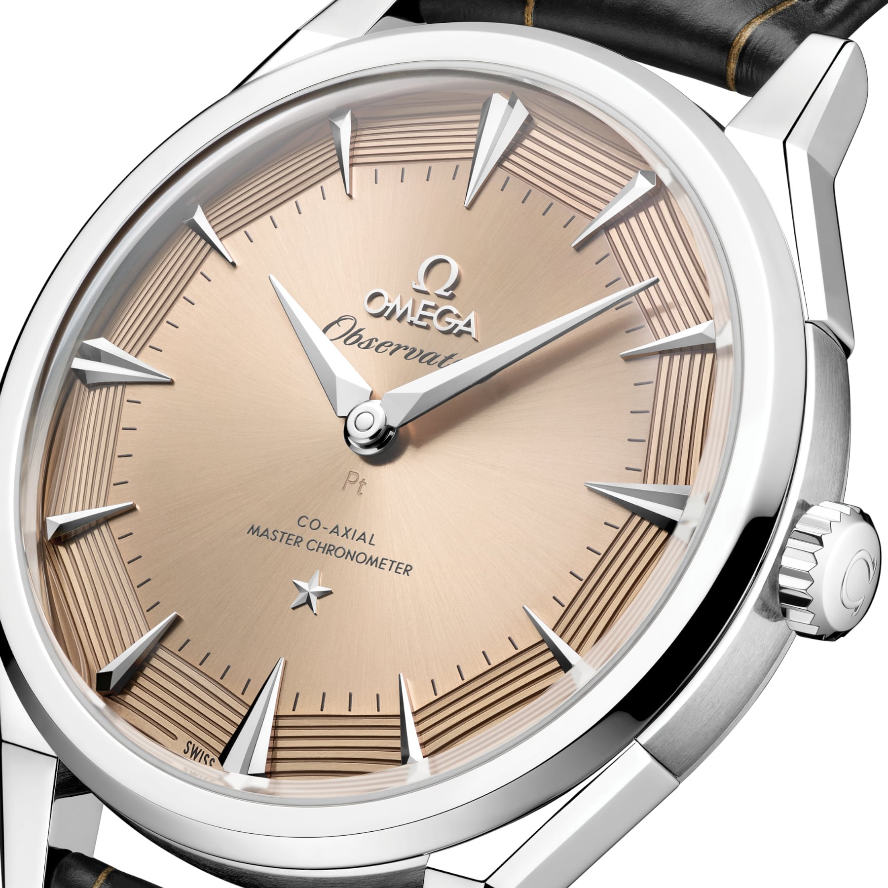 The “Pie-Pan” dial is a reminiscent of the original 1952 Constellation with dodecagonal facets, with applied OMEGA logo and Constellation star. The 950 platinum-gold PVD coated with platinum in yellowish hue dial is presented with sun-brushed centre and brushed facets with 8 matte hand-guillochégrooves. The revamped kite-form indexes are fully diamond-polished, matched with diamond-polished kite-form hands, crafted from 18K white gold PVD coated with 950 platinum-gold.