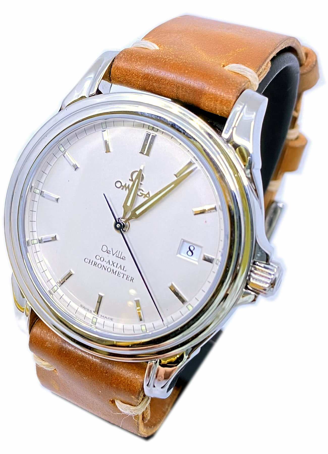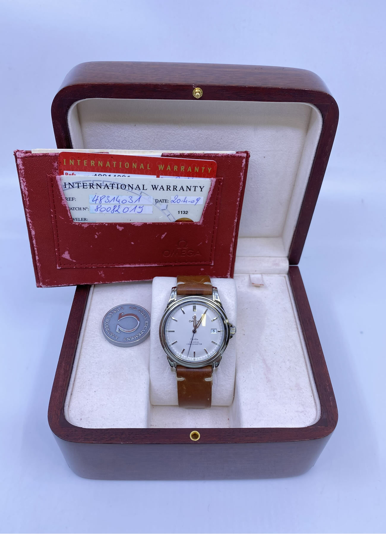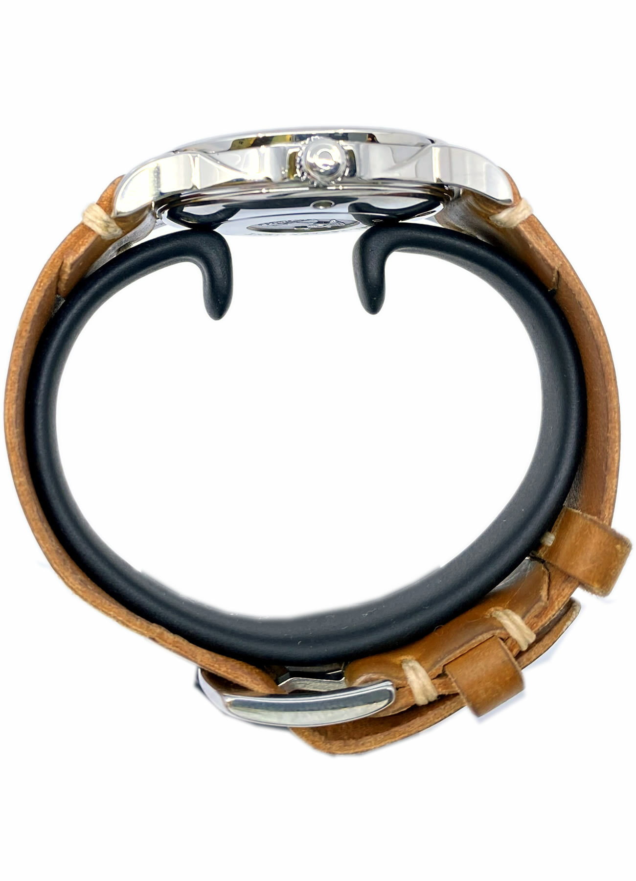 - This timepiece features a 37.5mm steel case paired with a high quality leather strap. It showcases a distinctive white dial and is powered by a precise automatic winding movement. The watch is designed with a water resistance of up to 100m.